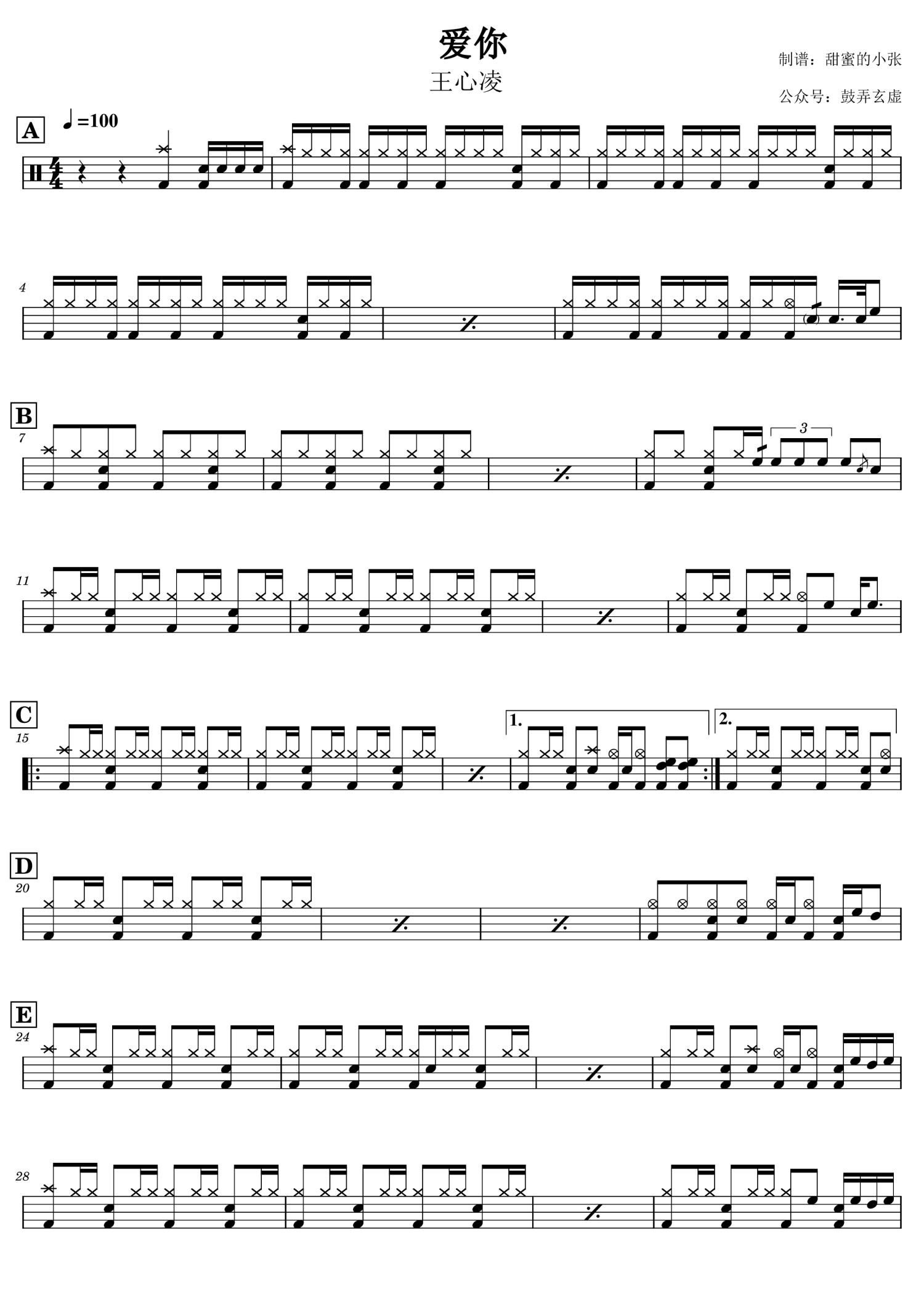 曲谱介绍: 王心凌《爱你》架子鼓谱,鼓弄玄虚编配出品,共有3张高清图谱。