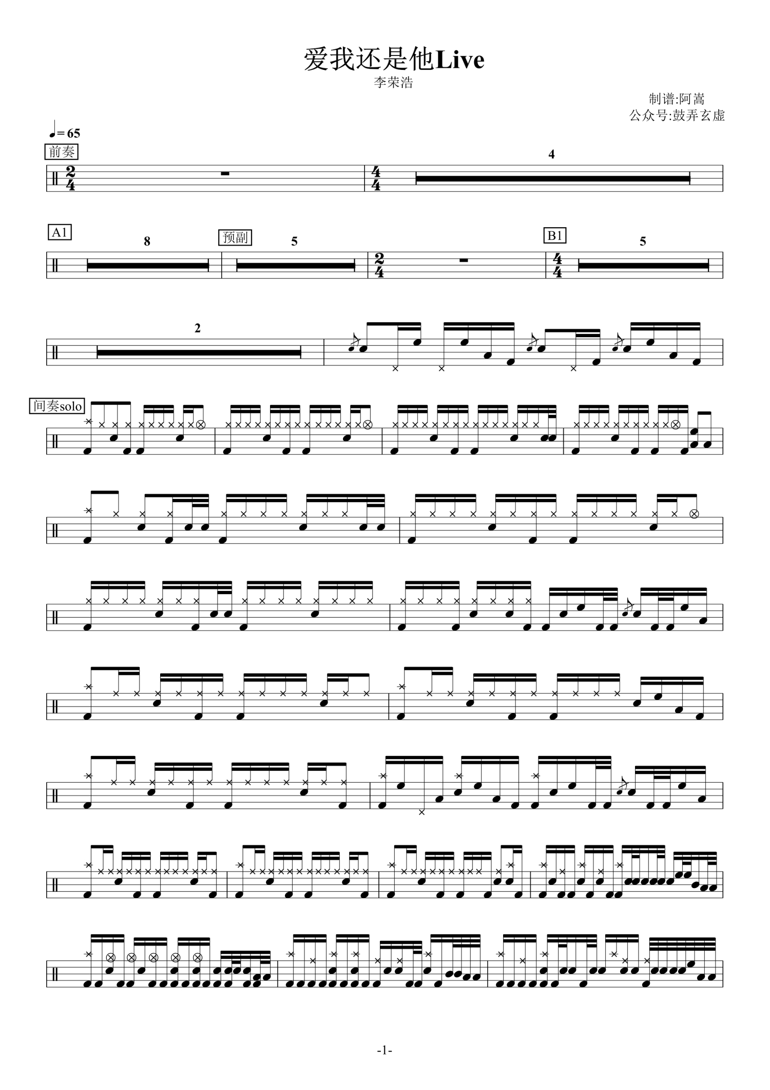 • 爱我还是他鼓谱 - 李荣浩 - 架子鼓谱 - 中国好声音Live版第1张