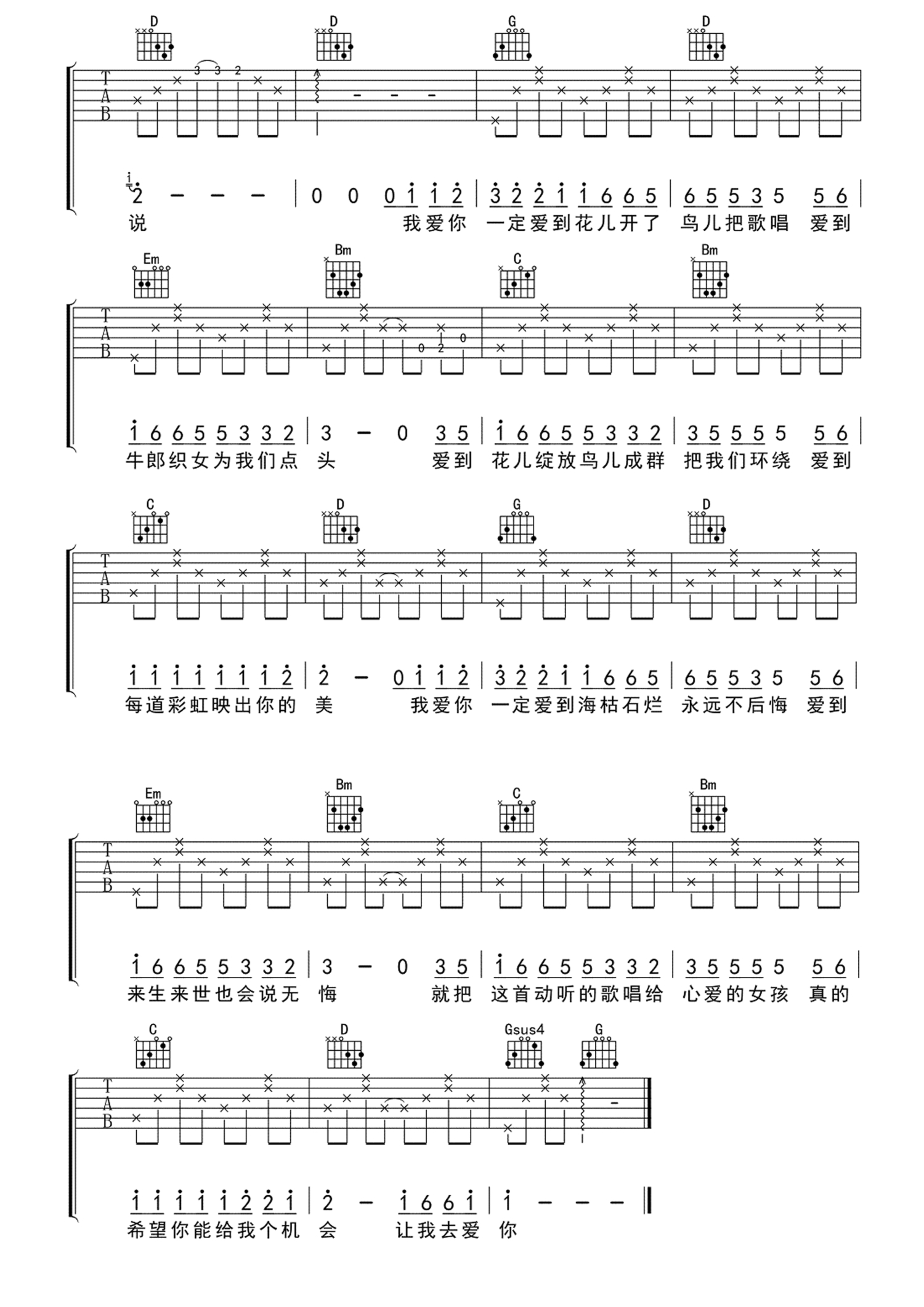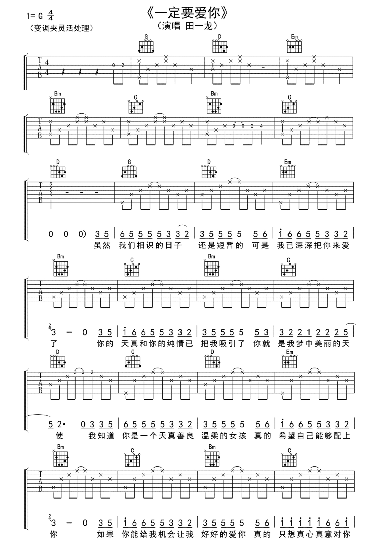 一定要爱你吉他谱 - 田一龙 - G调吉他弹唱谱
