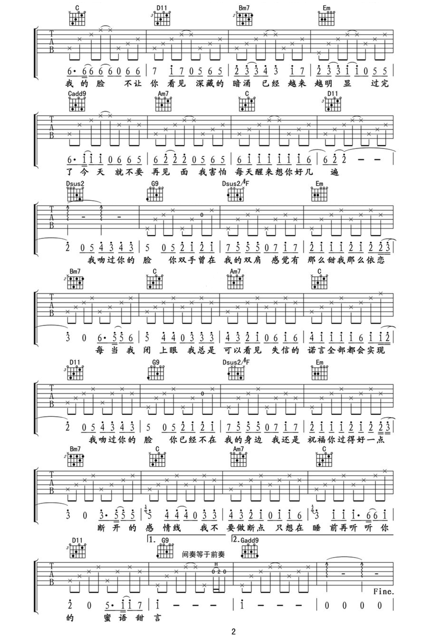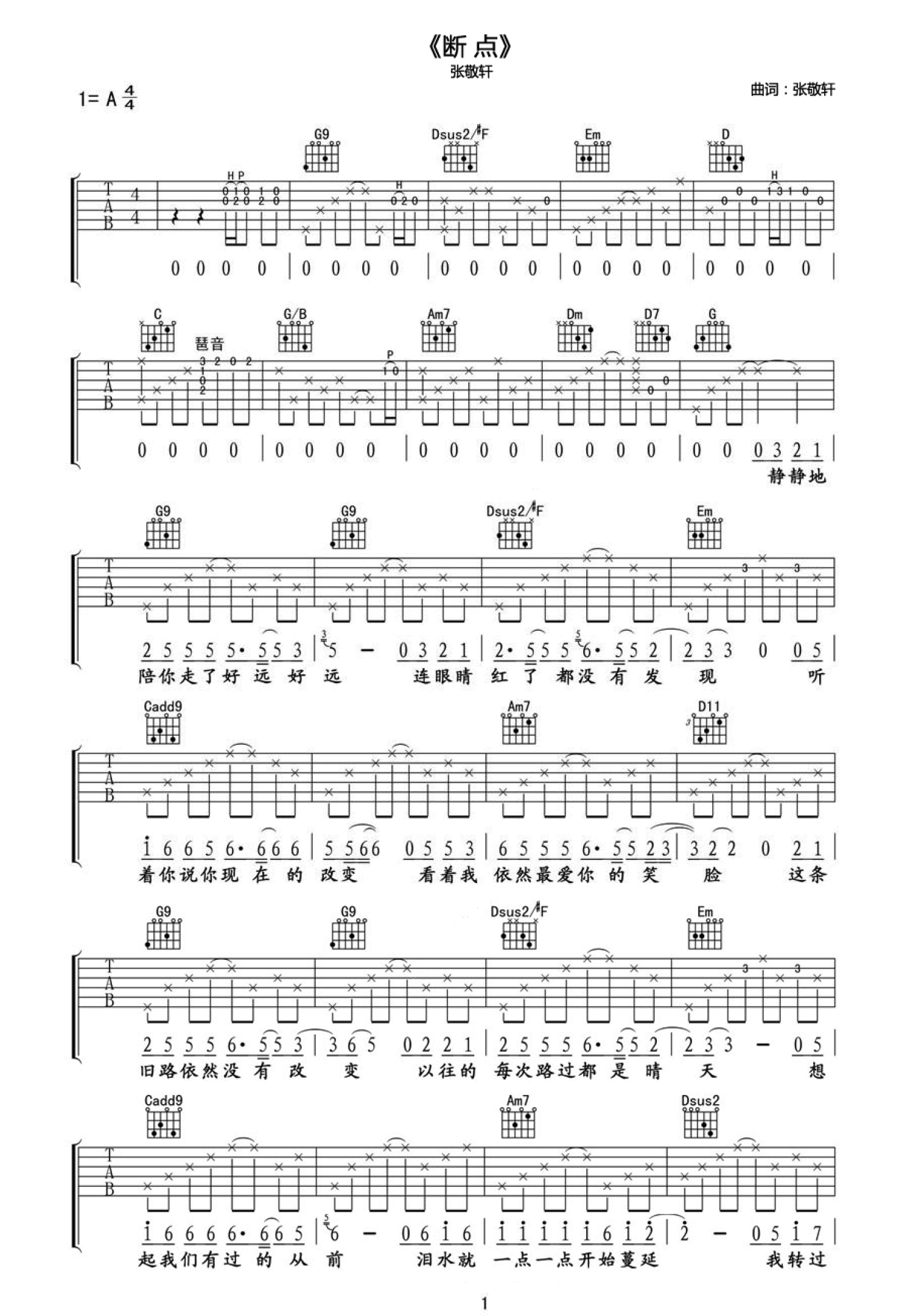 曲谱介绍: 张敬轩断点吉他谱六线谱