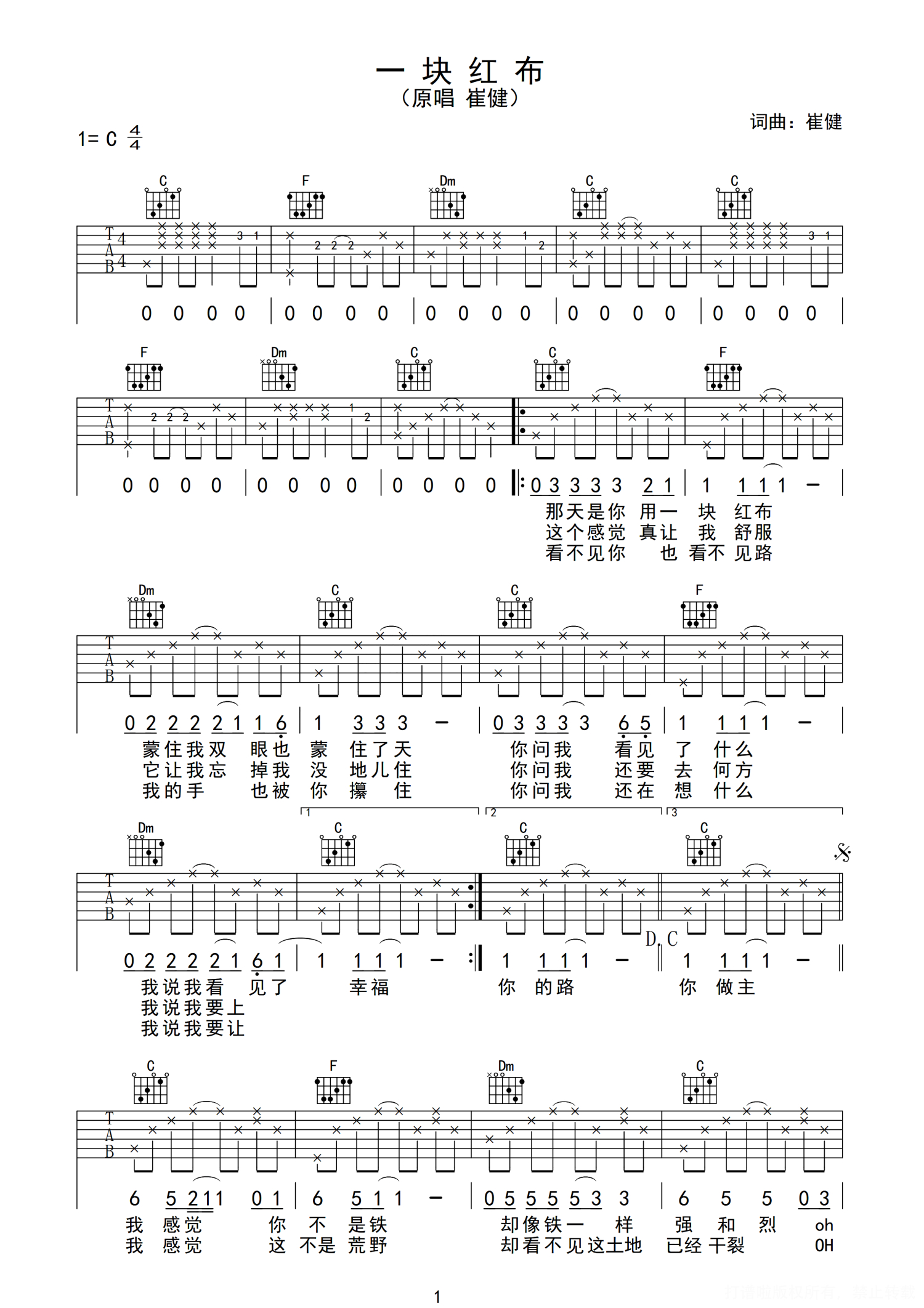 一块红布吉他谱 - 崔健 - C调吉他弹唱谱