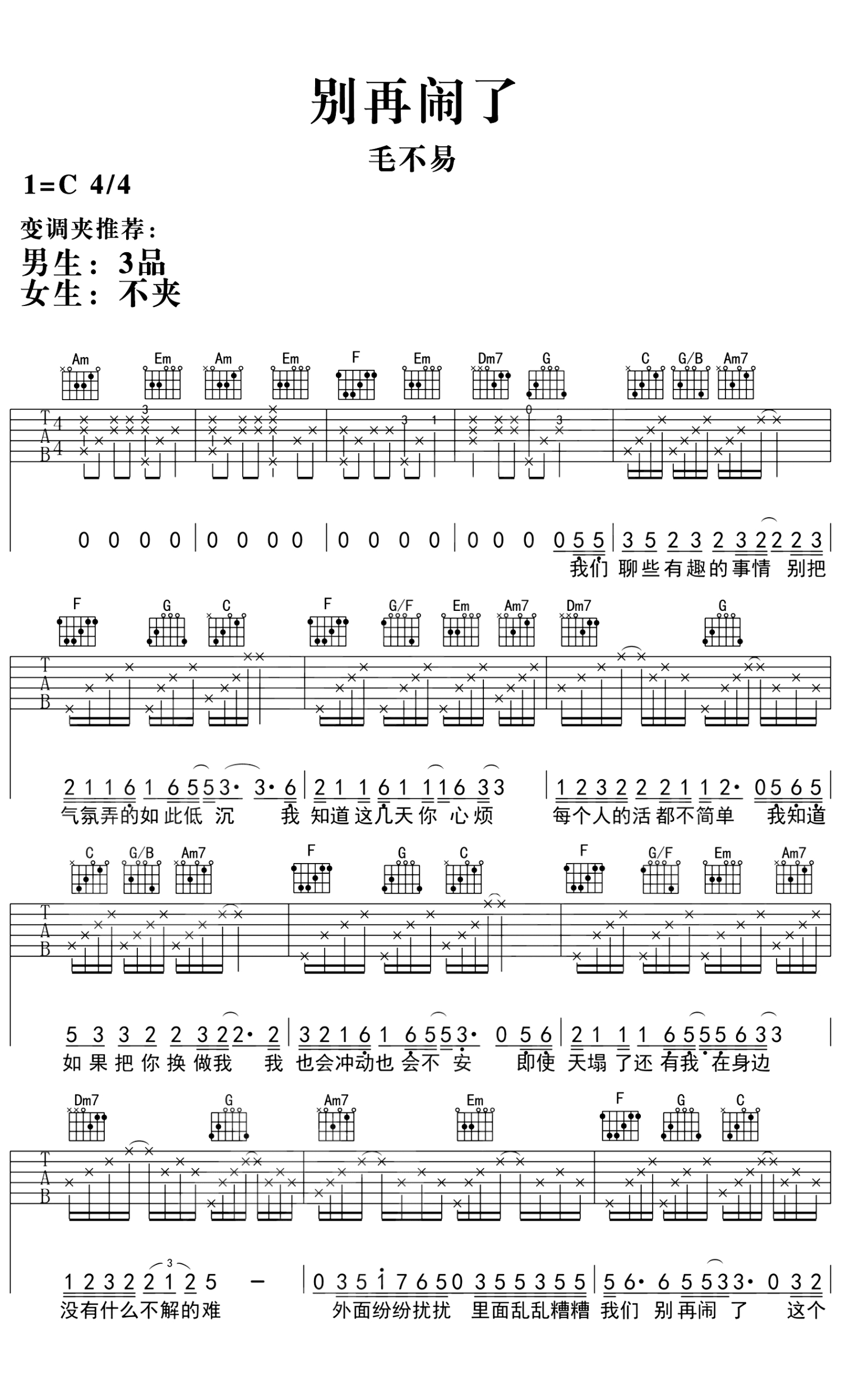 别再闹了吉他谱 - 毛不易 - C调吉他弹唱谱