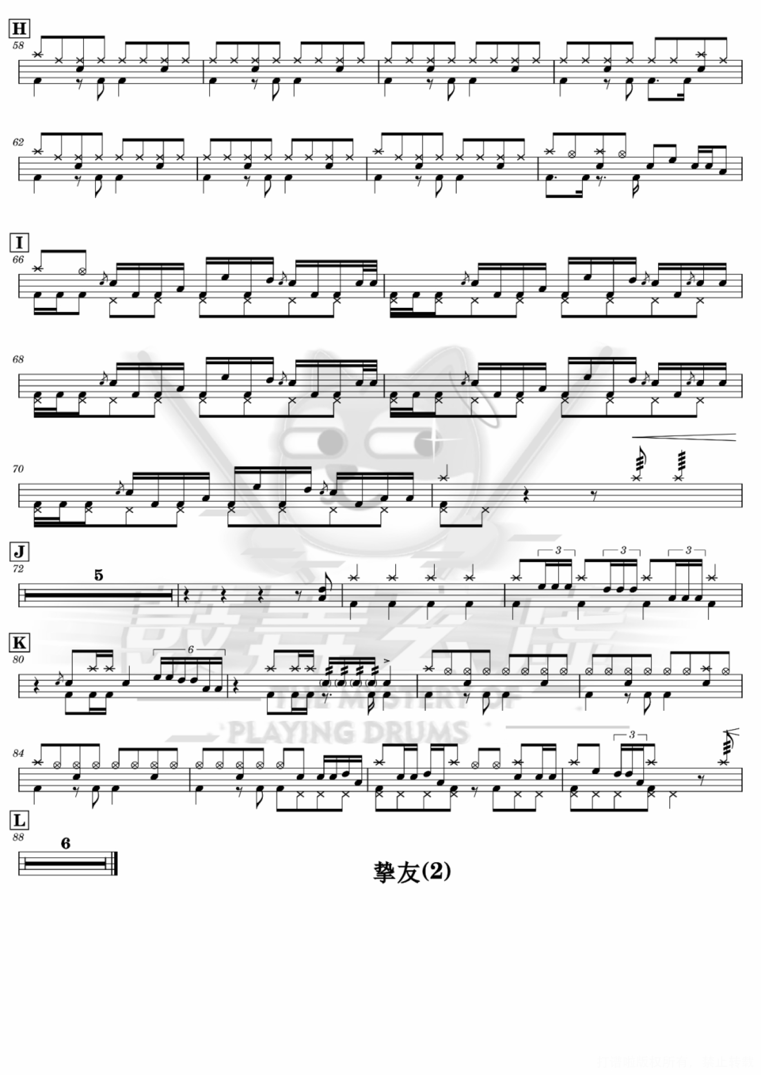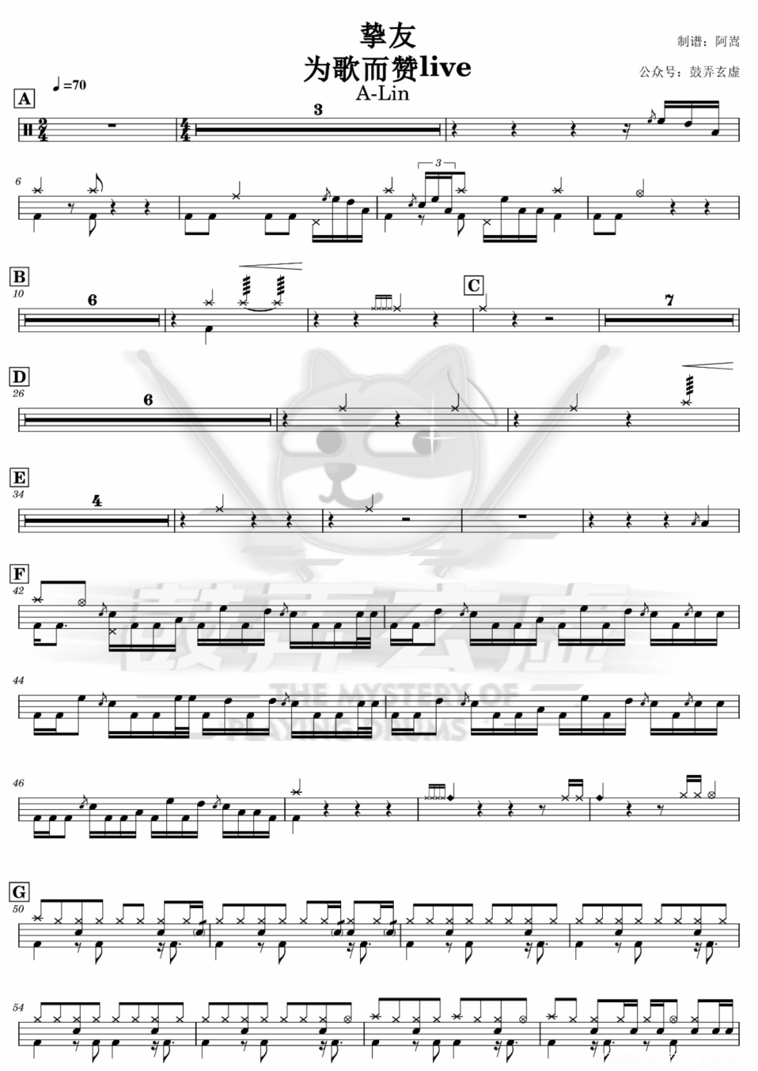 曲谱介绍: A-Lin《挚友》架子鼓谱,鼓弄玄虚编配出品,共有2张高清图谱,免翻页排版设计。