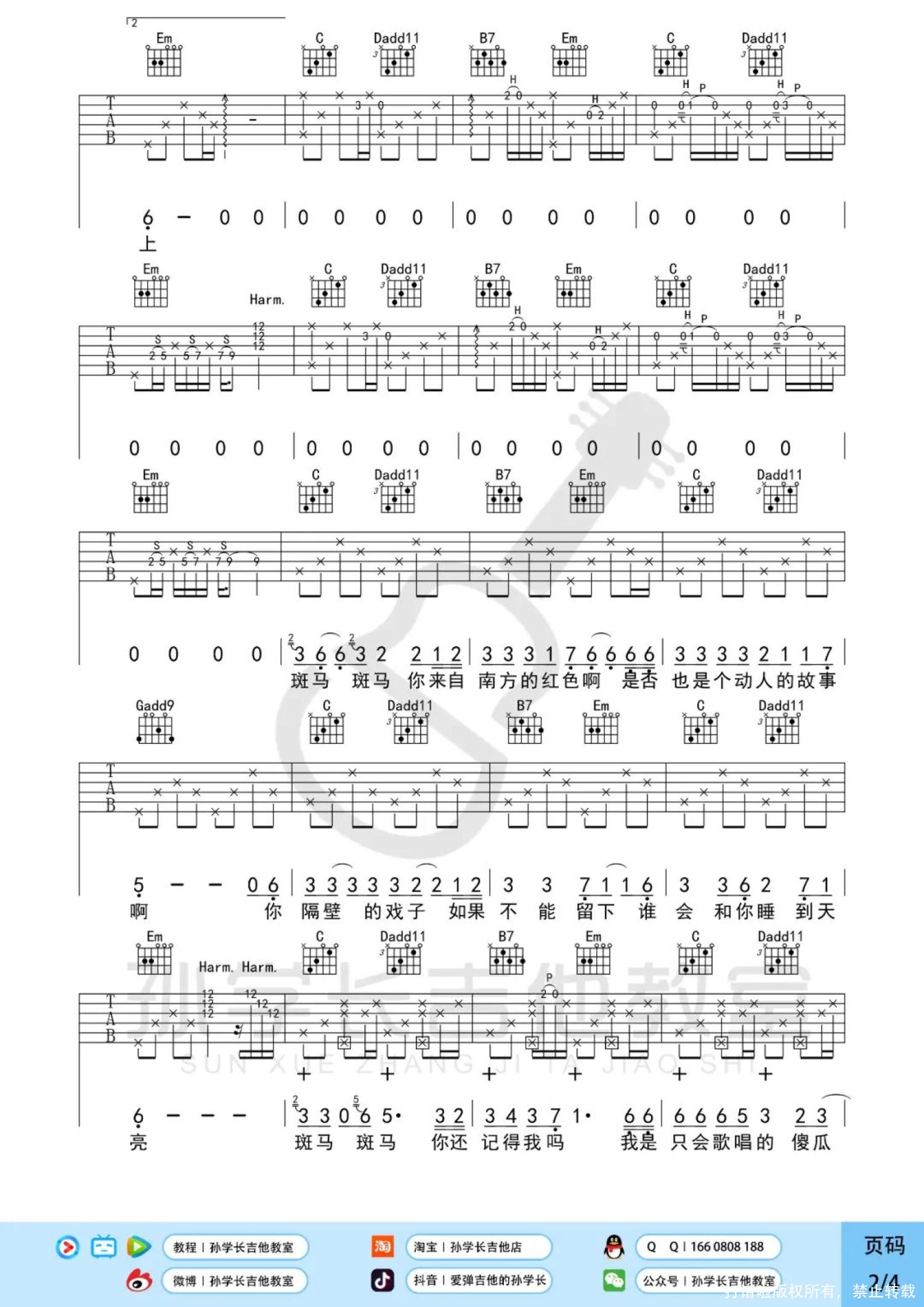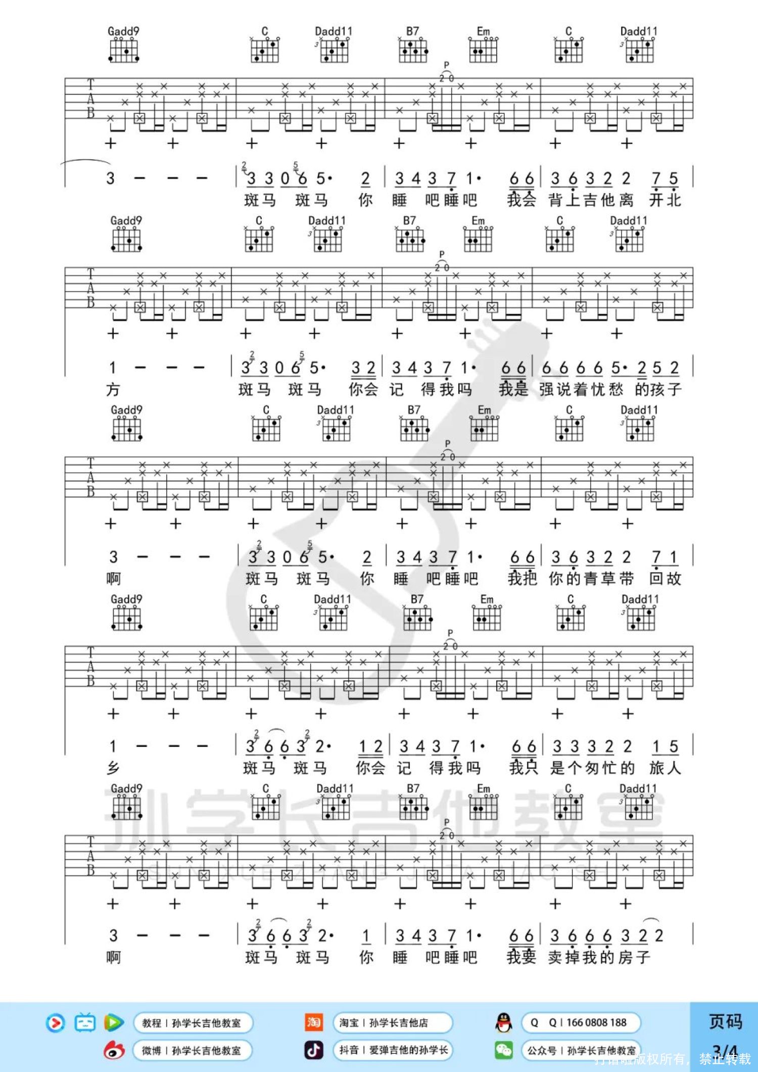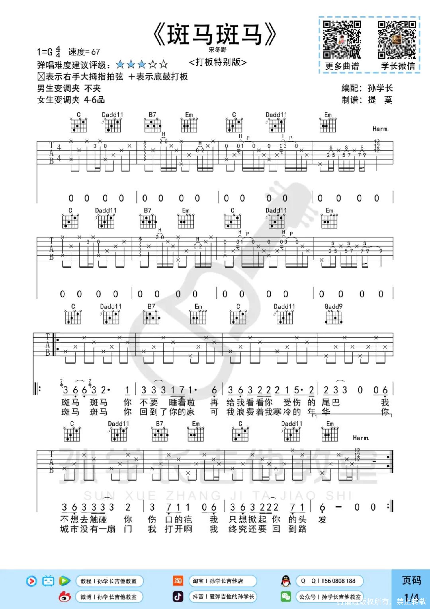 曲谱介绍: 宋冬野《斑马斑马》吉他弹唱谱,孙学长吉他教室编配出品,共有4张高清图谱。