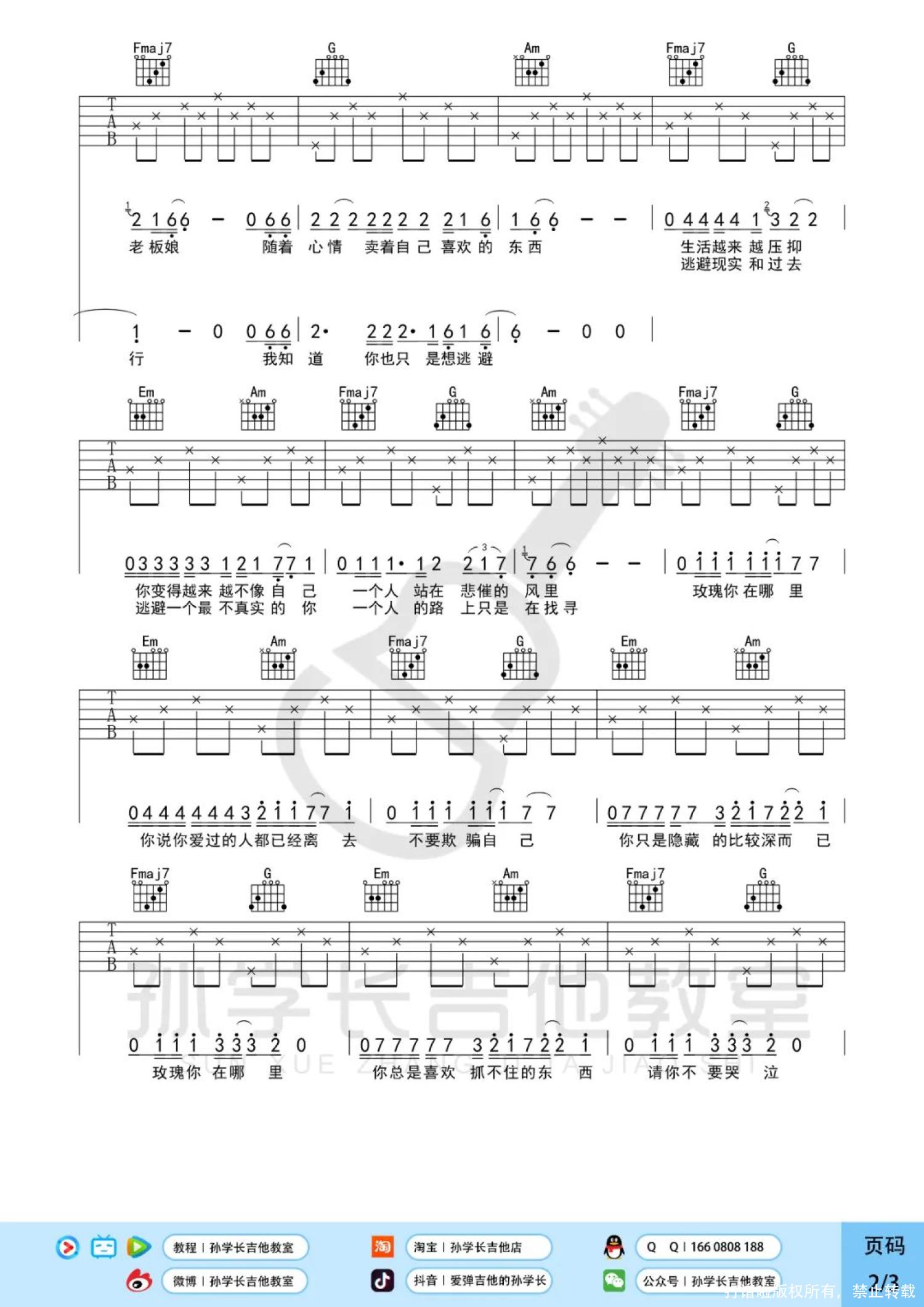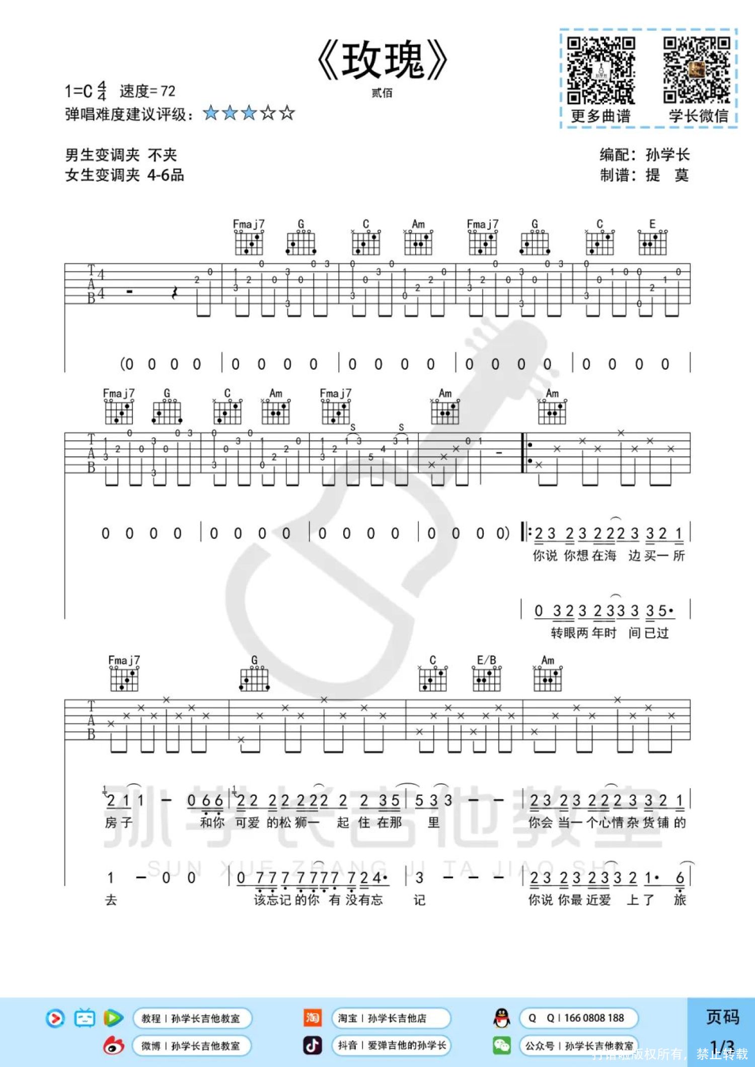 曲谱介绍: 贰佰《玫瑰》吉他弹唱谱,孙学长吉他教室编配出品,共有3张高清图谱。