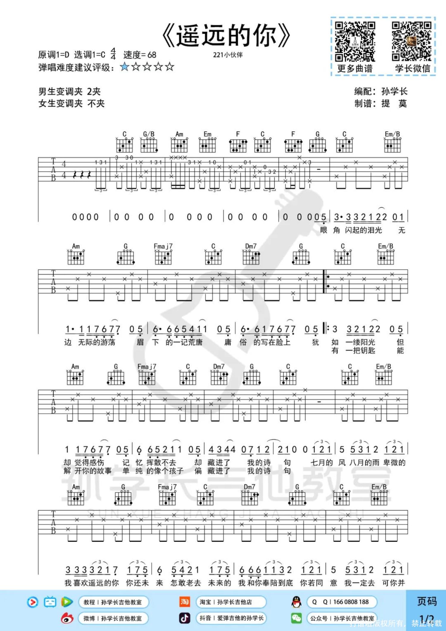曲谱介绍: 221小伙伴《遥远的你》吉他弹唱谱,孙学长吉他教室编配出品,共有2张高清图谱,免翻页排版设计。