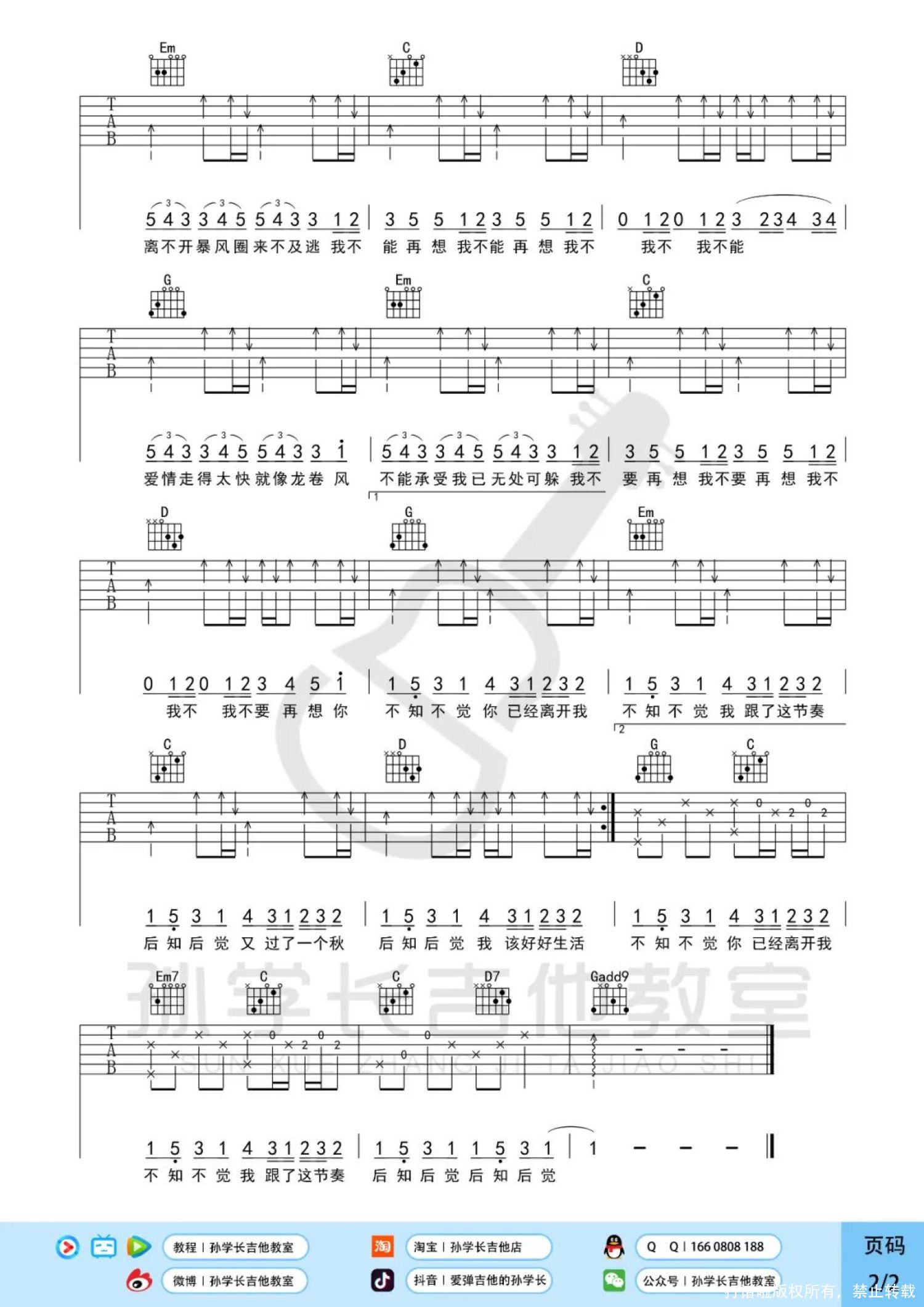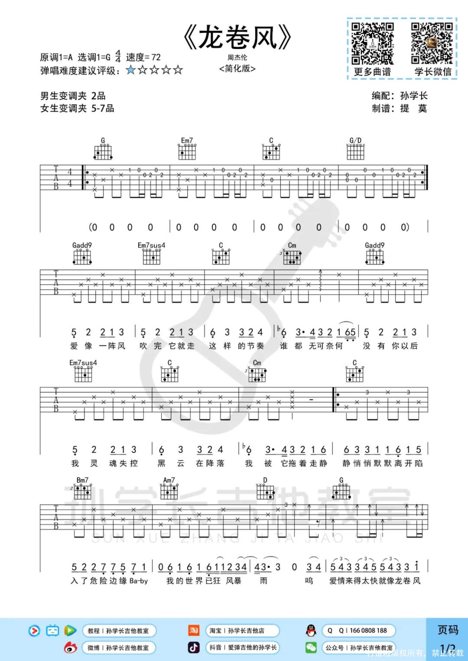 曲谱介绍: 周杰伦《龙卷风》吉他弹唱谱,孙学长吉他教室编配出品,共有2张高清图谱,免翻页排版设计。