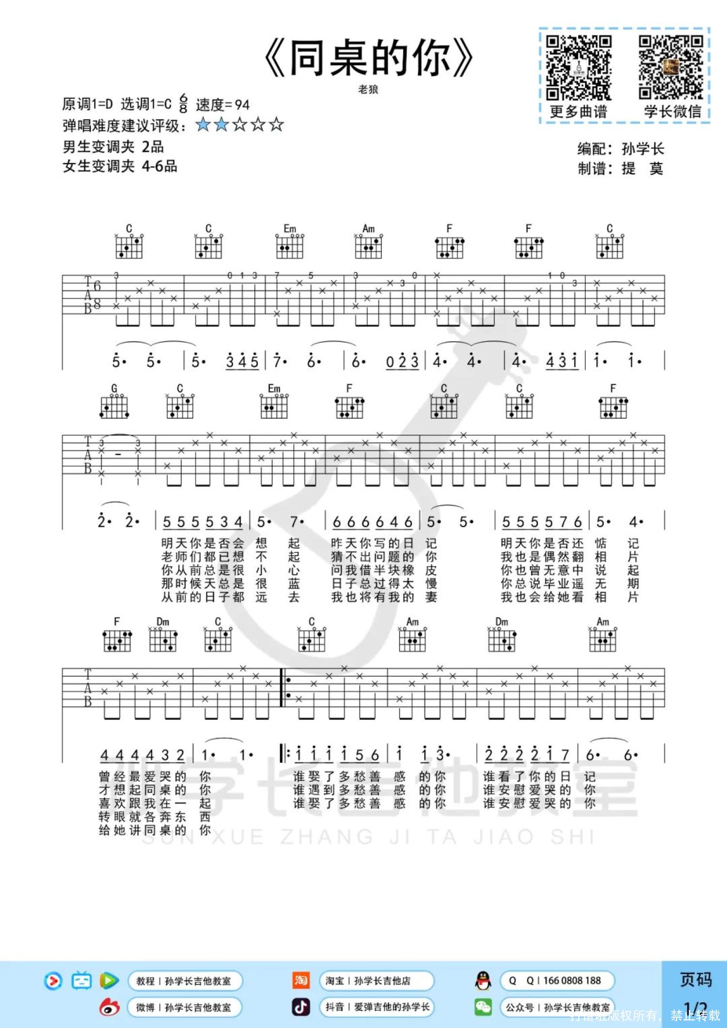 曲谱介绍: 老狼《同桌的你》吉他弹唱谱,孙学长吉他教室编配出品,共有2张高清图谱,免翻页排版设计。