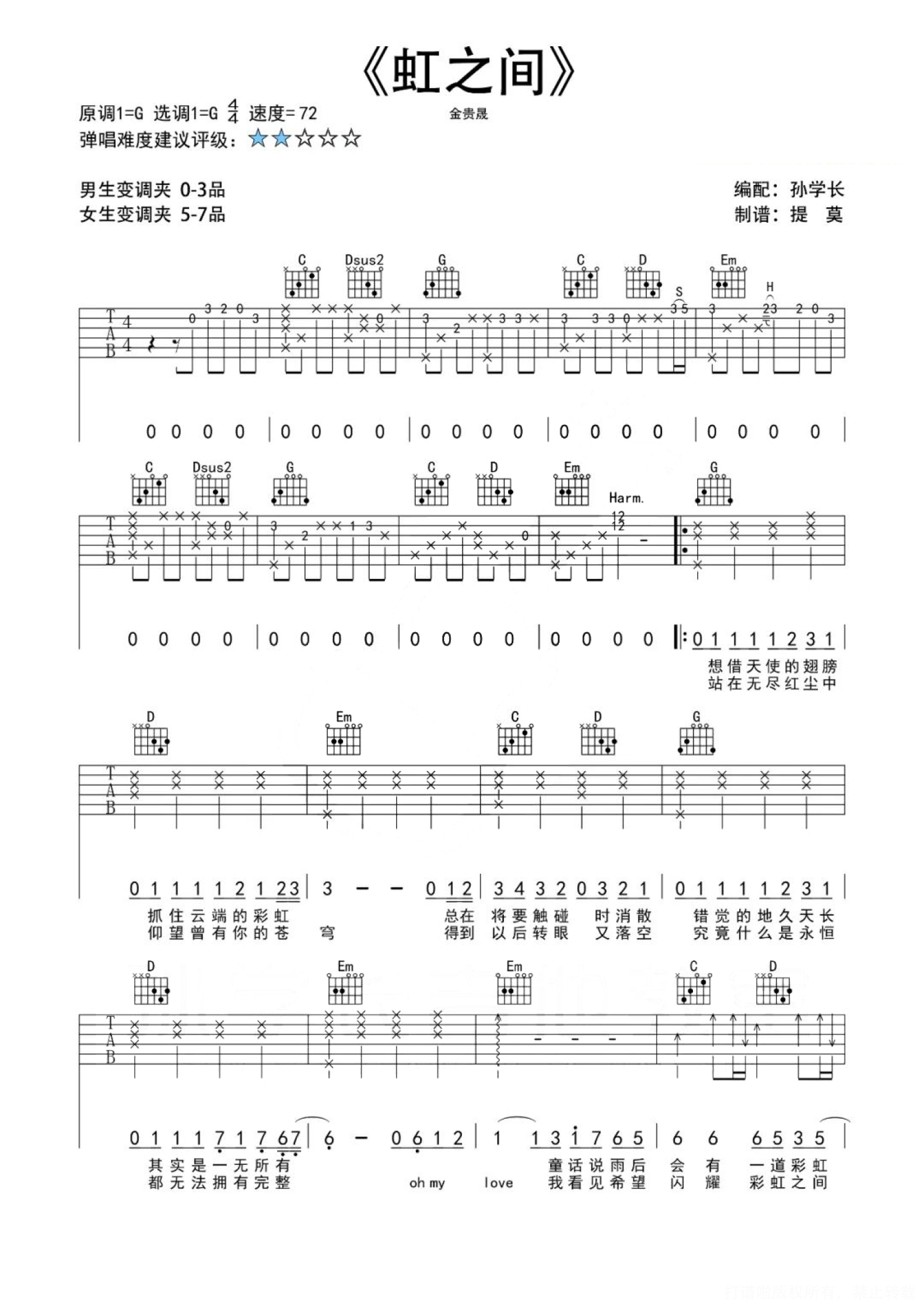 曲谱介绍: 金贵晟《虹之间》吉他弹唱谱,孙学长吉他教室编配出品,共有2张高清图谱,免翻页排版设计。