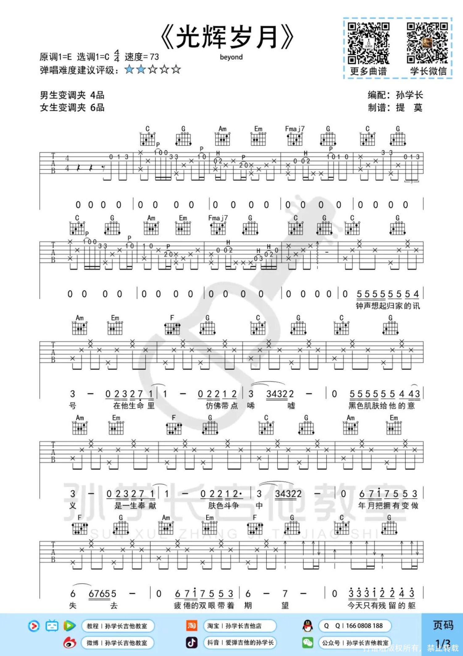 曲谱介绍: beyond乐队《光辉岁月》吉他弹唱谱,孙学长吉他教室编配出品,共有3张高清图谱。