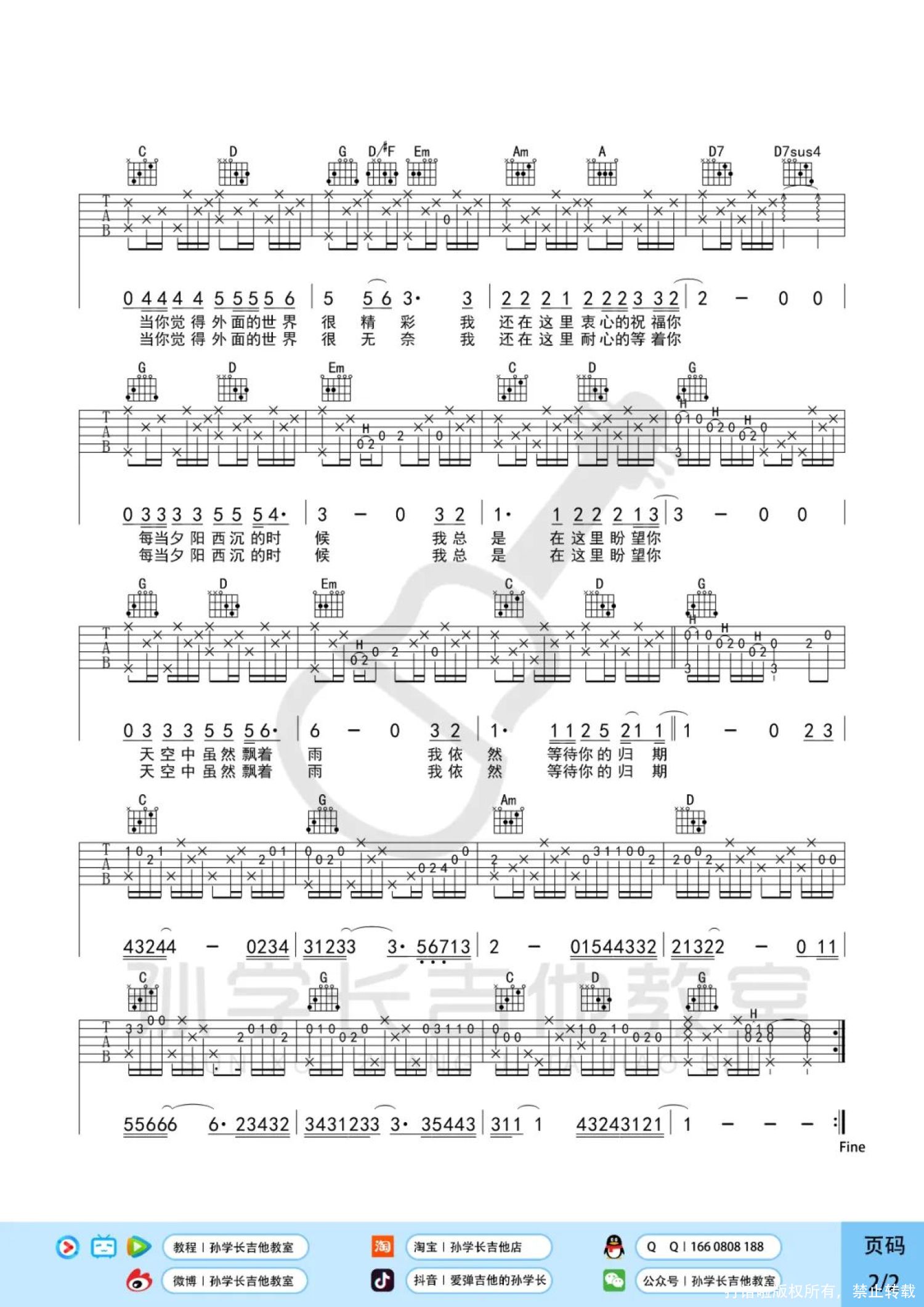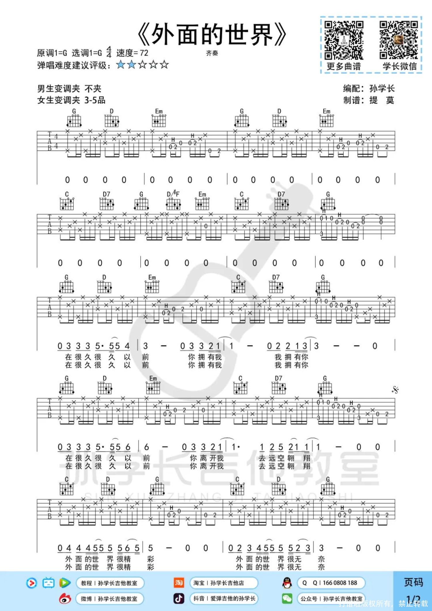曲谱介绍: 齐秦《外面的世界》吉他弹唱谱,孙学长吉他教室编配出品,共有2张高清图谱,免翻页排版设计。
