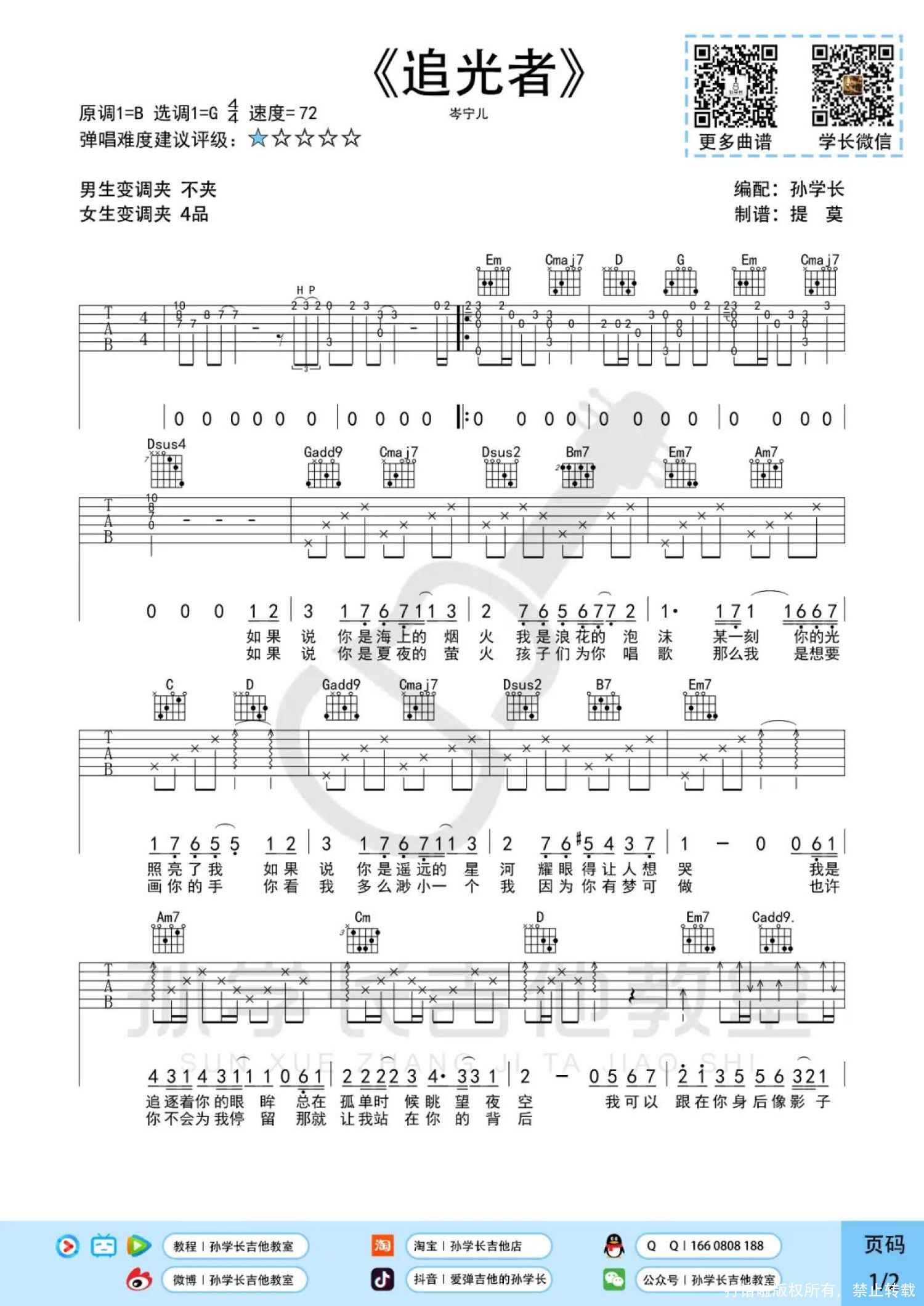 曲谱介绍: 岑宁儿《追光者》吉他弹唱谱,孙学长吉他教室编配出品,共有2张高清图谱,免翻页排版设计。