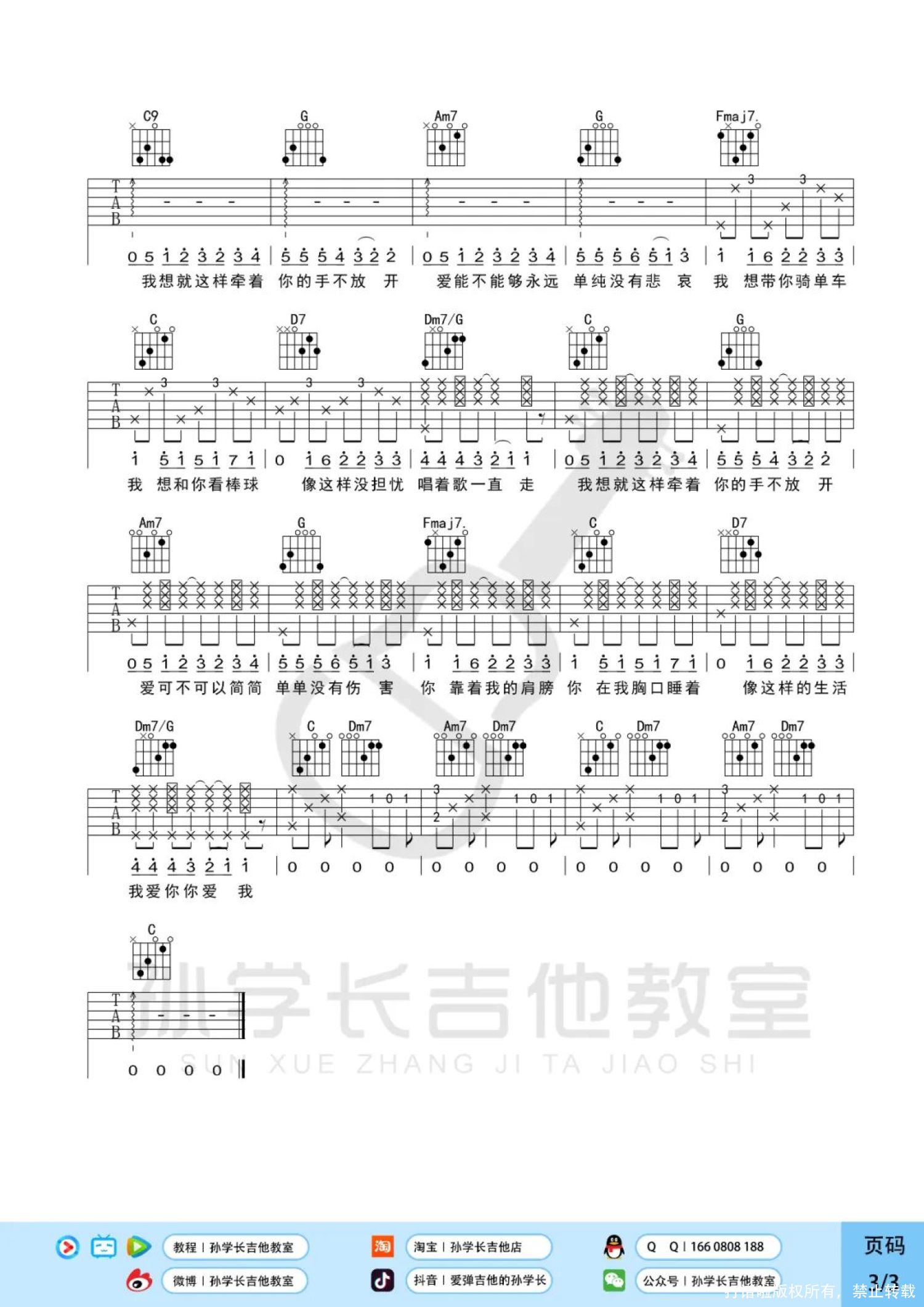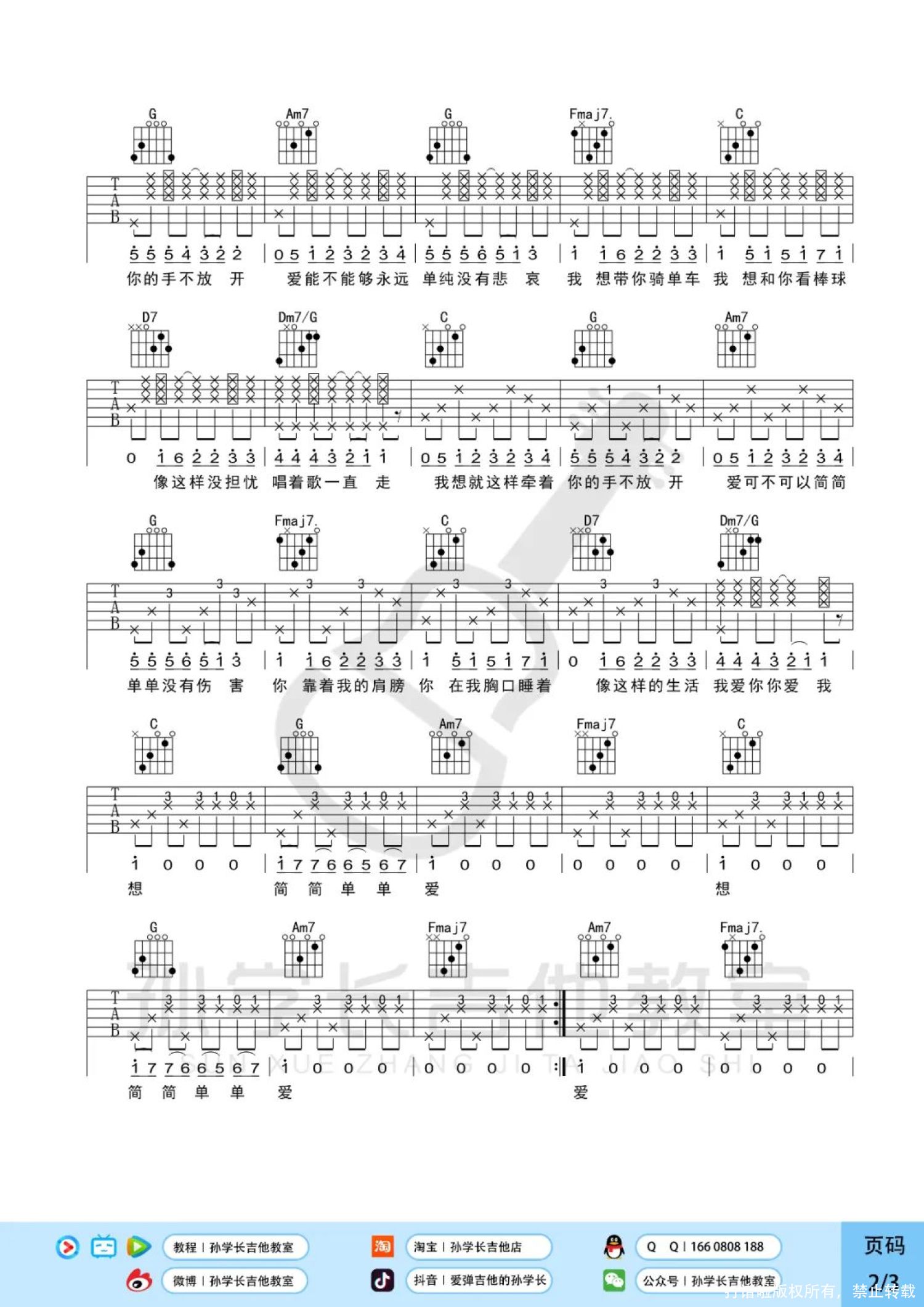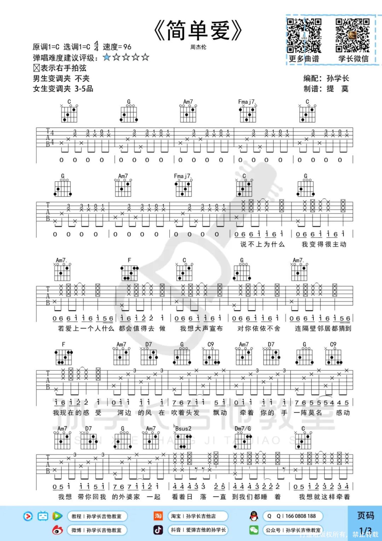 曲谱介绍: 周杰伦《简单爱》吉他弹唱谱,孙学长吉他教室编配出品,共有3张高清图谱。