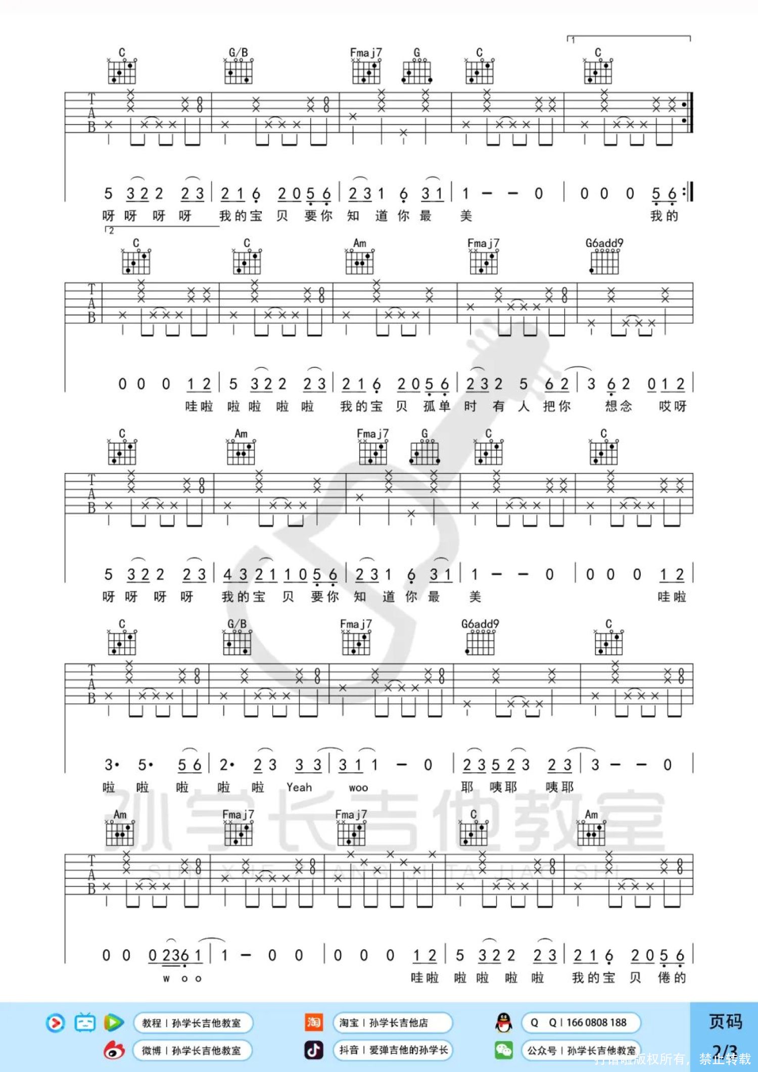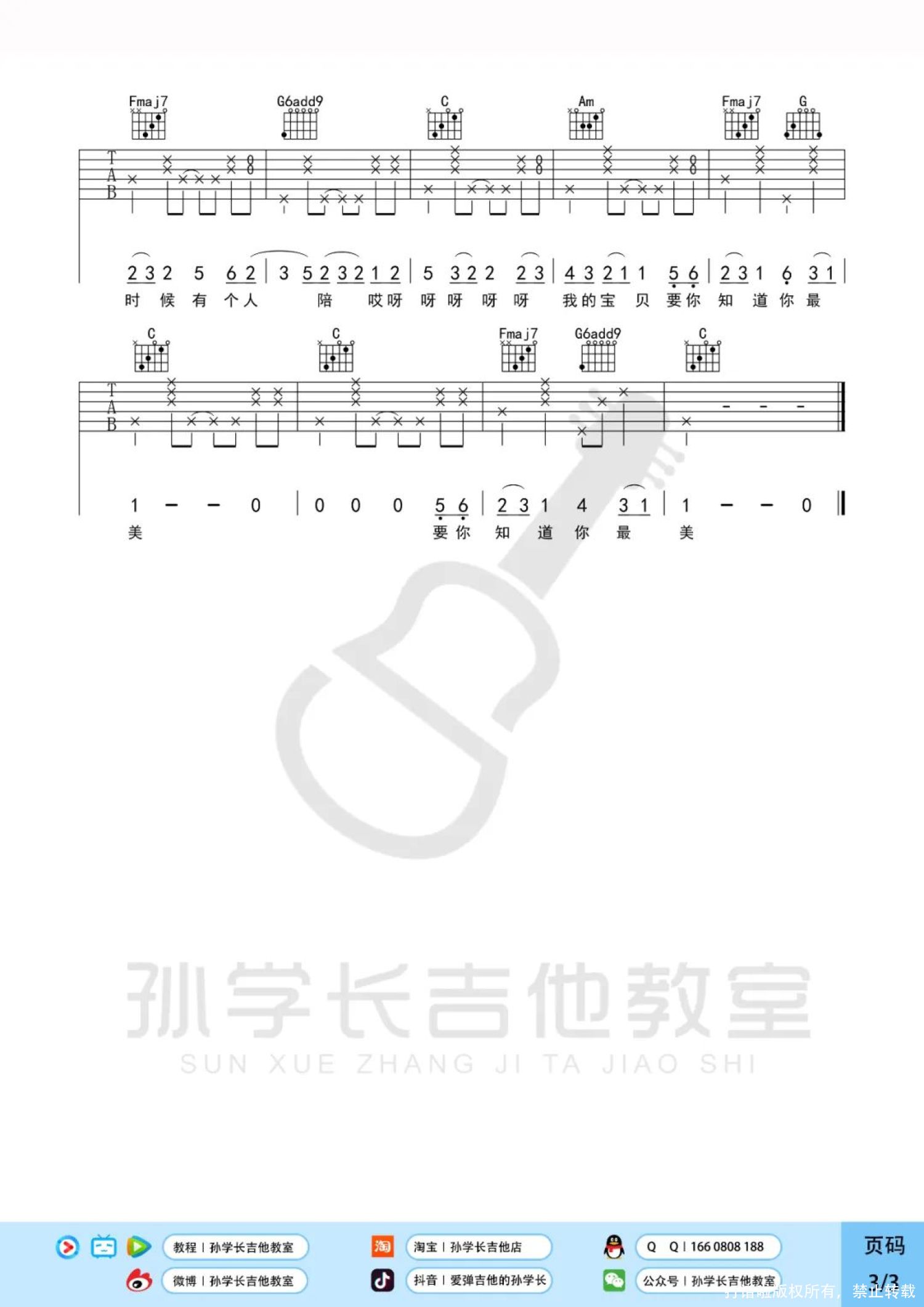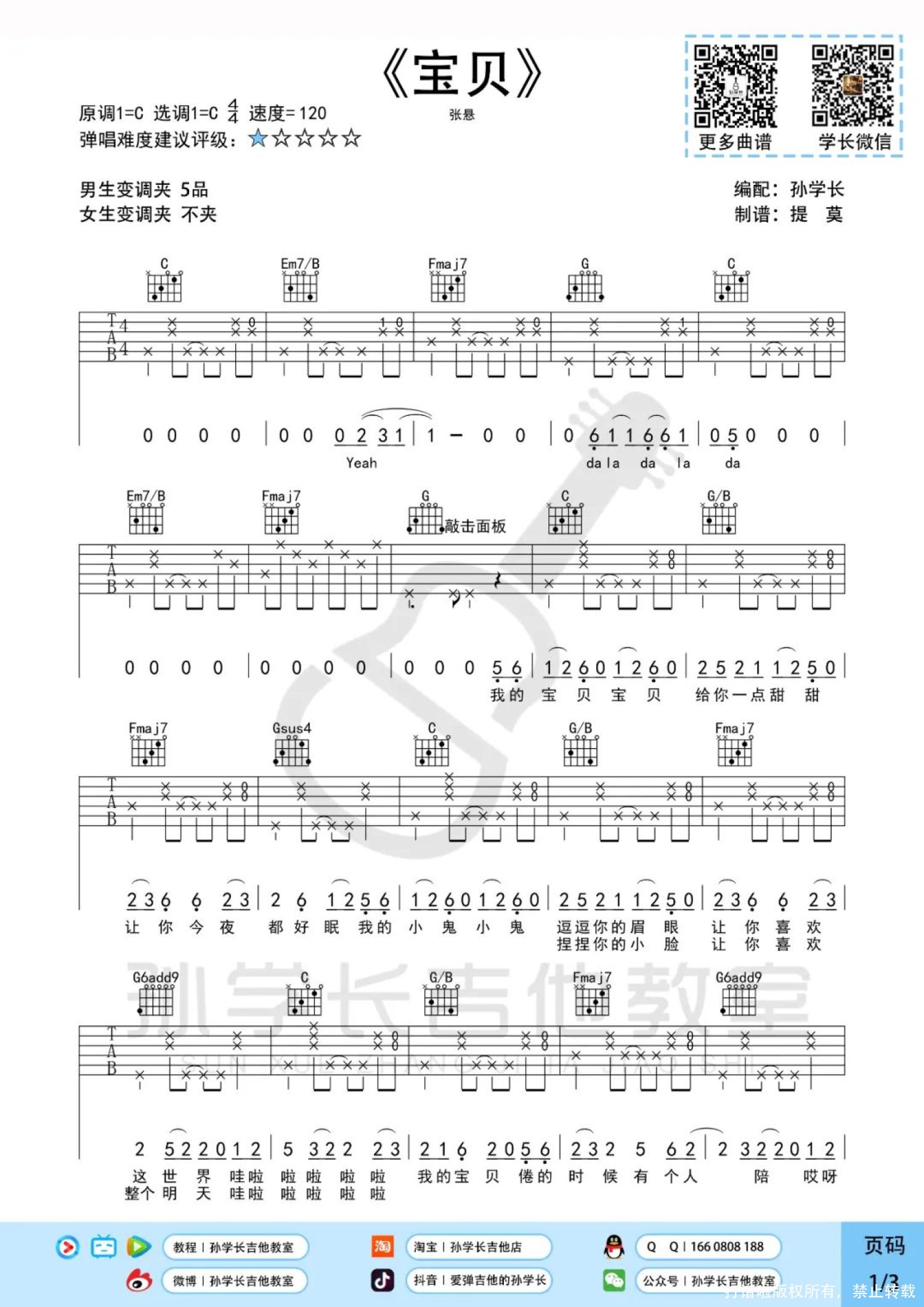 曲谱介绍: 张悬《宝贝》吉他弹唱谱,孙学长吉他教室编配出品,共有3张高清图谱。
