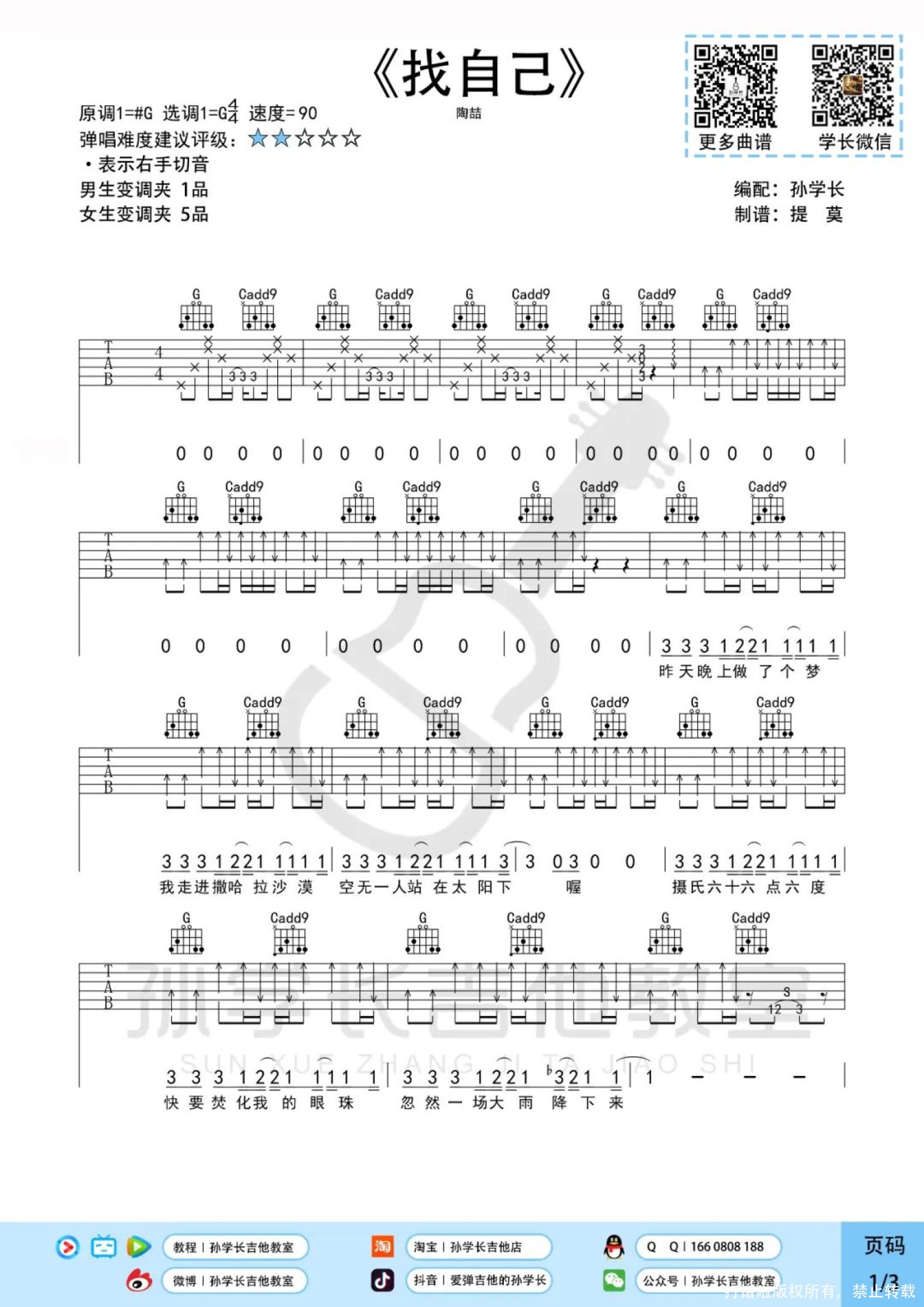 曲谱介绍: 陶喆《找自己》吉他弹唱谱,孙学长吉他教室编配出品,共有3张高清图谱。