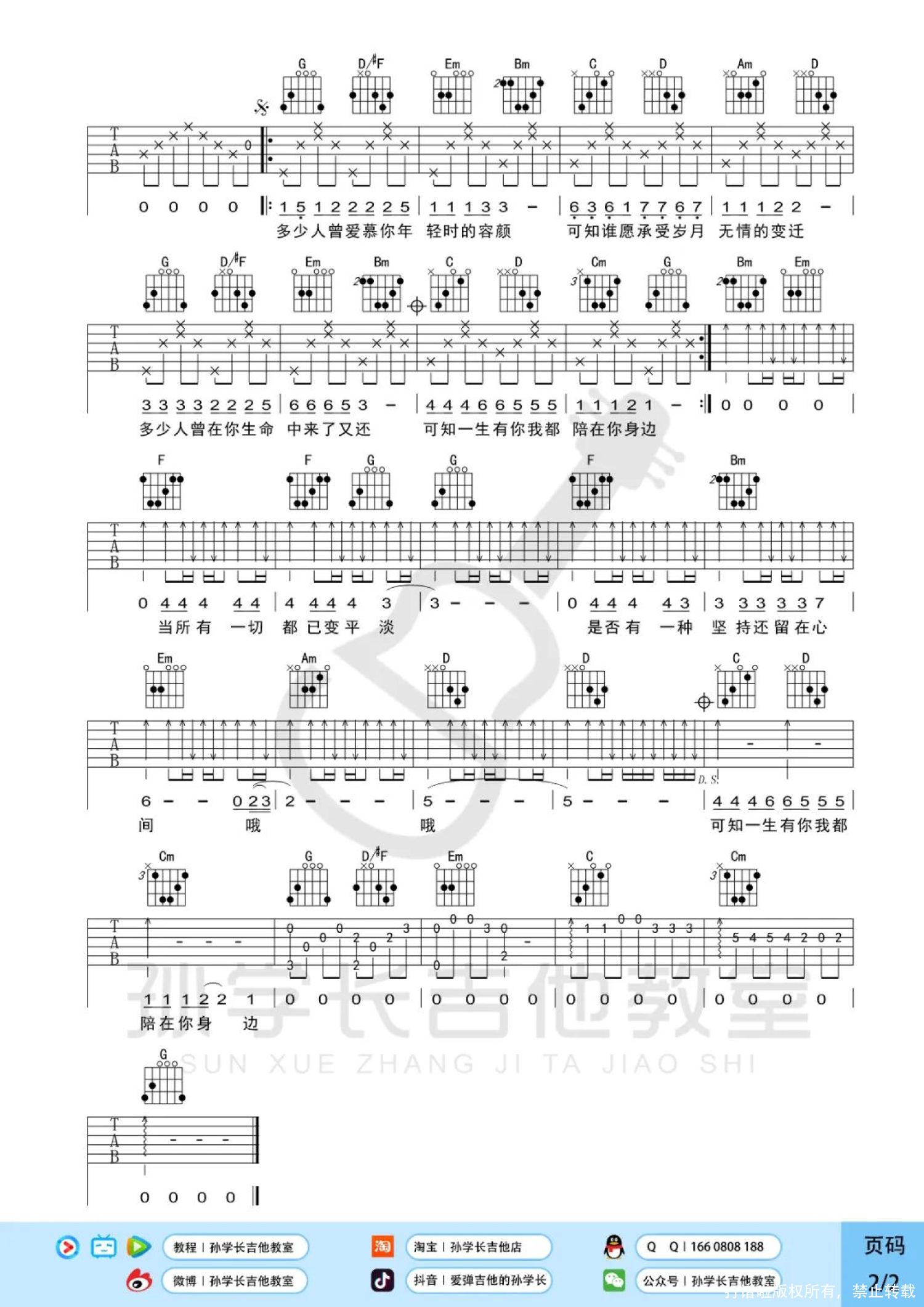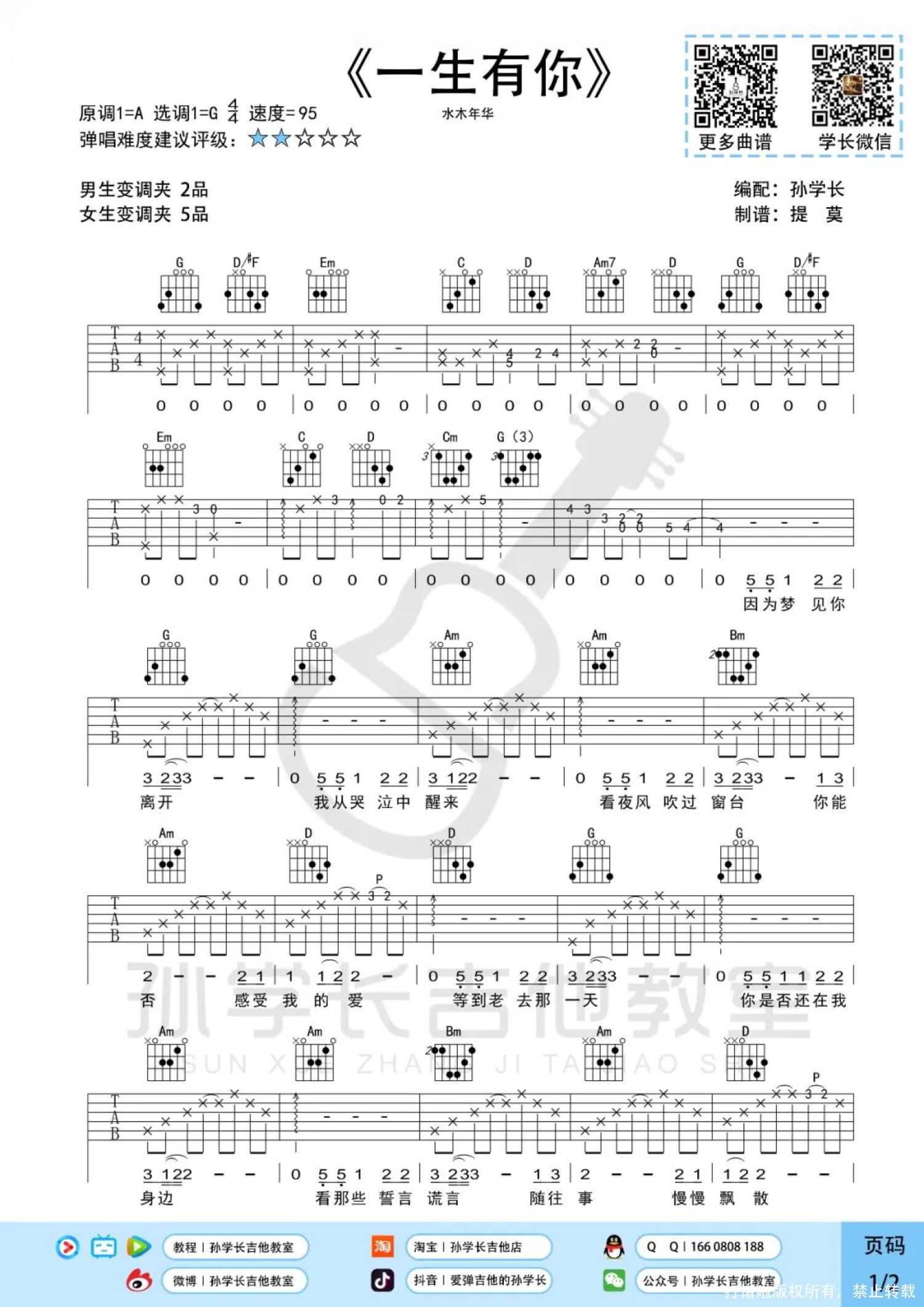 曲谱介绍: 水木年华《一生有你》吉他弹唱谱,孙学长吉他教室编配出品,共有2张高清图谱,免翻页排版设计。