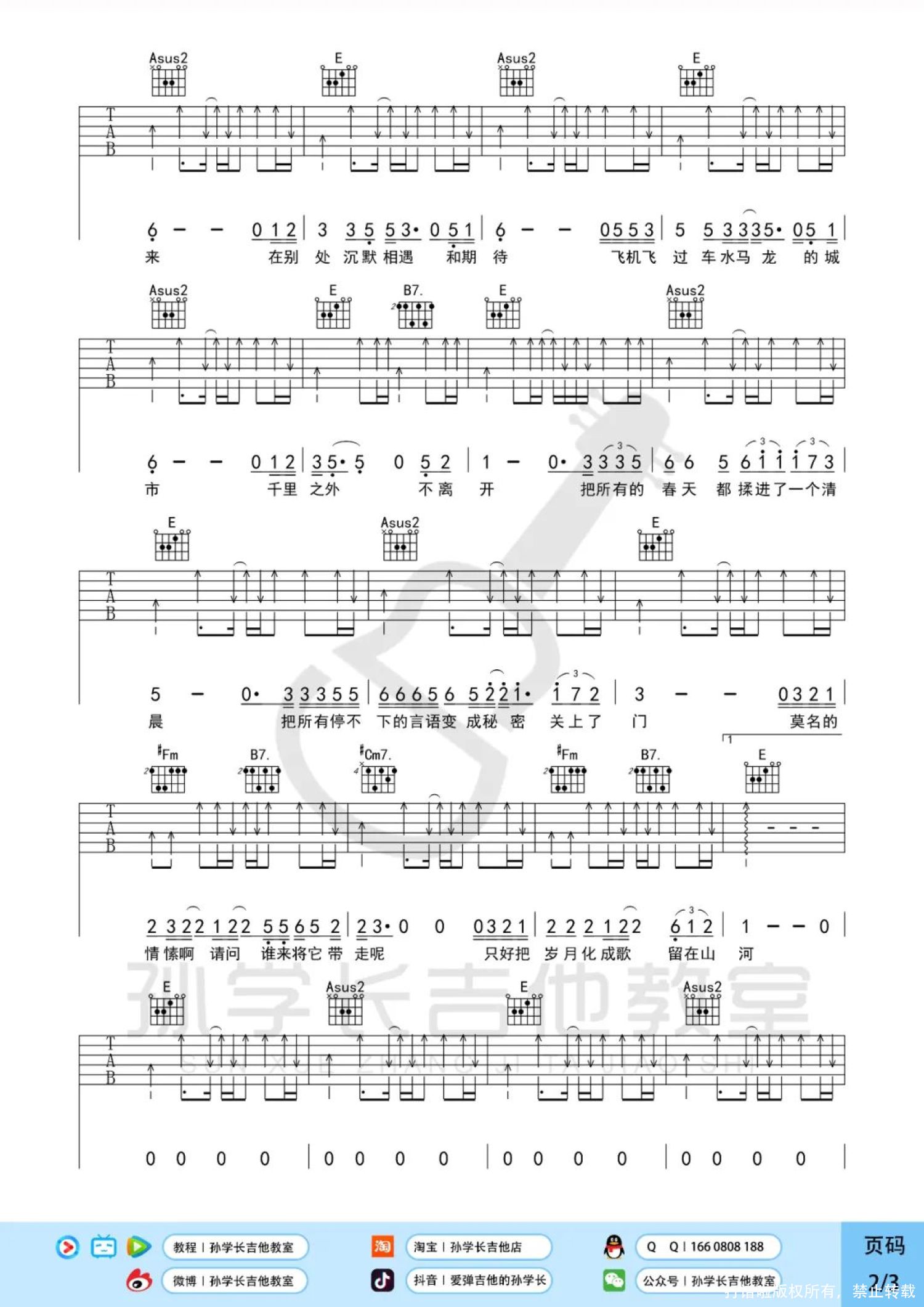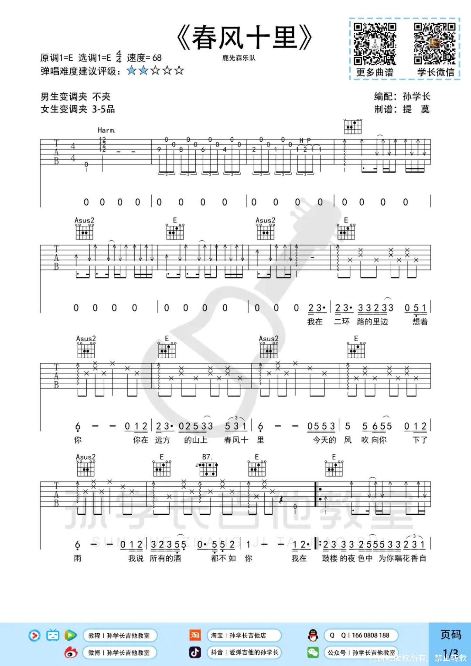 曲谱介绍: 鹿先森乐队《春风十里》吉他弹唱谱,孙学长吉他教室编配出品,共有3张高清图谱。