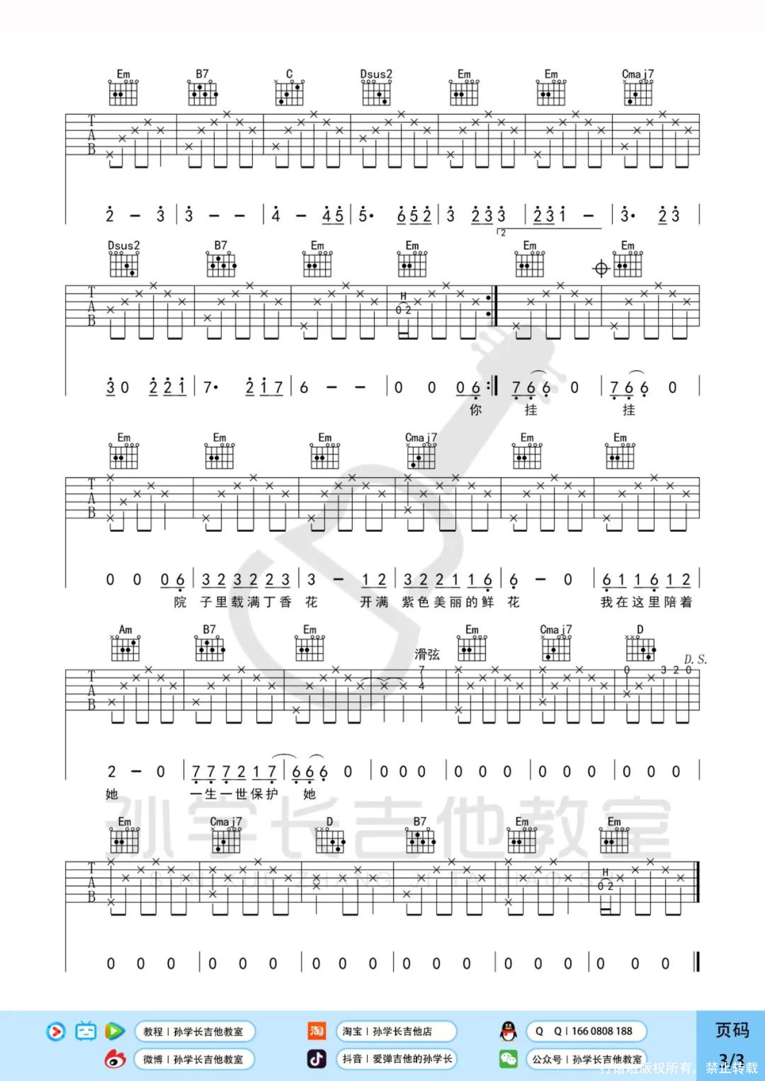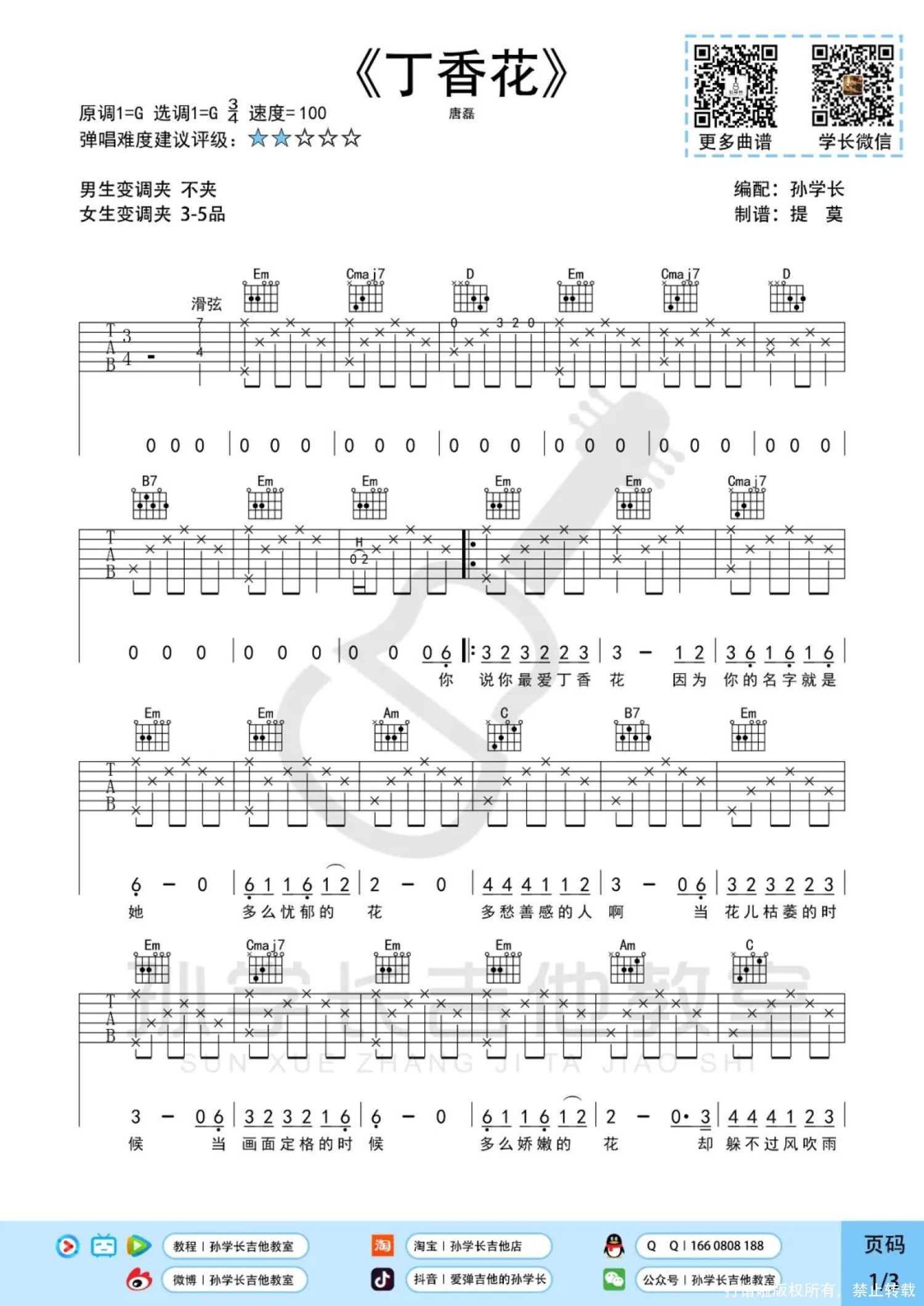曲谱介绍: 唐磊《丁香花》吉他弹唱谱,孙学长吉他教室编配出品,共有3张高清图谱。