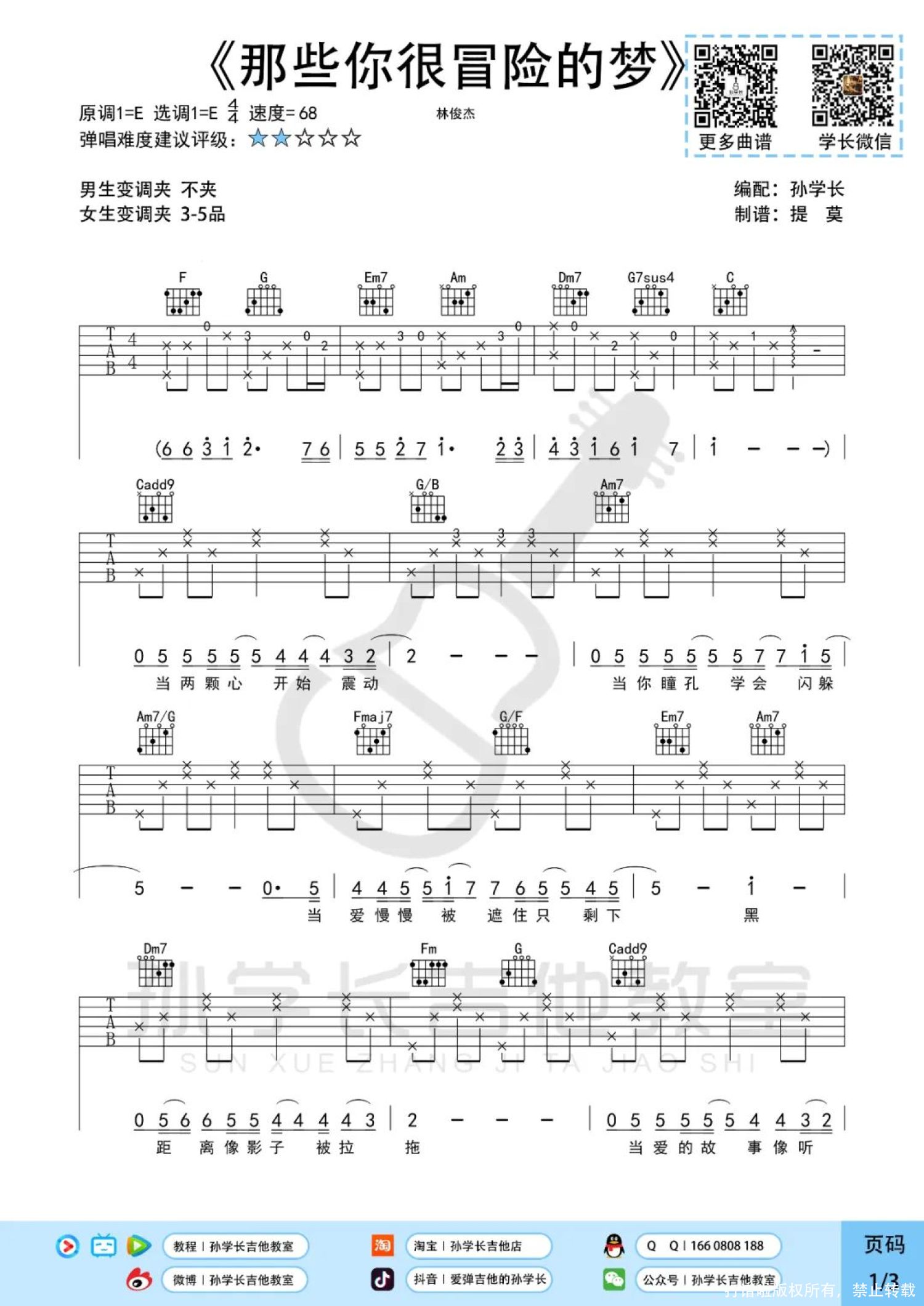 曲谱介绍: 林俊杰《那些你很冒险的梦》吉他弹唱谱,孙学长吉他教室编配出品,共有3张高清图谱。
