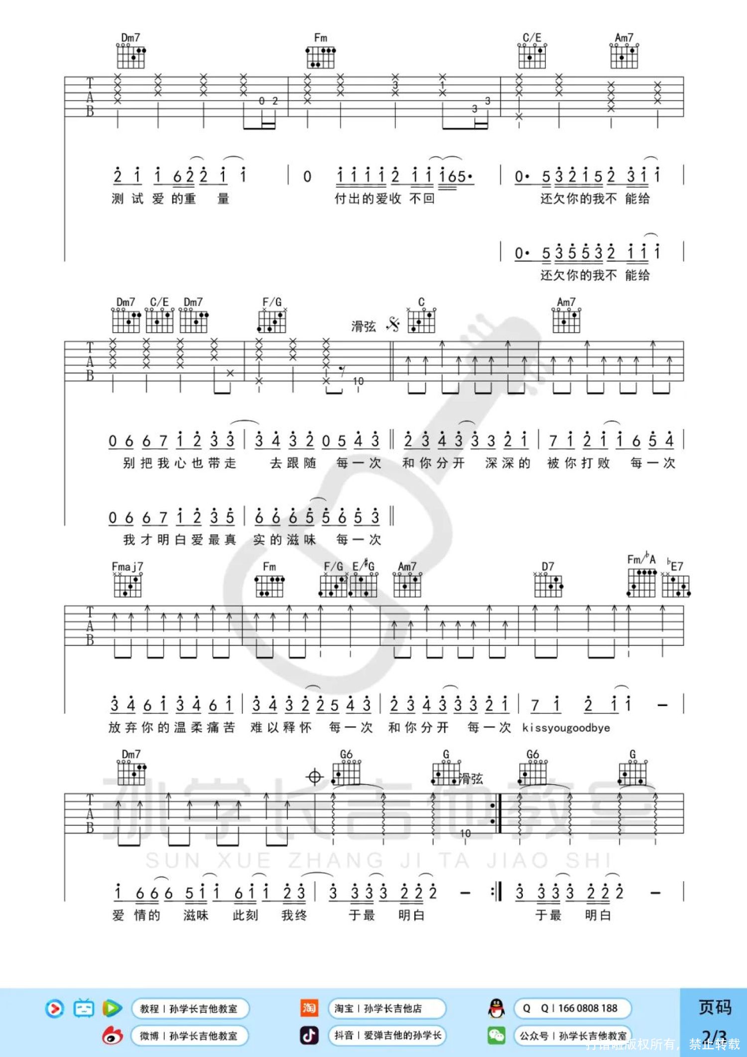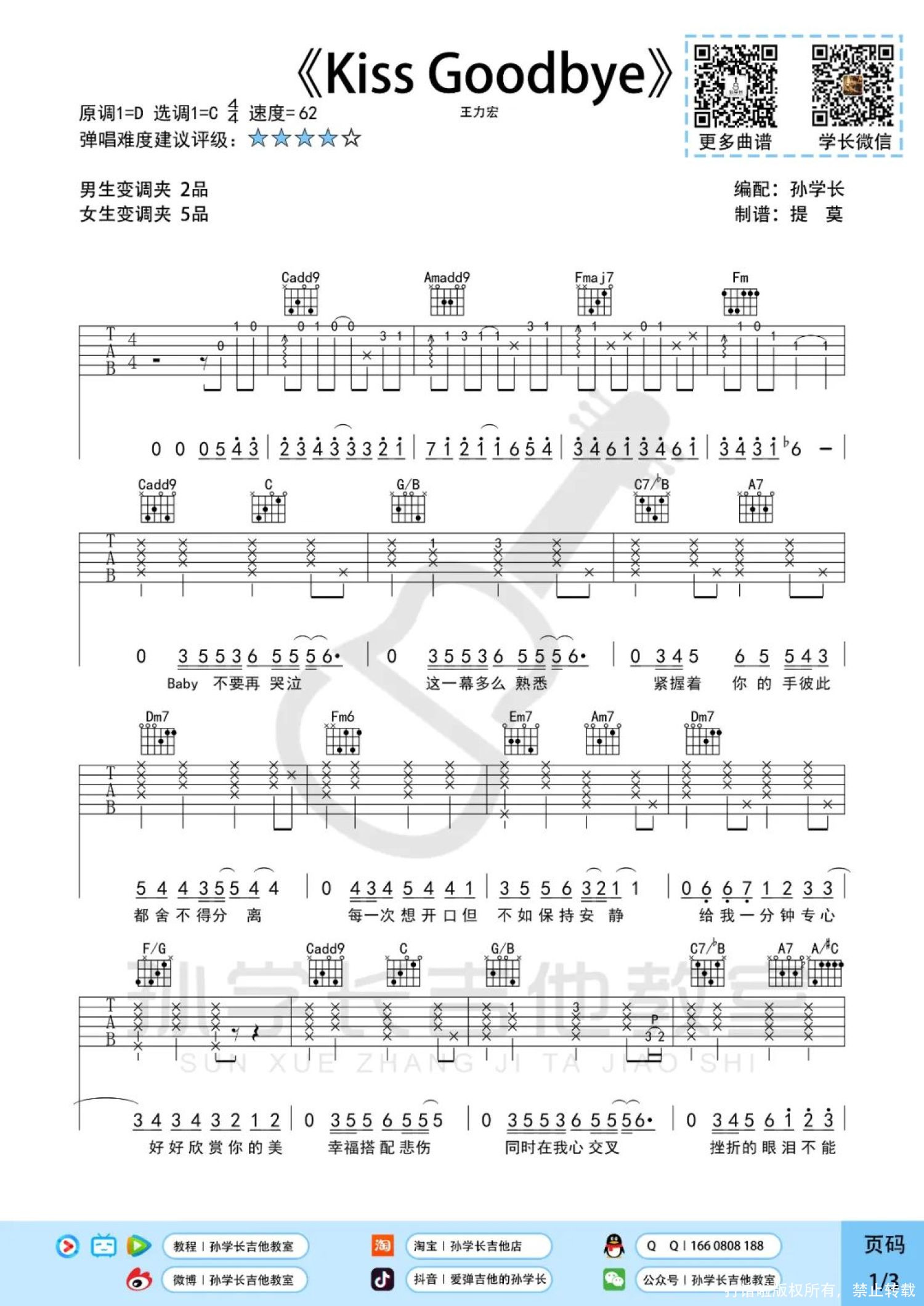 曲谱介绍: 王力宏《KissGoodbye》吉他弹唱谱,孙学长吉他教室编配出品,共有3张高清图谱。