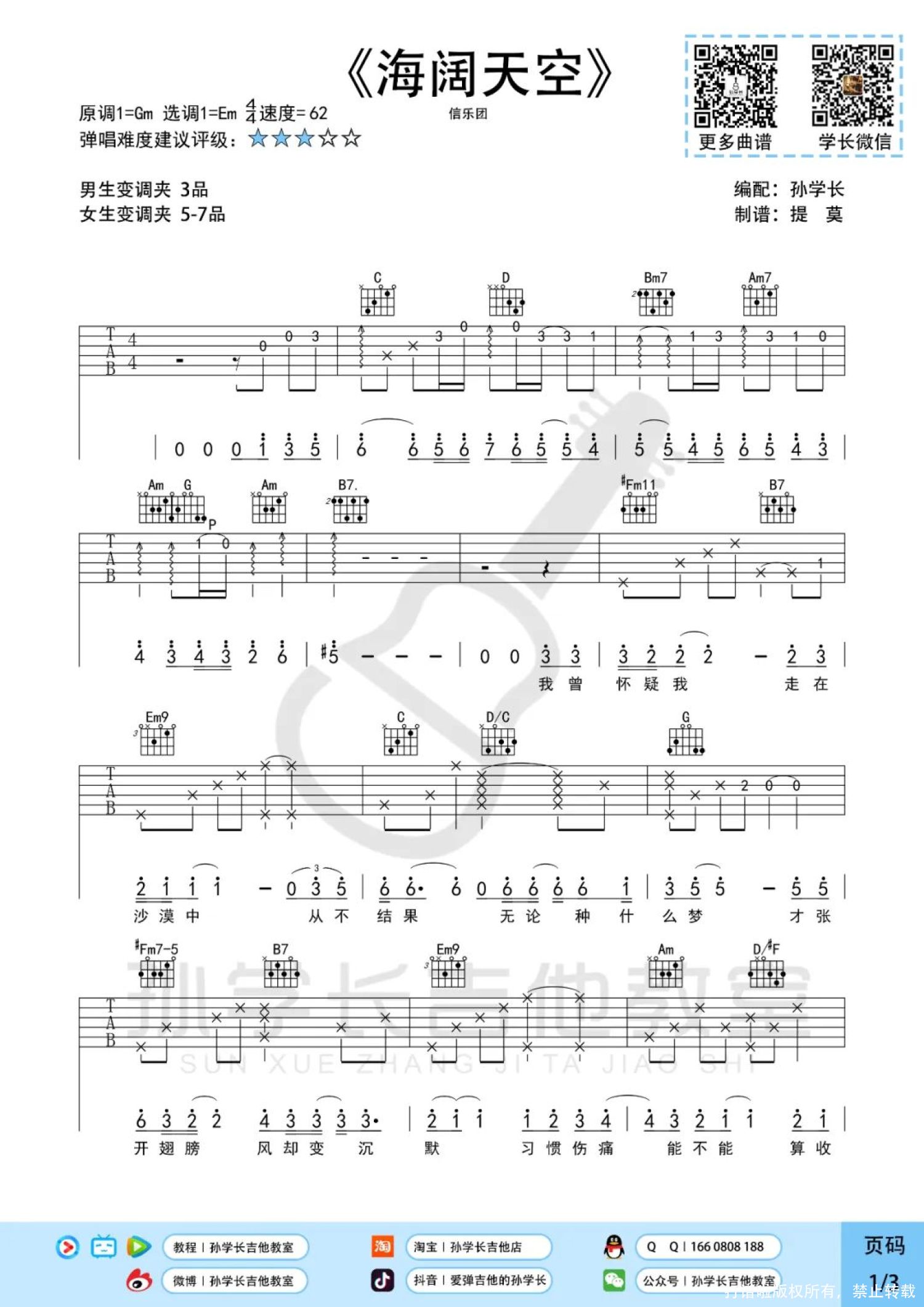 曲谱介绍: 信乐团《海阔天空》吉他弹唱谱,孙学长吉他教室编配出品,共有3张高清图谱。