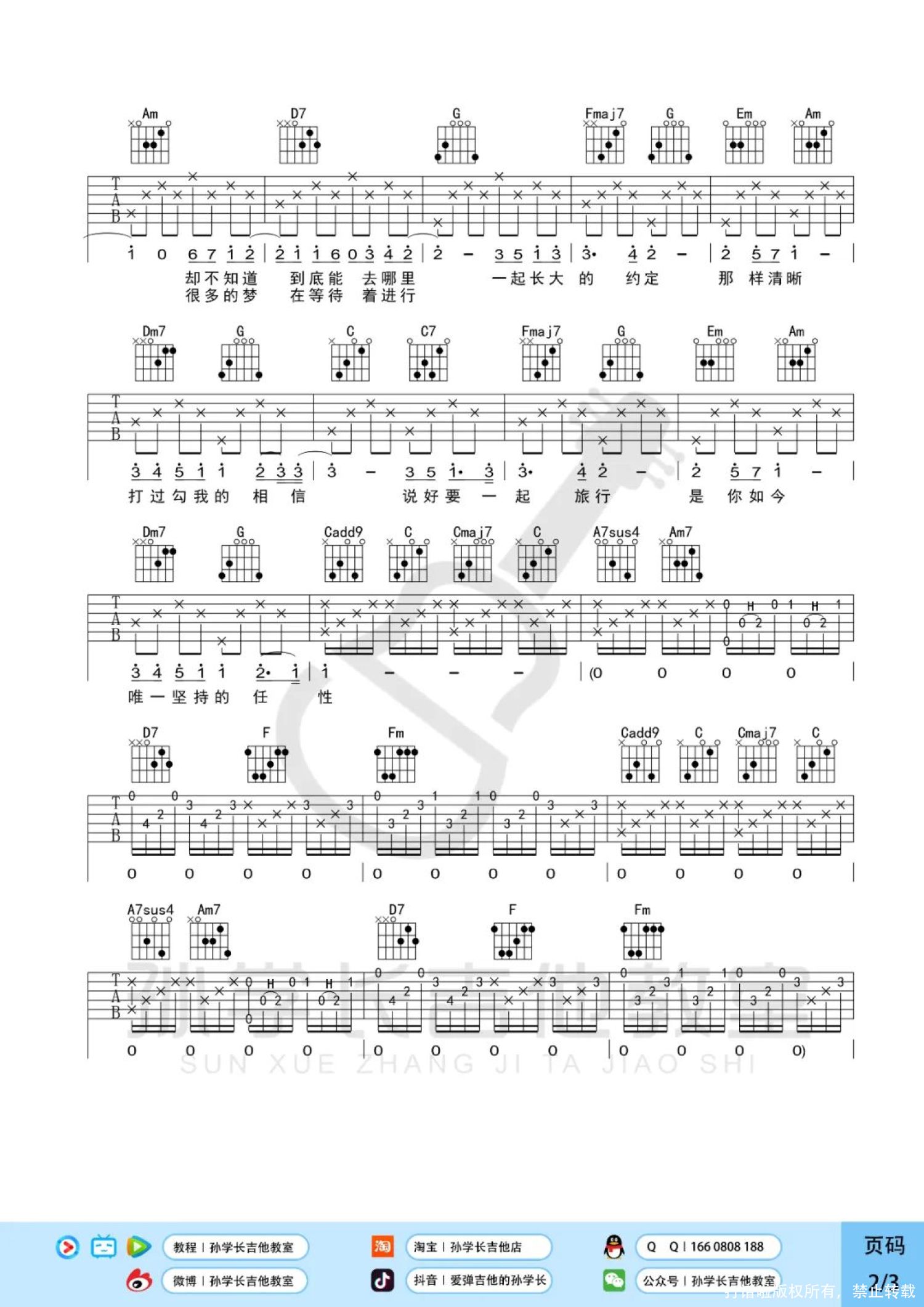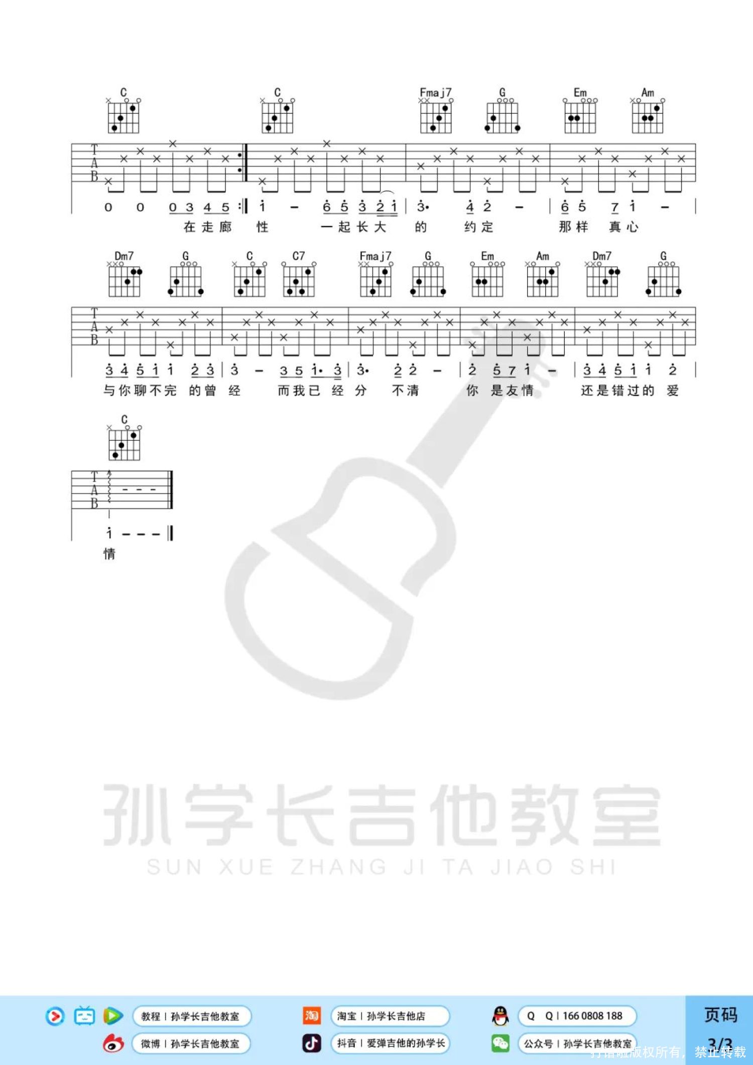 曲谱介绍: 周杰伦《蒲公英的约定》吉他弹唱谱,孙学长吉他教室编配出品,共有3张高清图谱。