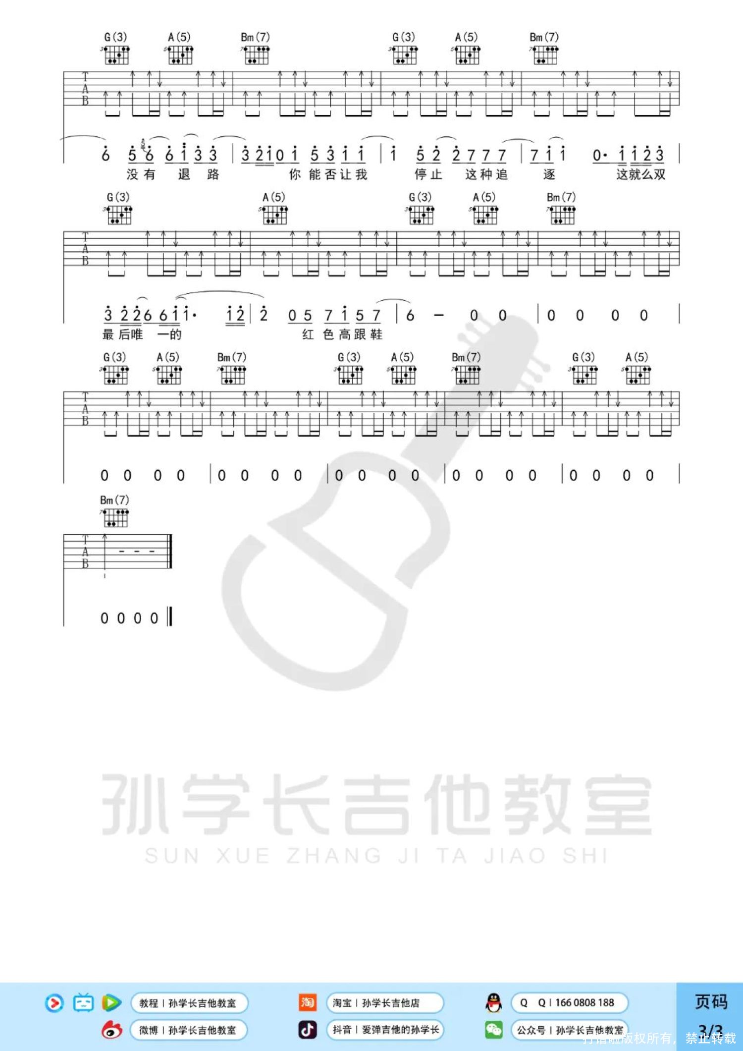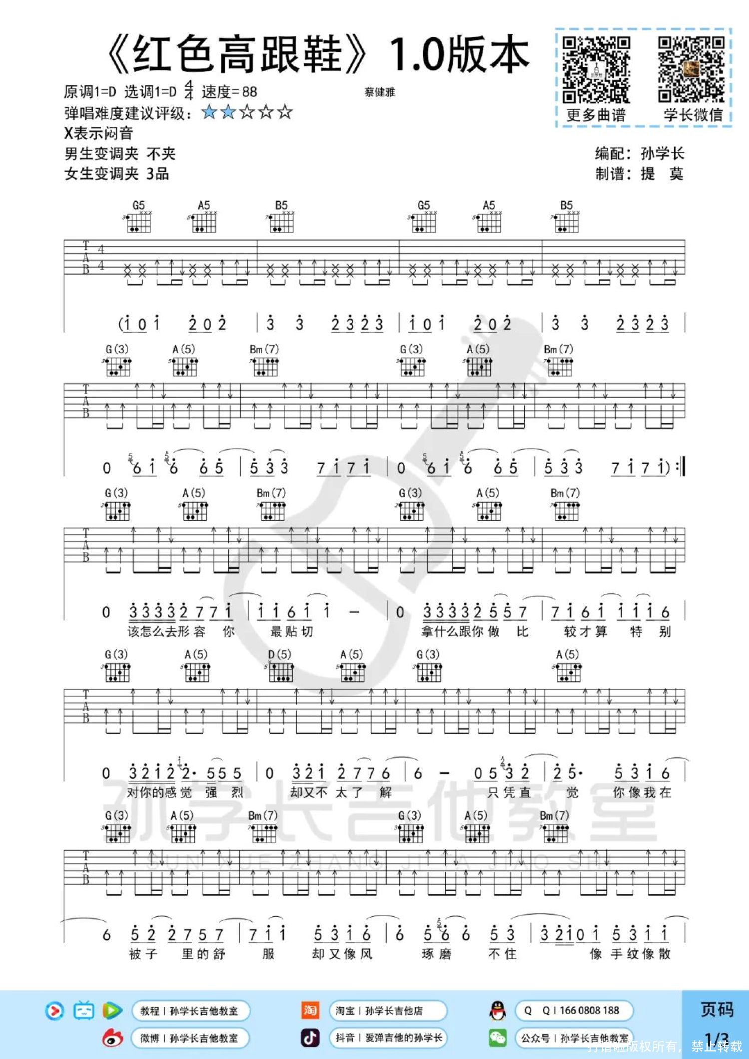 曲谱介绍: 蔡健雅《红色高跟鞋》吉他弹唱谱,孙学长吉他教室编配出品,共有3张高清图谱。