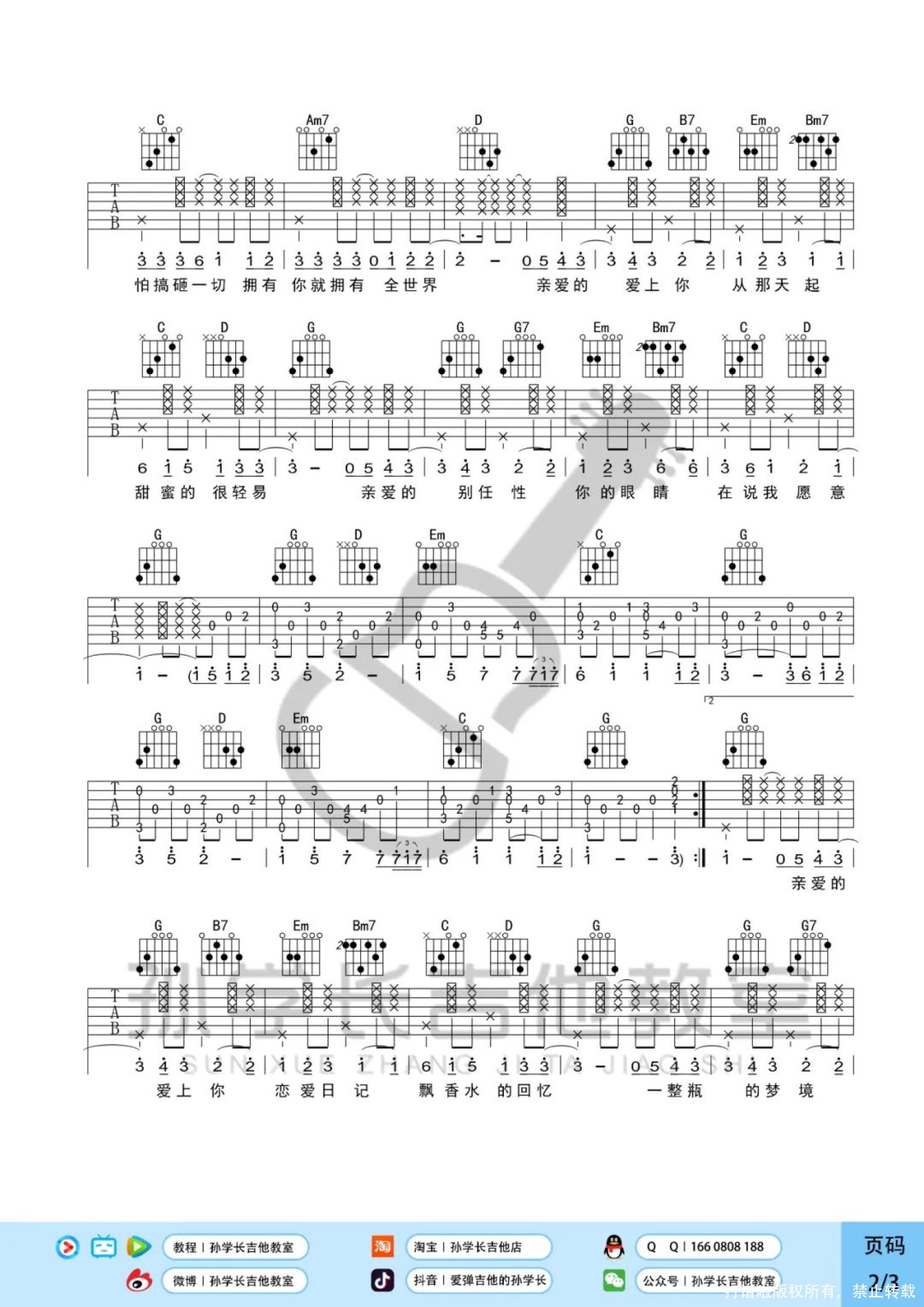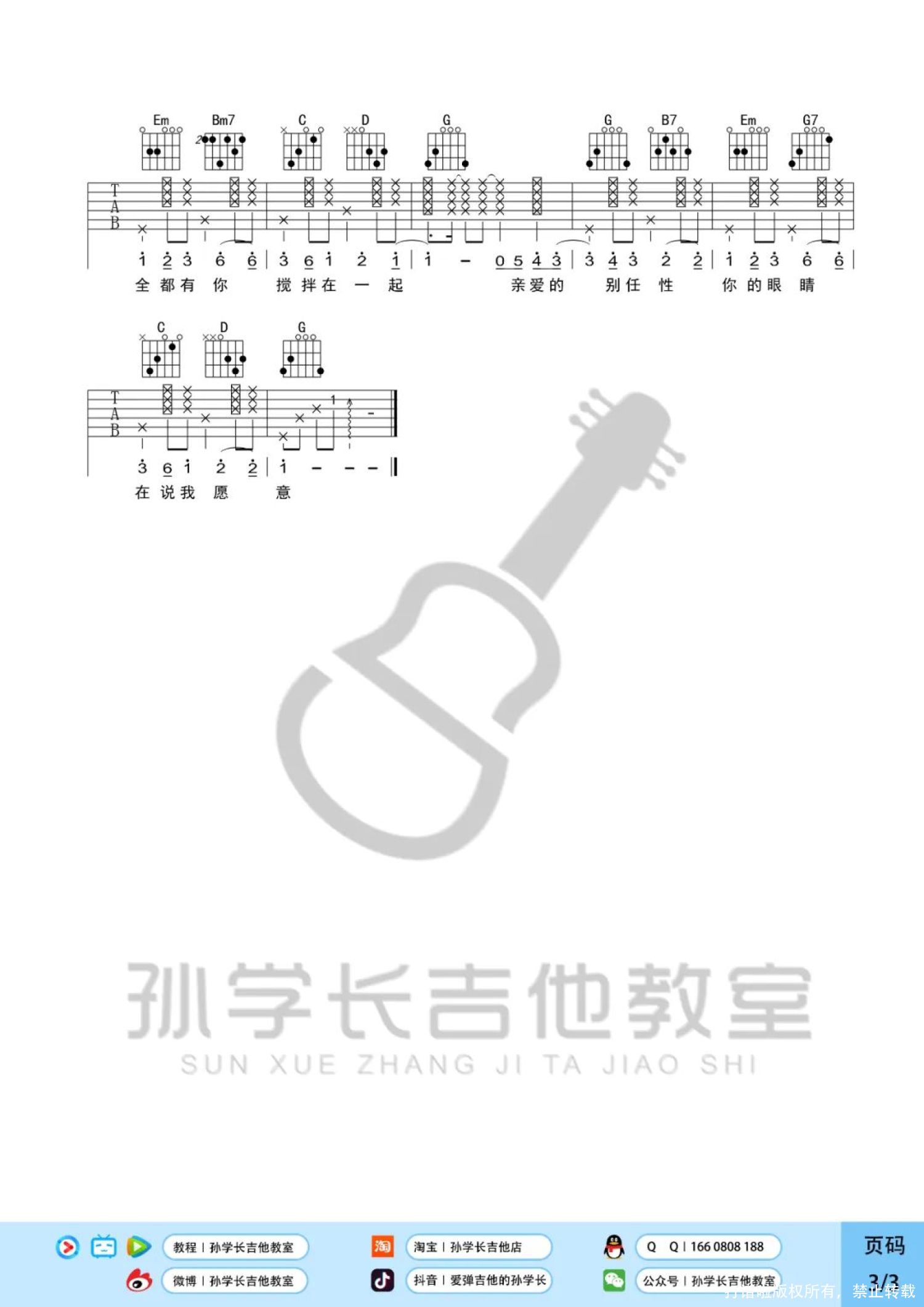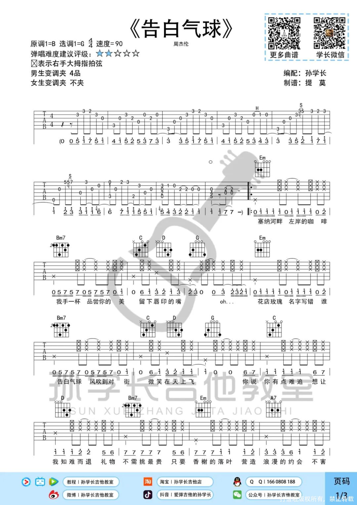 曲谱介绍: 周杰伦《告白气球》吉他弹唱谱,孙学长吉他教室编配出品,共有3张高清图谱。