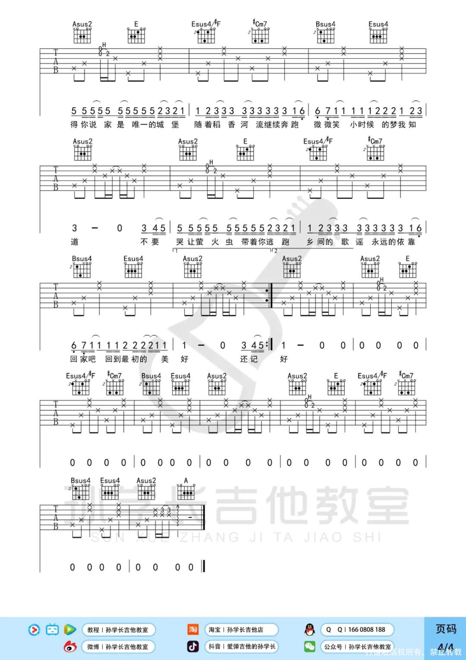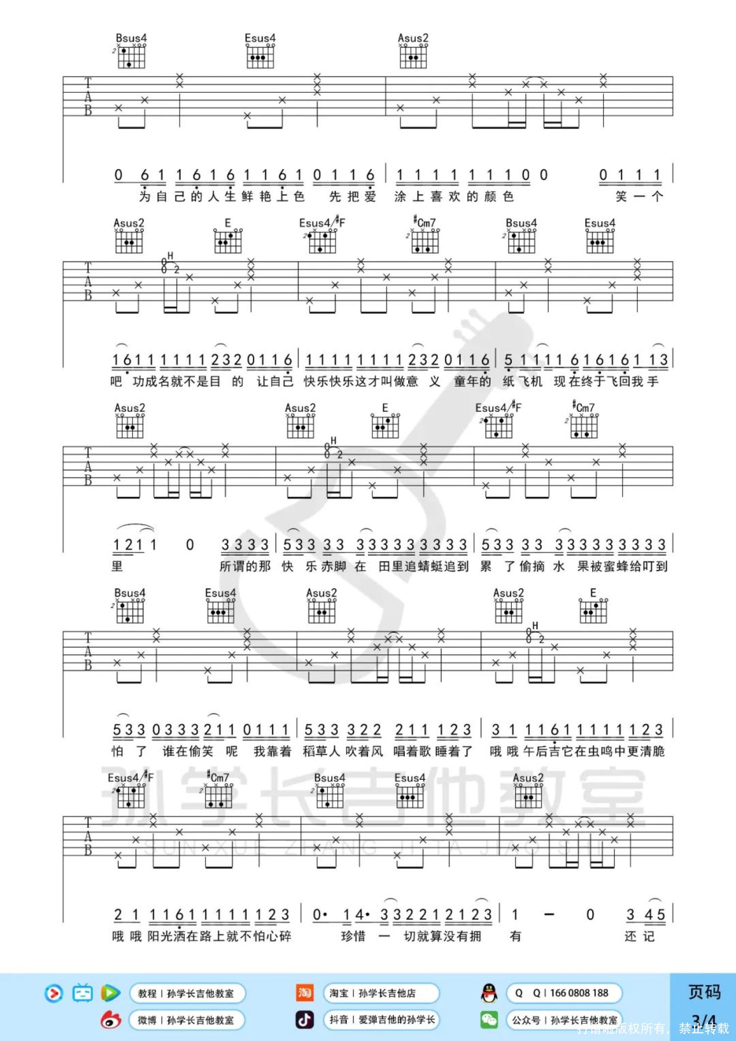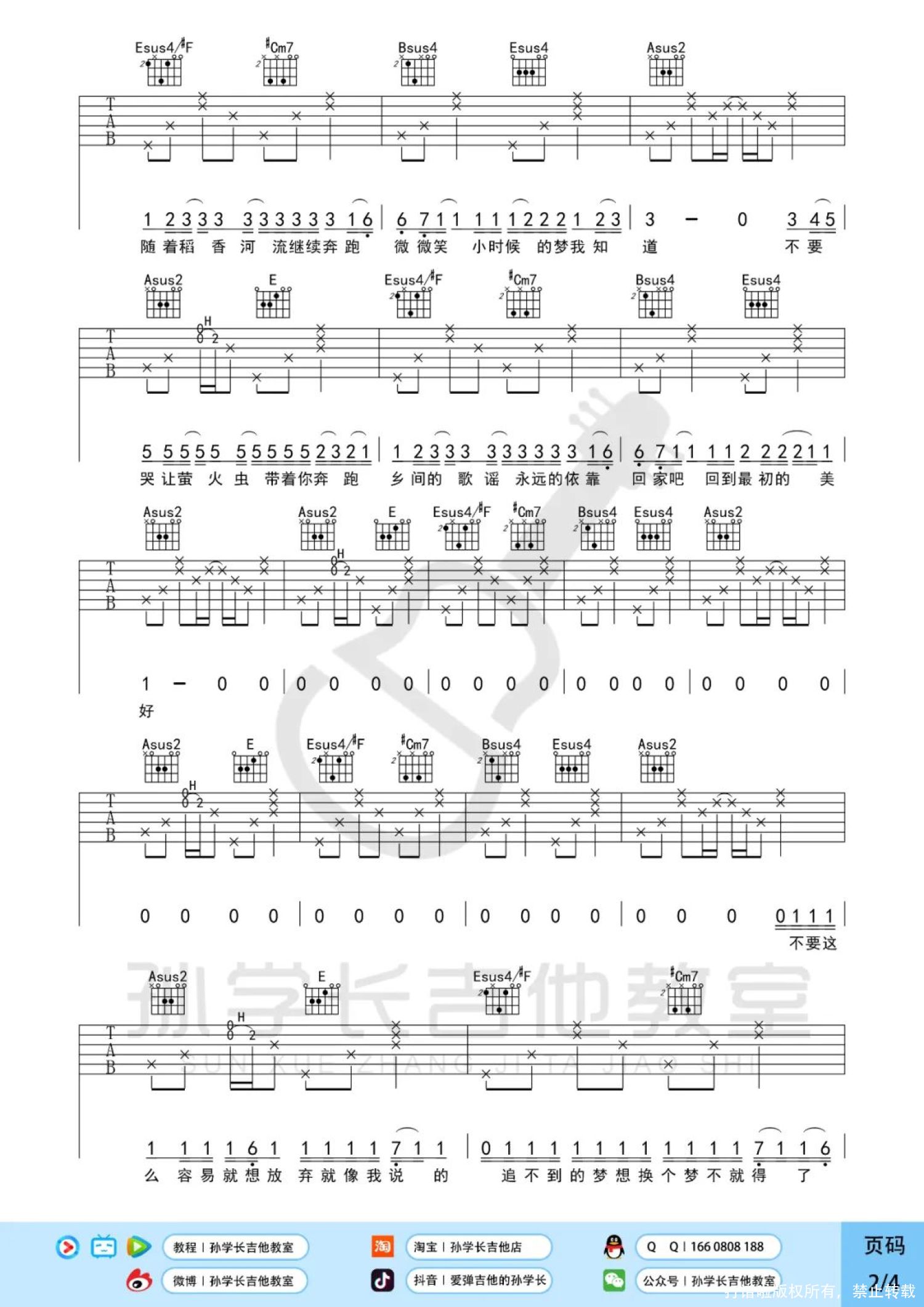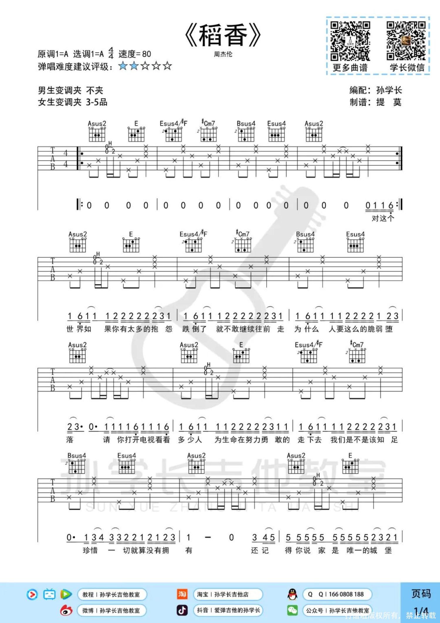 曲谱介绍: 周杰伦《稻香》吉他弹唱谱,孙学长吉他教室编配出品,共有4张高清图谱。