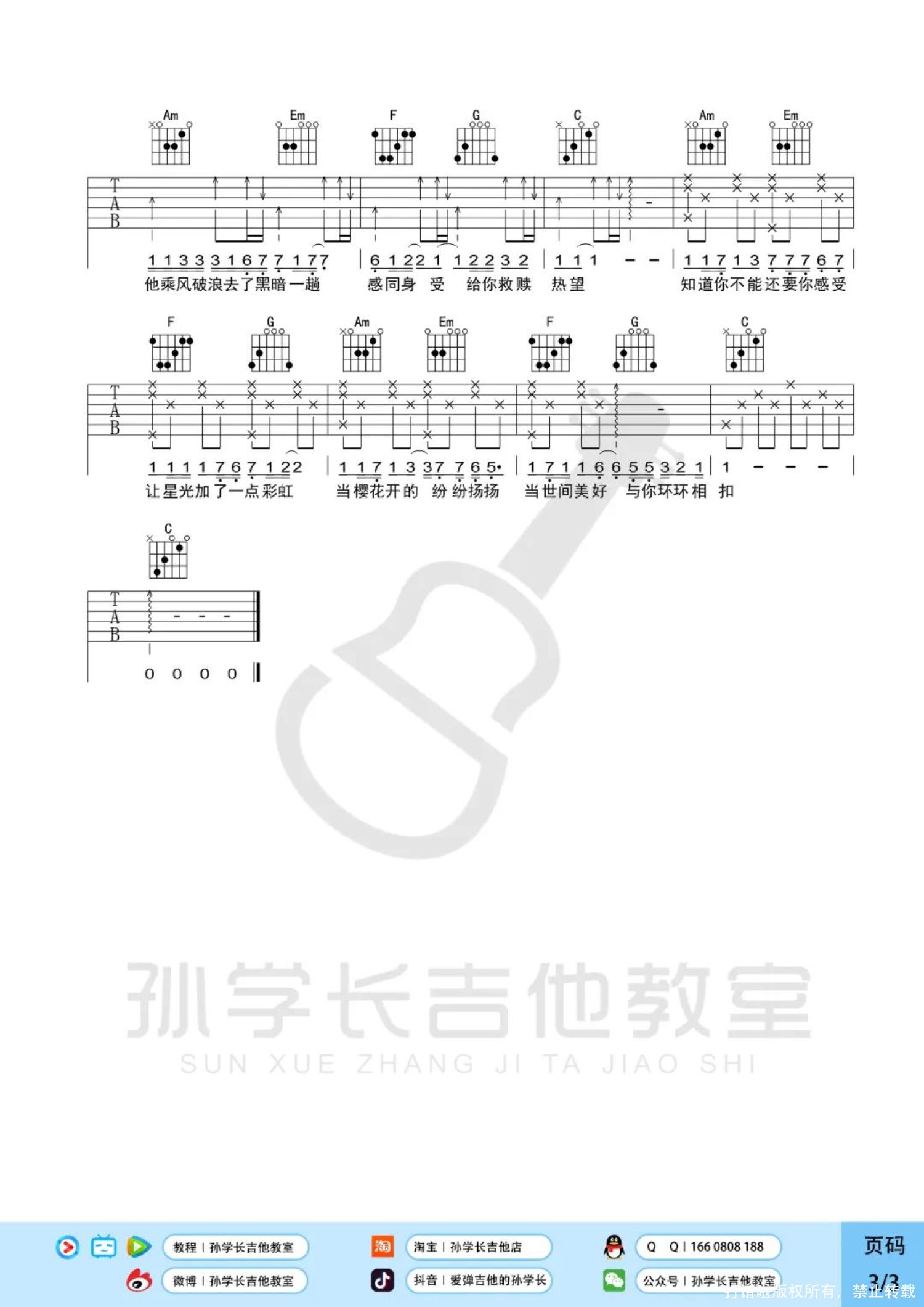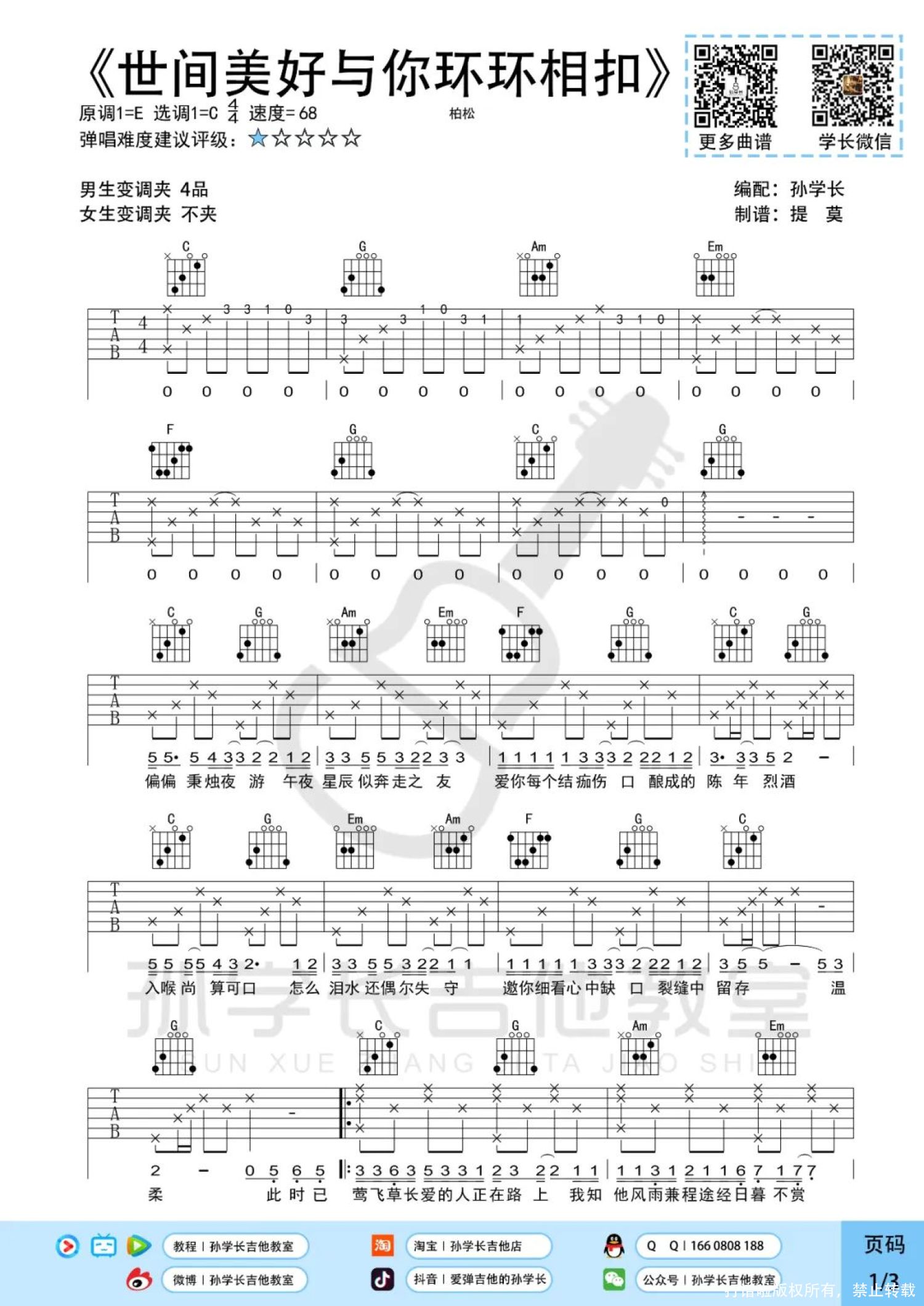 曲谱介绍: 柏松《世间美好与你环环相扣》吉他弹唱谱,孙学长吉他教室编配出品,共有3张高清图谱。