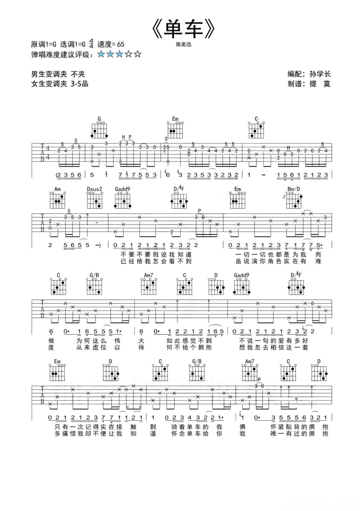 曲谱介绍: 陈奕迅《单车》吉他弹唱谱,孙学长吉他教室编配出品,共有3张高清图谱。