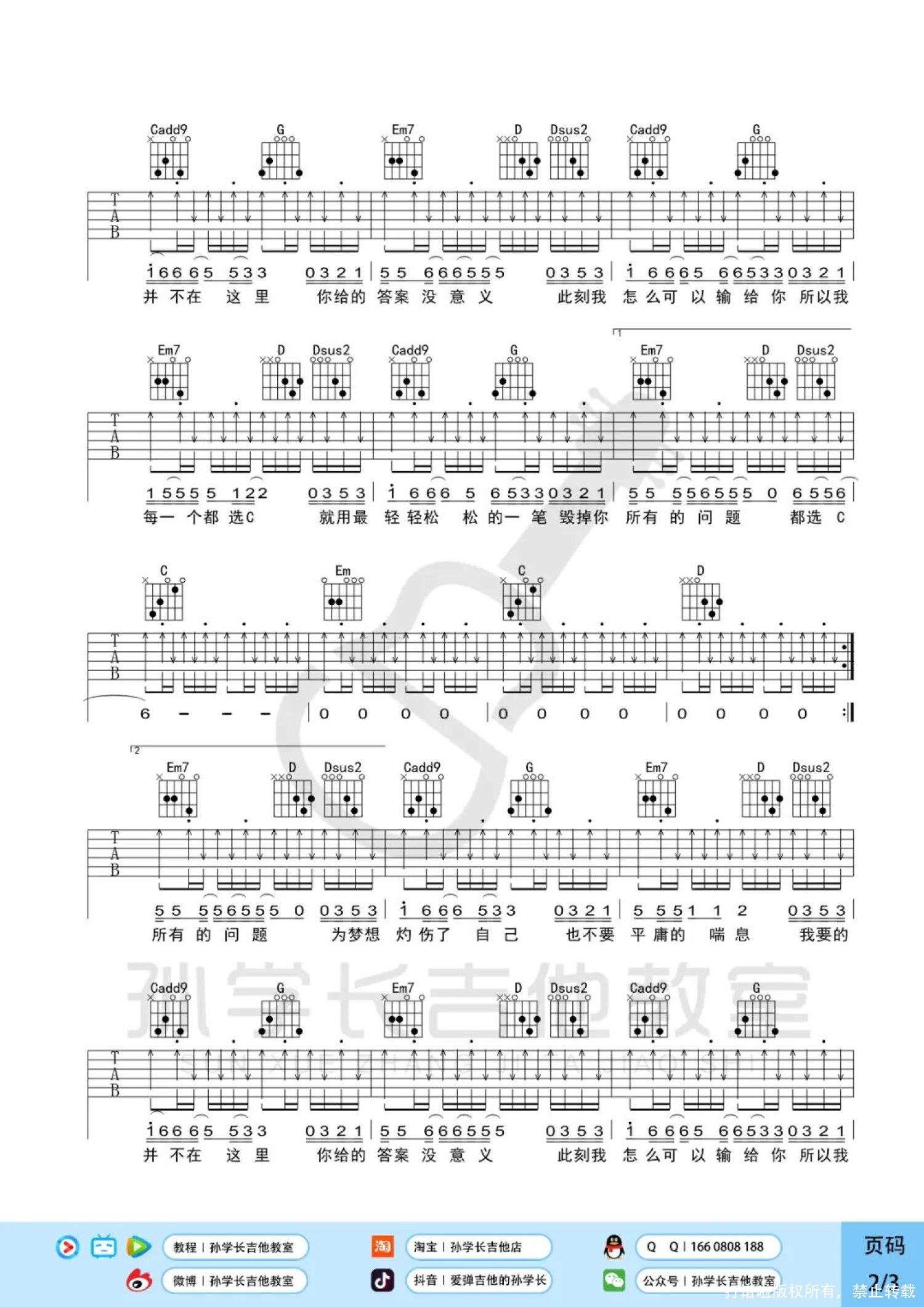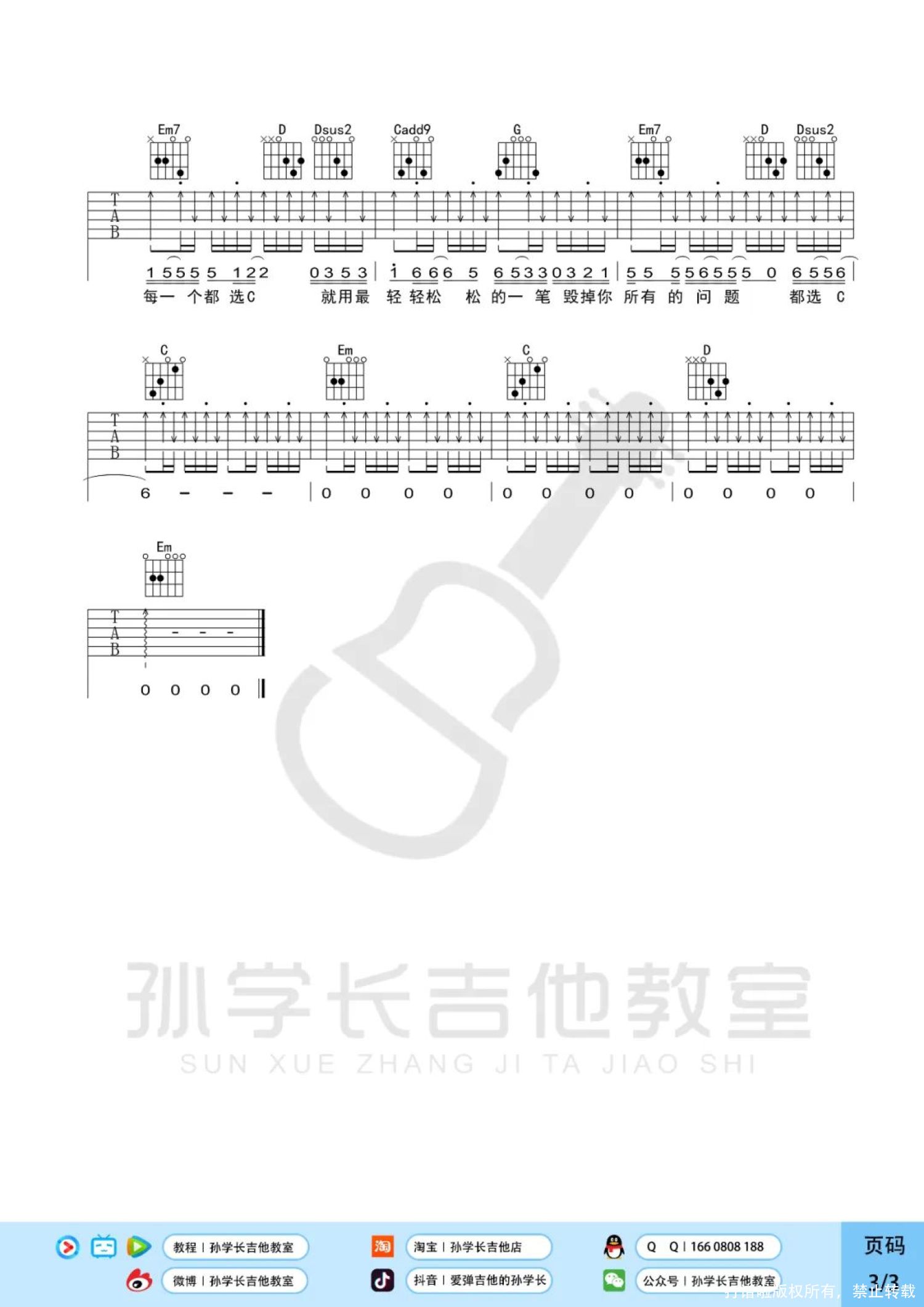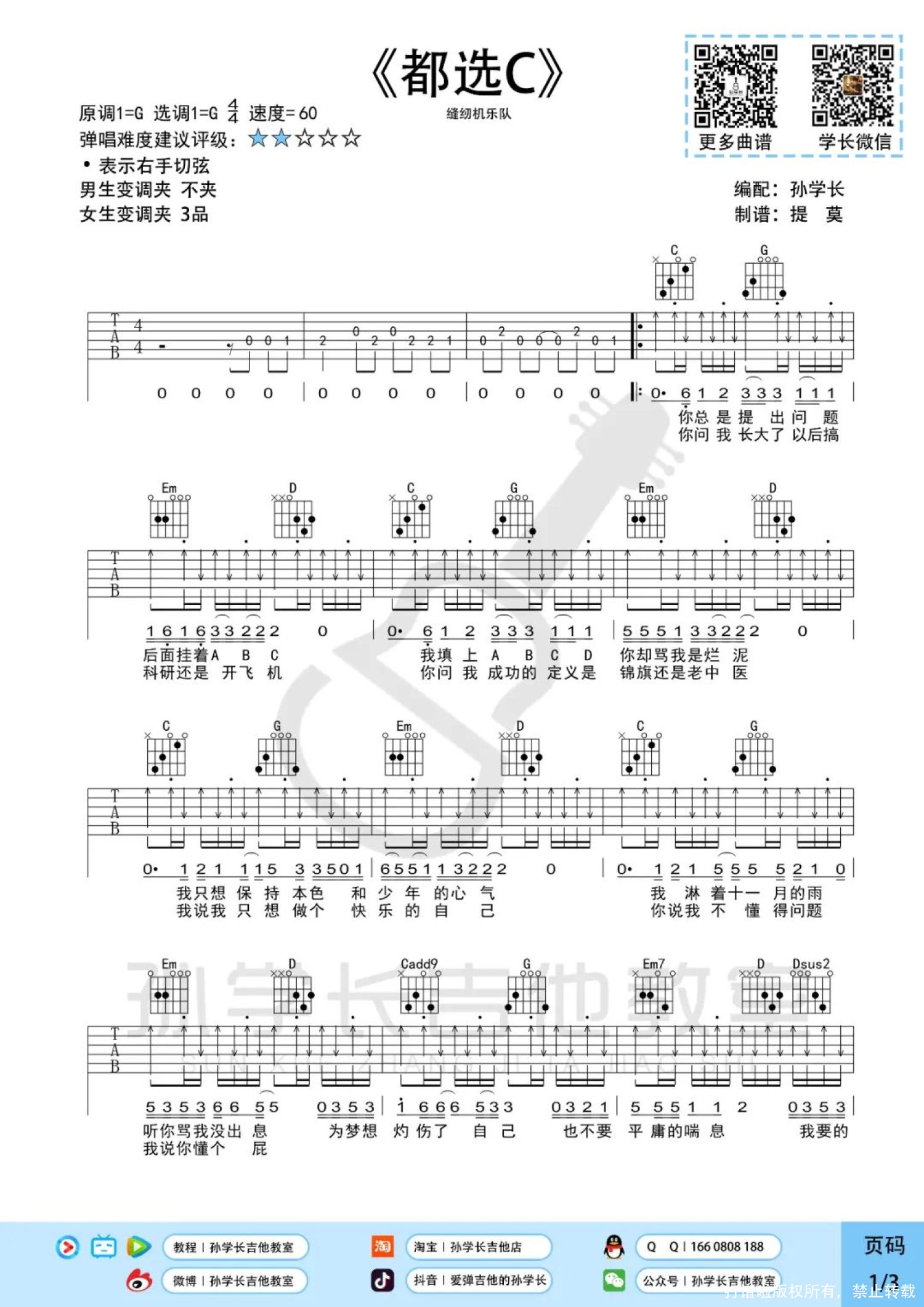 曲谱介绍: 缝纫机乐队《都选C》吉他弹唱谱,孙学长吉他教室编配出品,共有3张高清图谱。