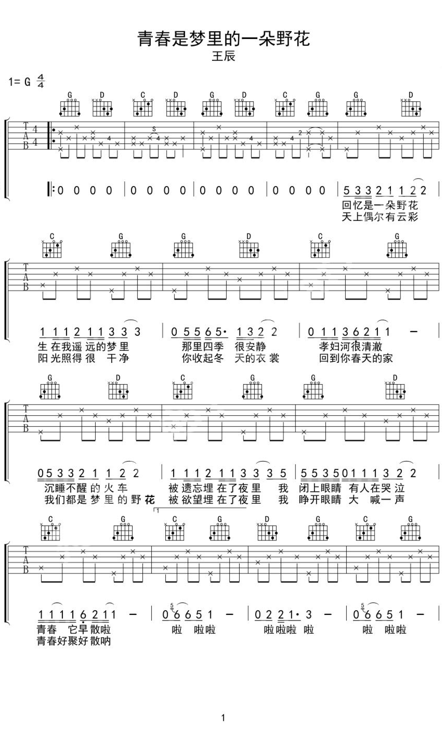 青春是梦里的一朵野花吉他谱 - 王辰 - G调吉他弹唱谱