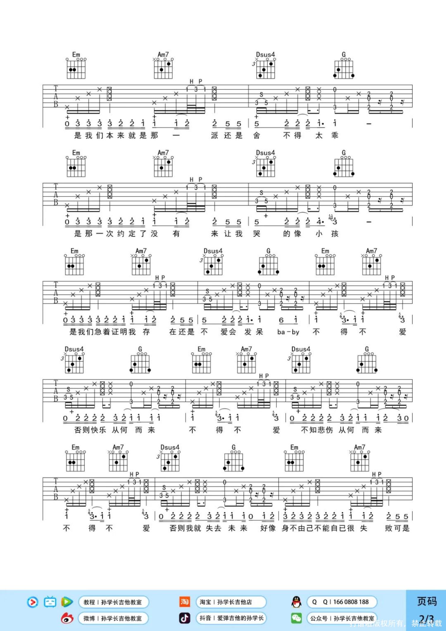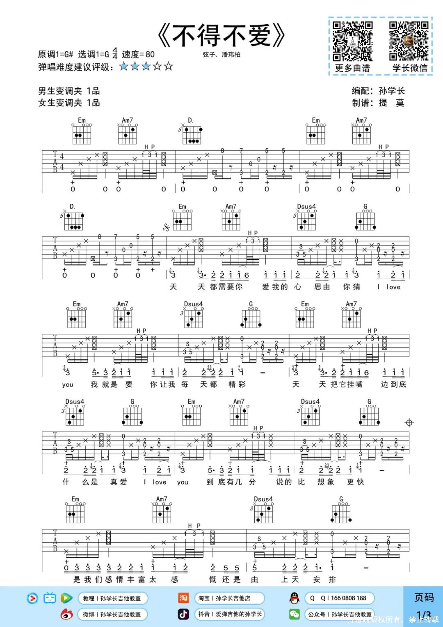 曲谱介绍: 弦子/潘玮柏《不得不爱》吉他弹唱谱,孙学长吉他教室编配出品,共有3张高清图谱。
