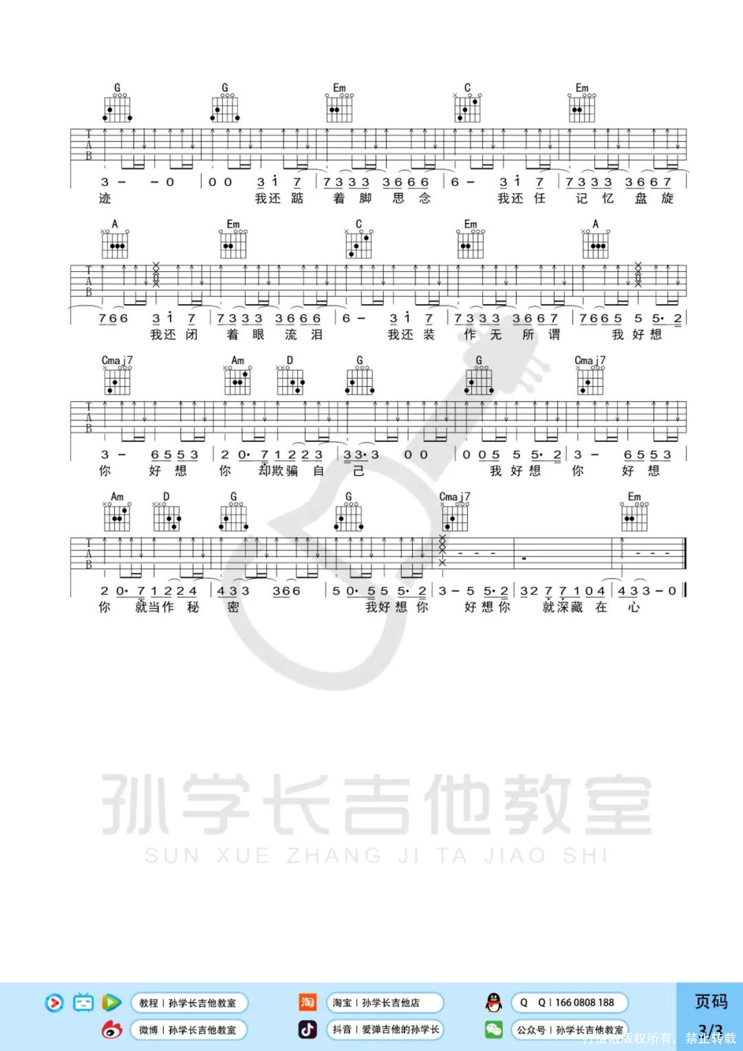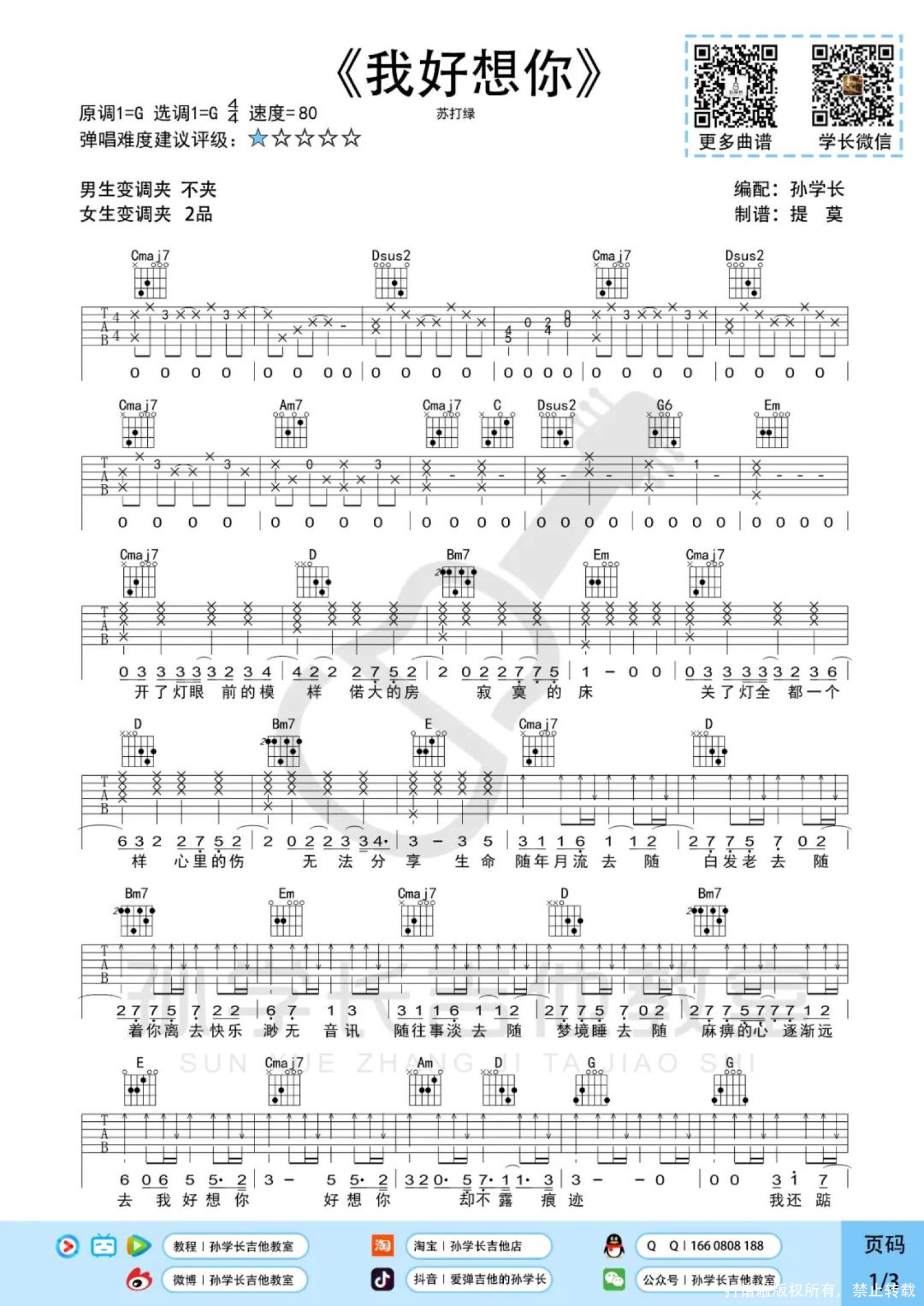 曲谱介绍: 苏打绿《我好想你》吉他弹唱谱,孙学长吉他教室编配出品,共有3张高清图谱。