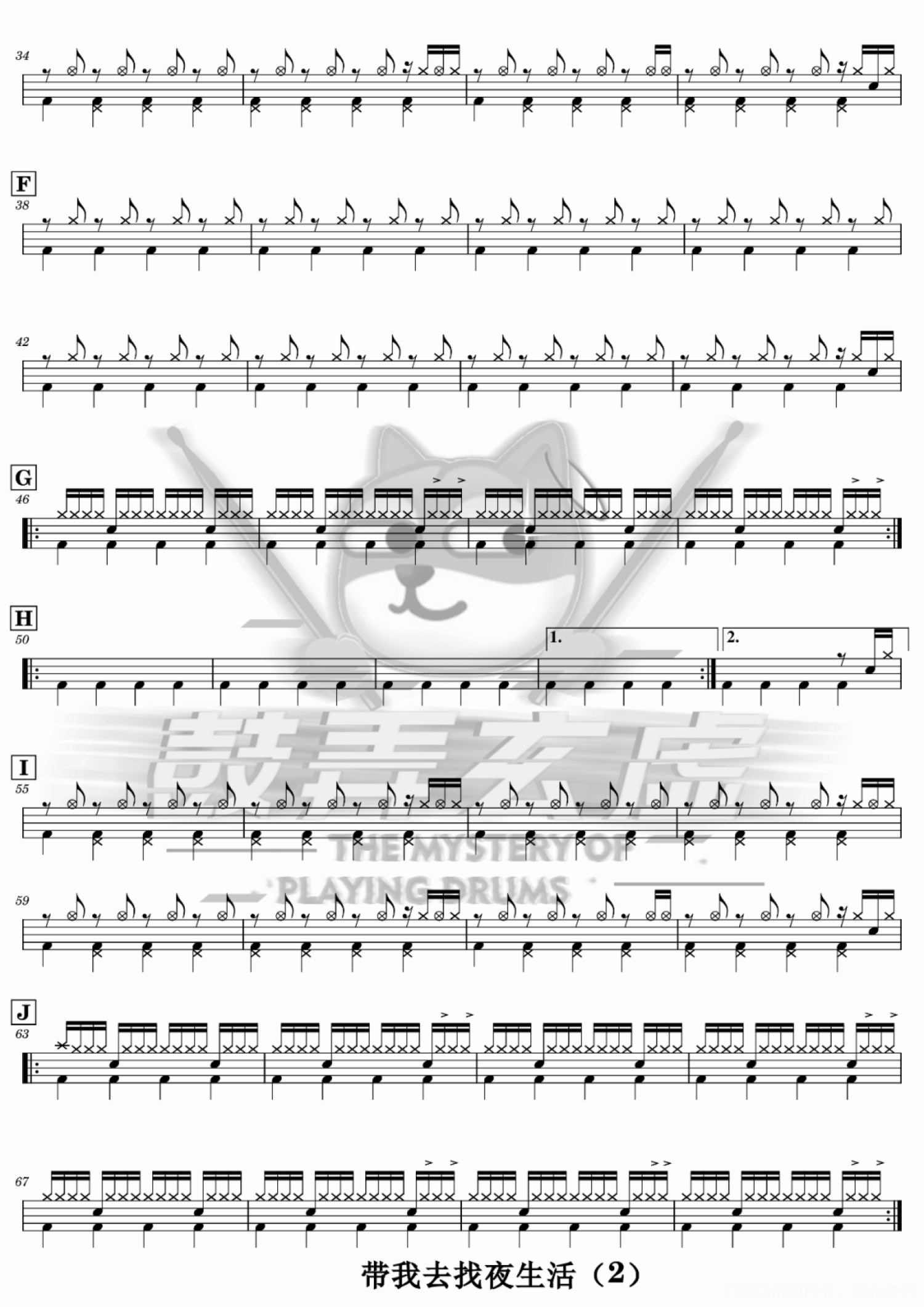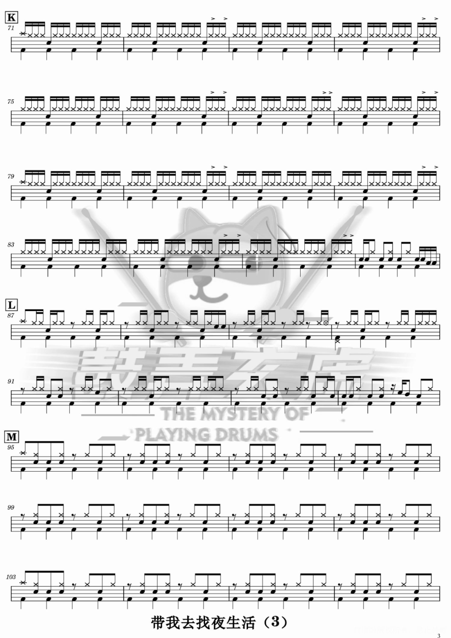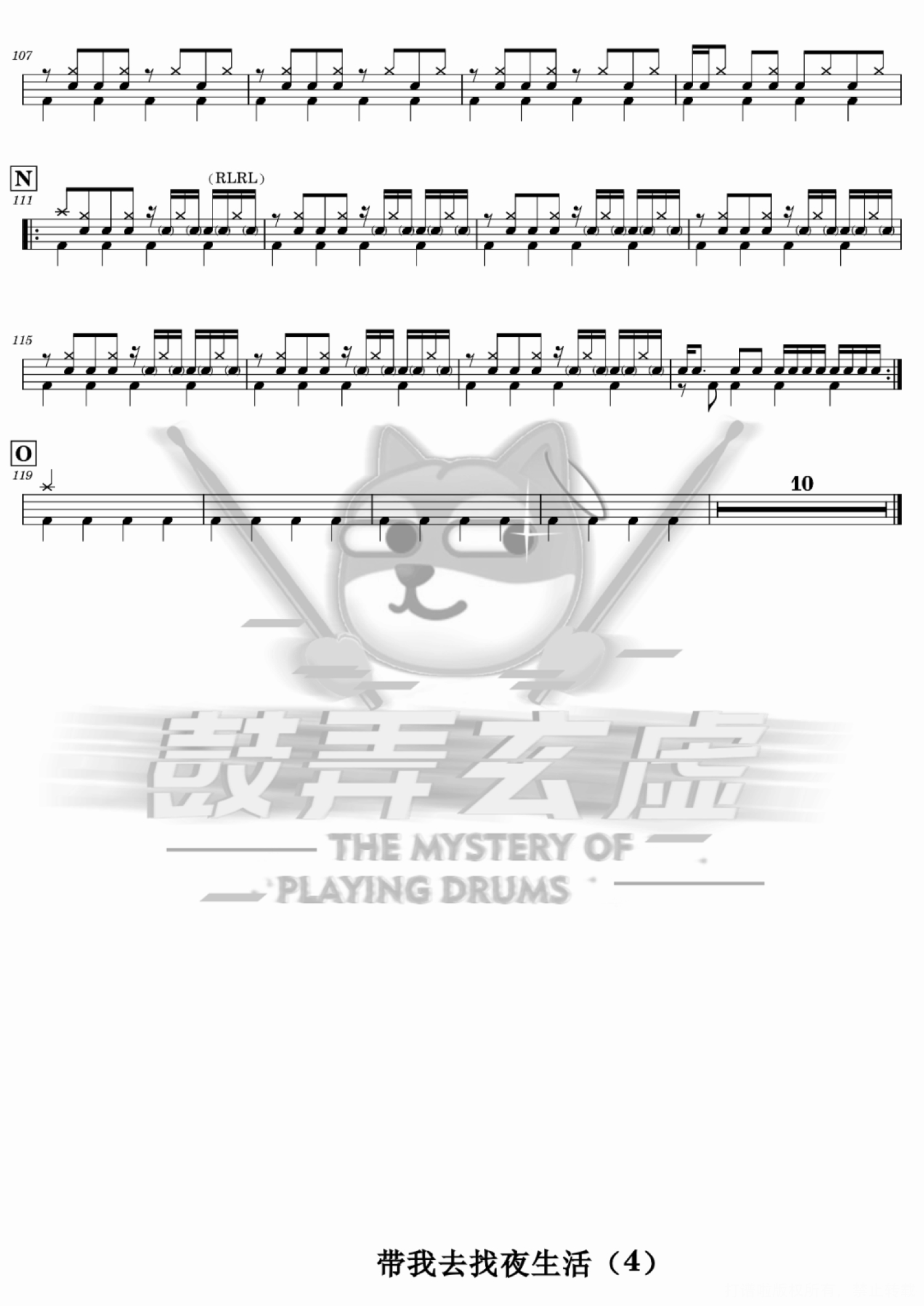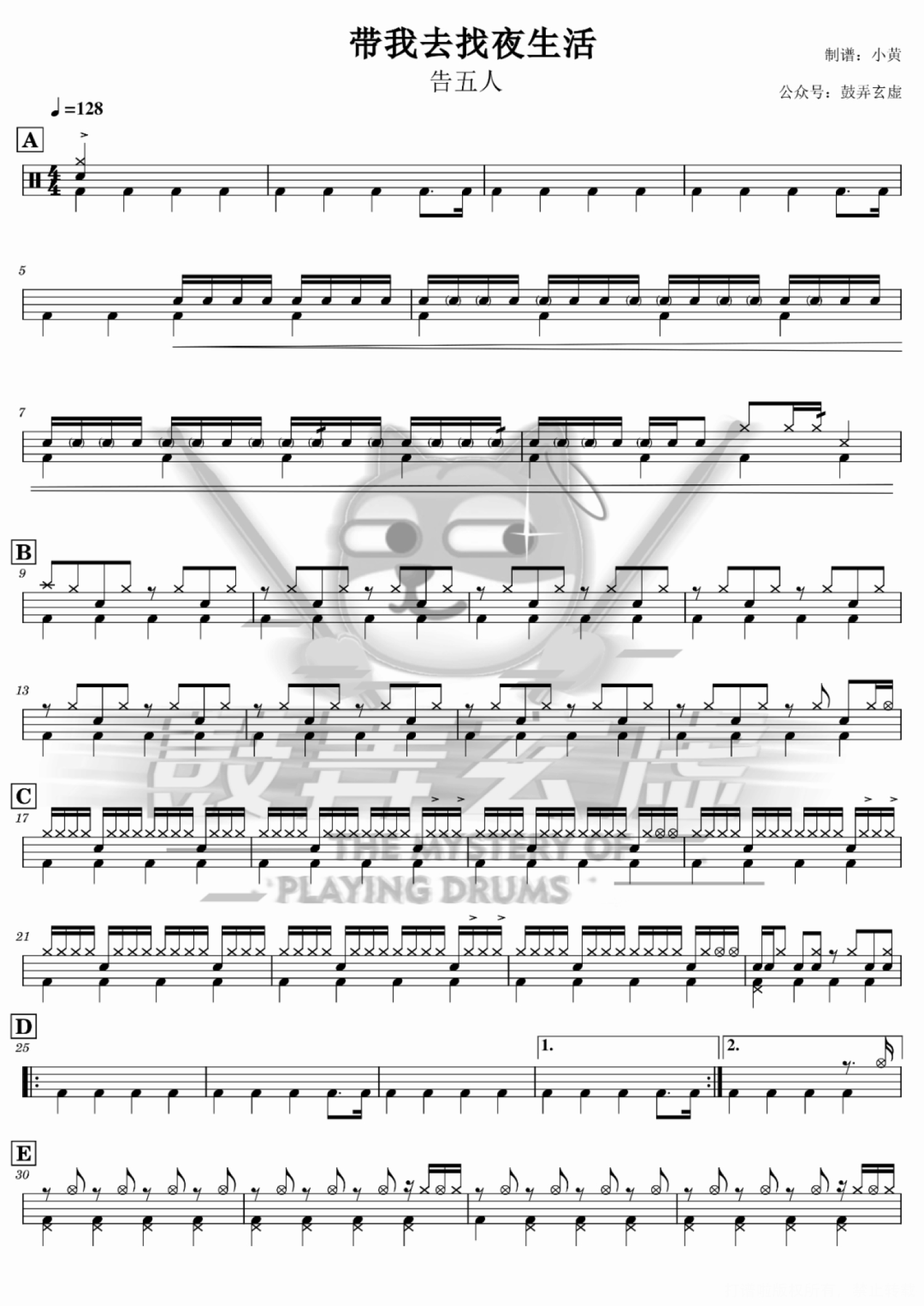 曲谱介绍: 告五人《带我去找夜生活》架子鼓谱,鼓弄玄虚编配出品,共有4张高清图谱。