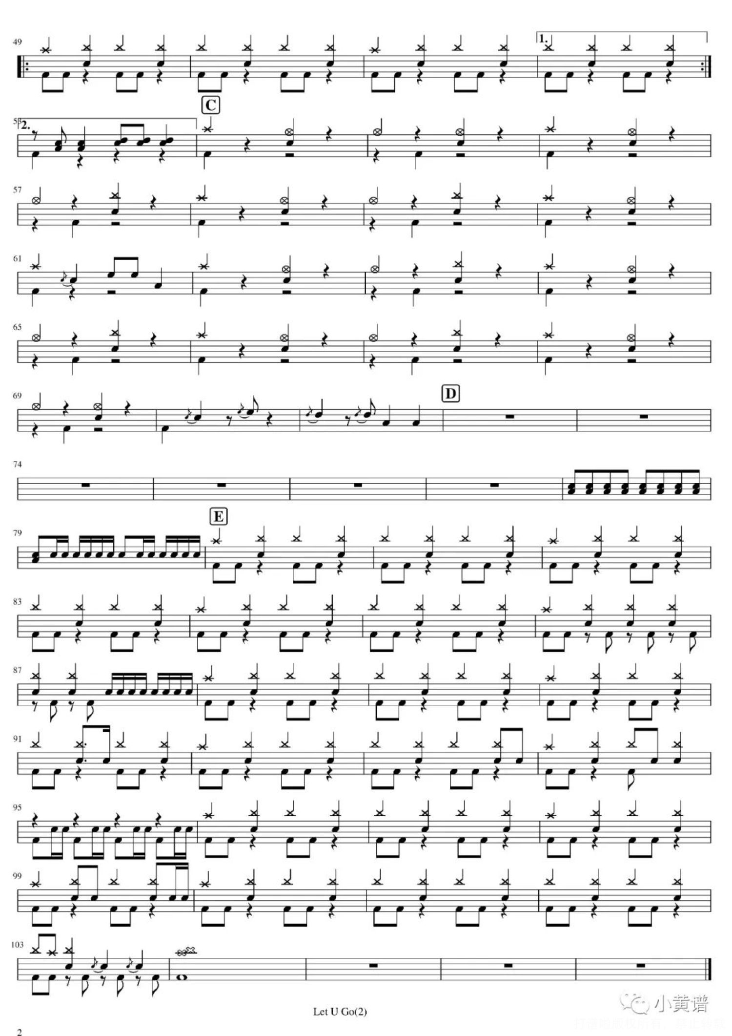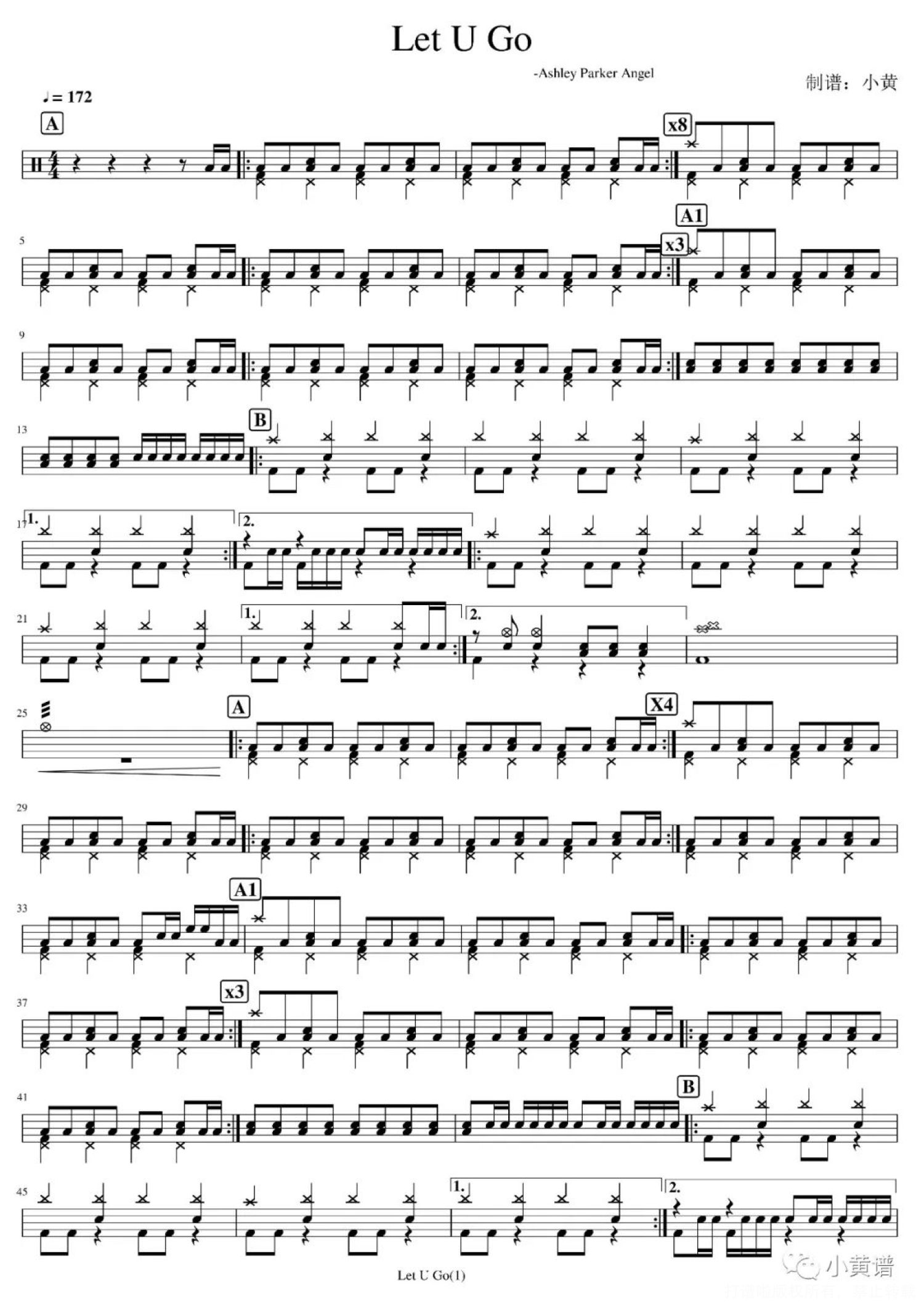 曲谱介绍: AshleyParkerAngel《LetUGo》架子鼓谱,鼓弄玄虚编配出品,共有2张高清图谱,免翻页排版设计。
