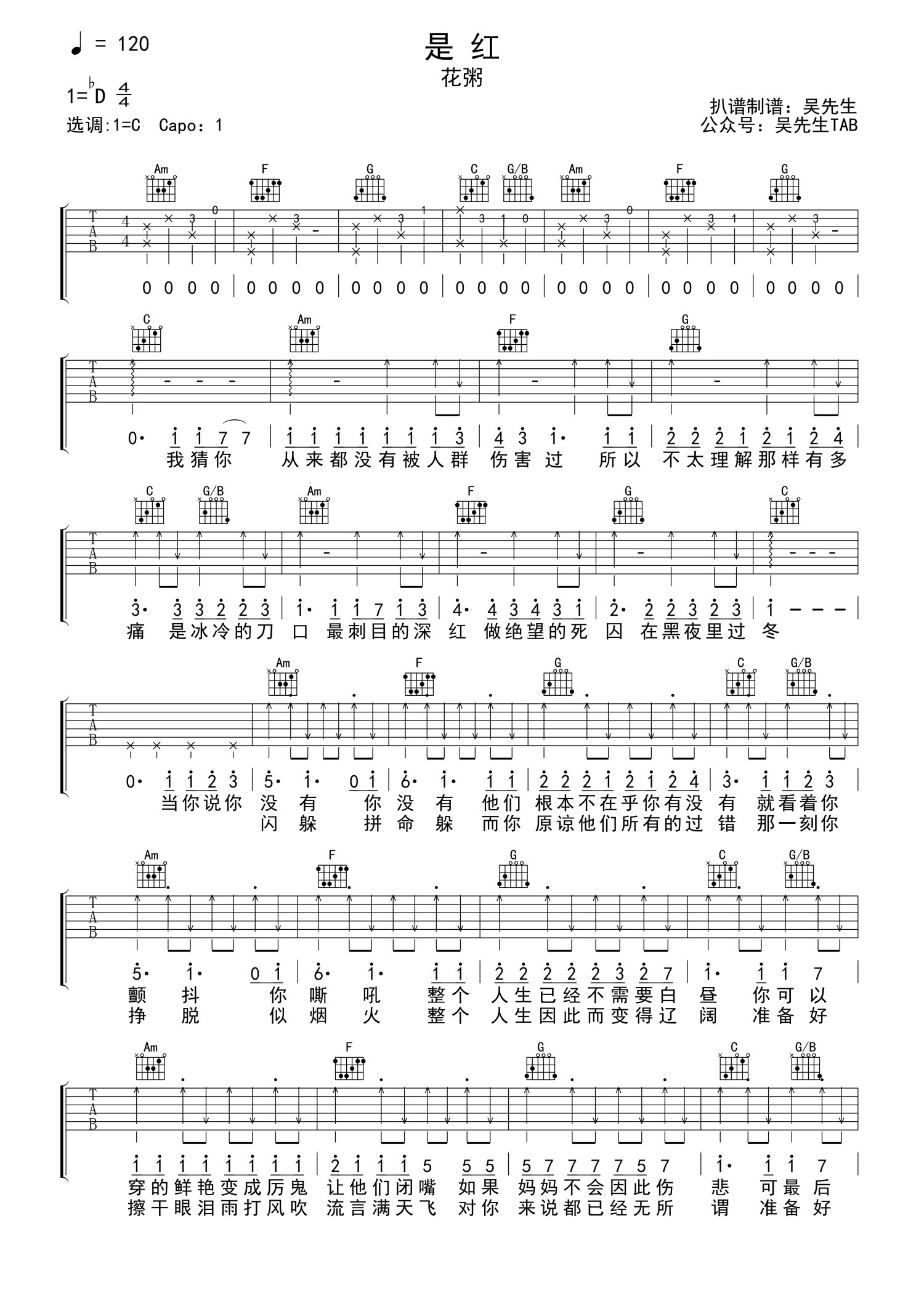 • 是红吉他谱 - 花粥 - C调吉他弹唱谱第1张