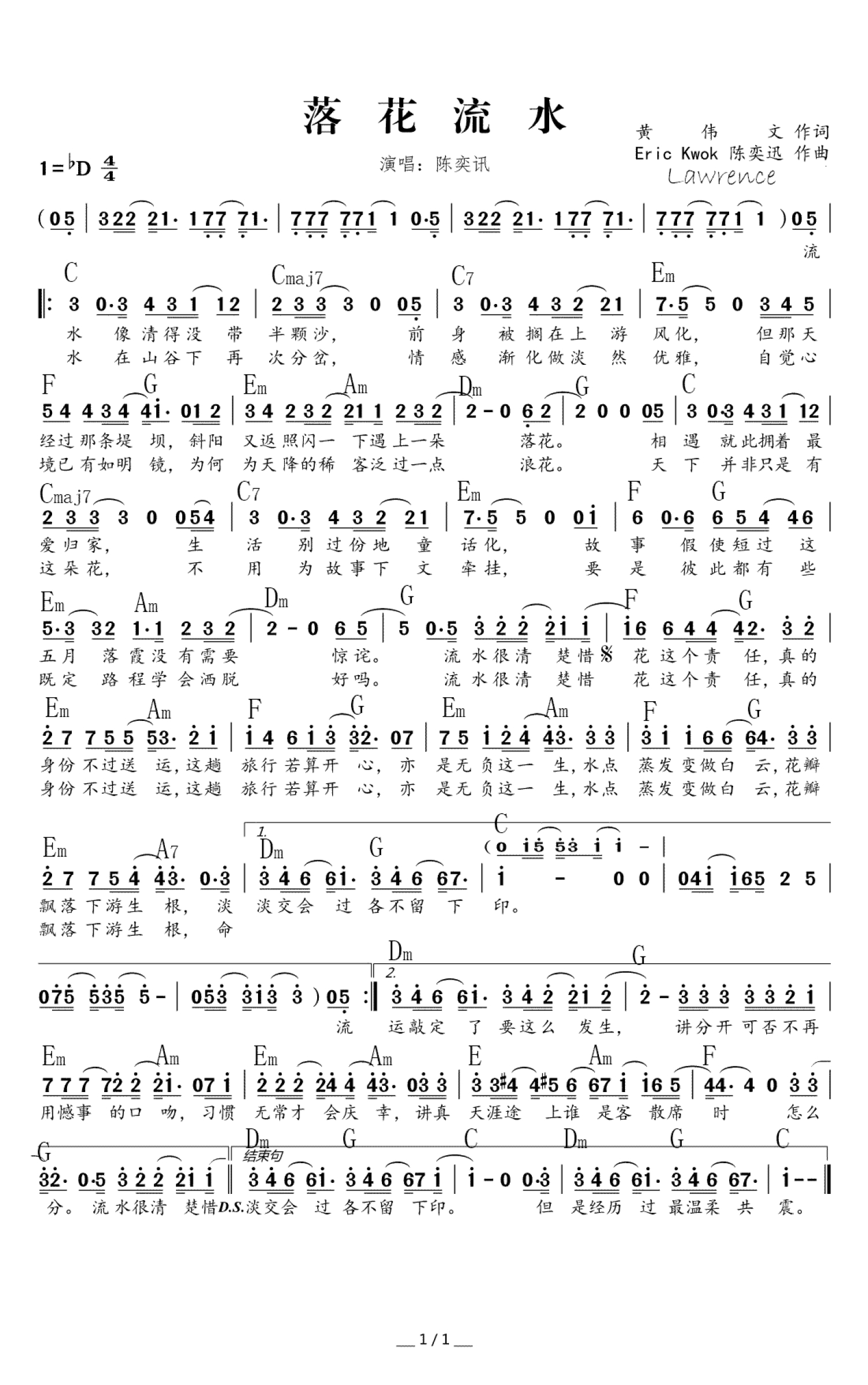 曲谱介绍: 落花流水吉他谱,陈奕迅演唱一首经典粤语歌曲,和弦编配高清图片谱。Eason的声线好适合这种闻者心碎的苦情歌,由黄伟文作词,EricKwok(郭伟亮)作曲,“流水很清楚惜花这个责任,真的身份不过送运,这趟旅行若算开心,亦是无负这一生。”