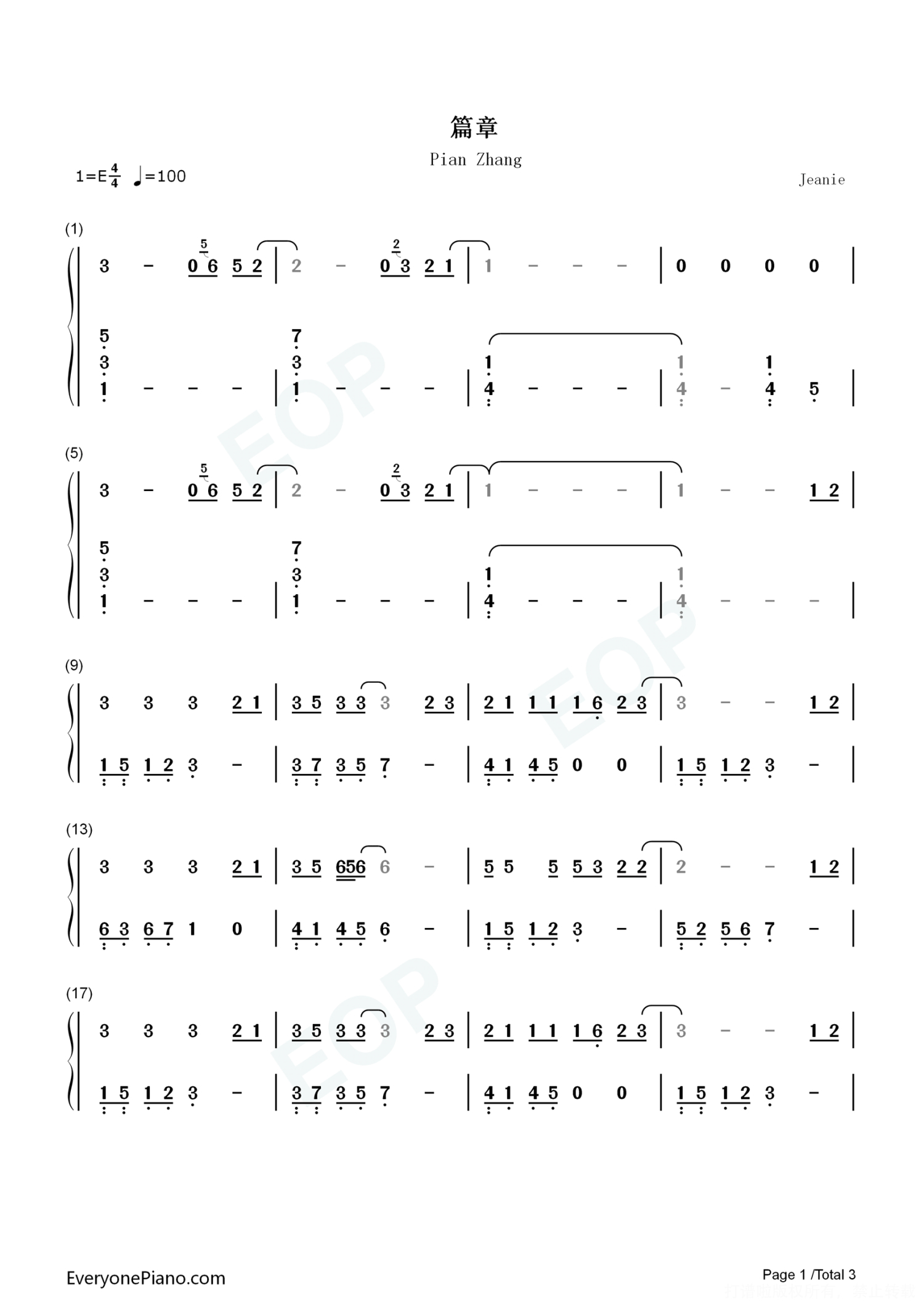 曲谱介绍: 群星《篇章》钢琴谱数字双手,共有3张高清图谱。
