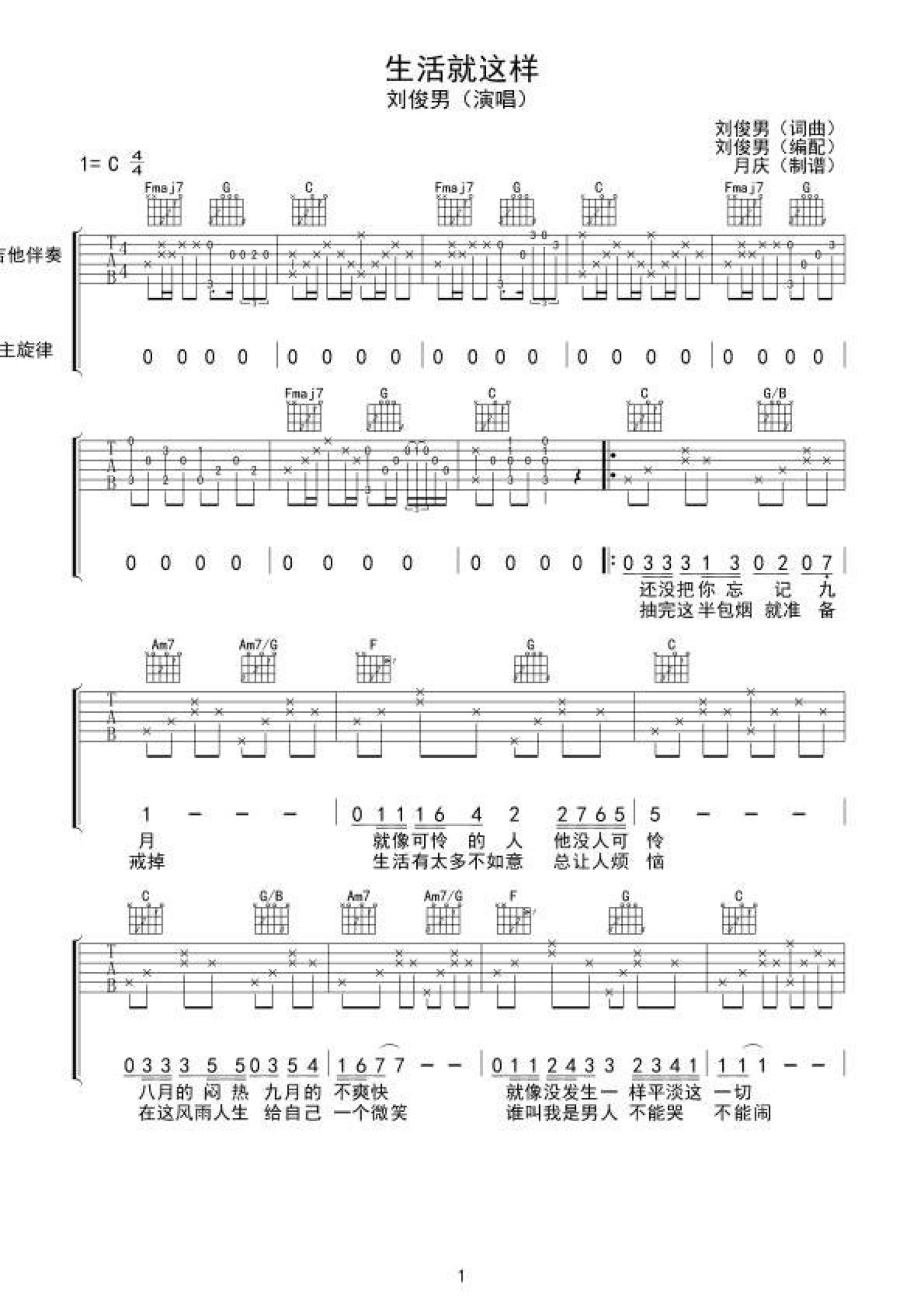 曲谱介绍: 生活就这样吉他谱 刘俊男 吉他谱 月庆制谱