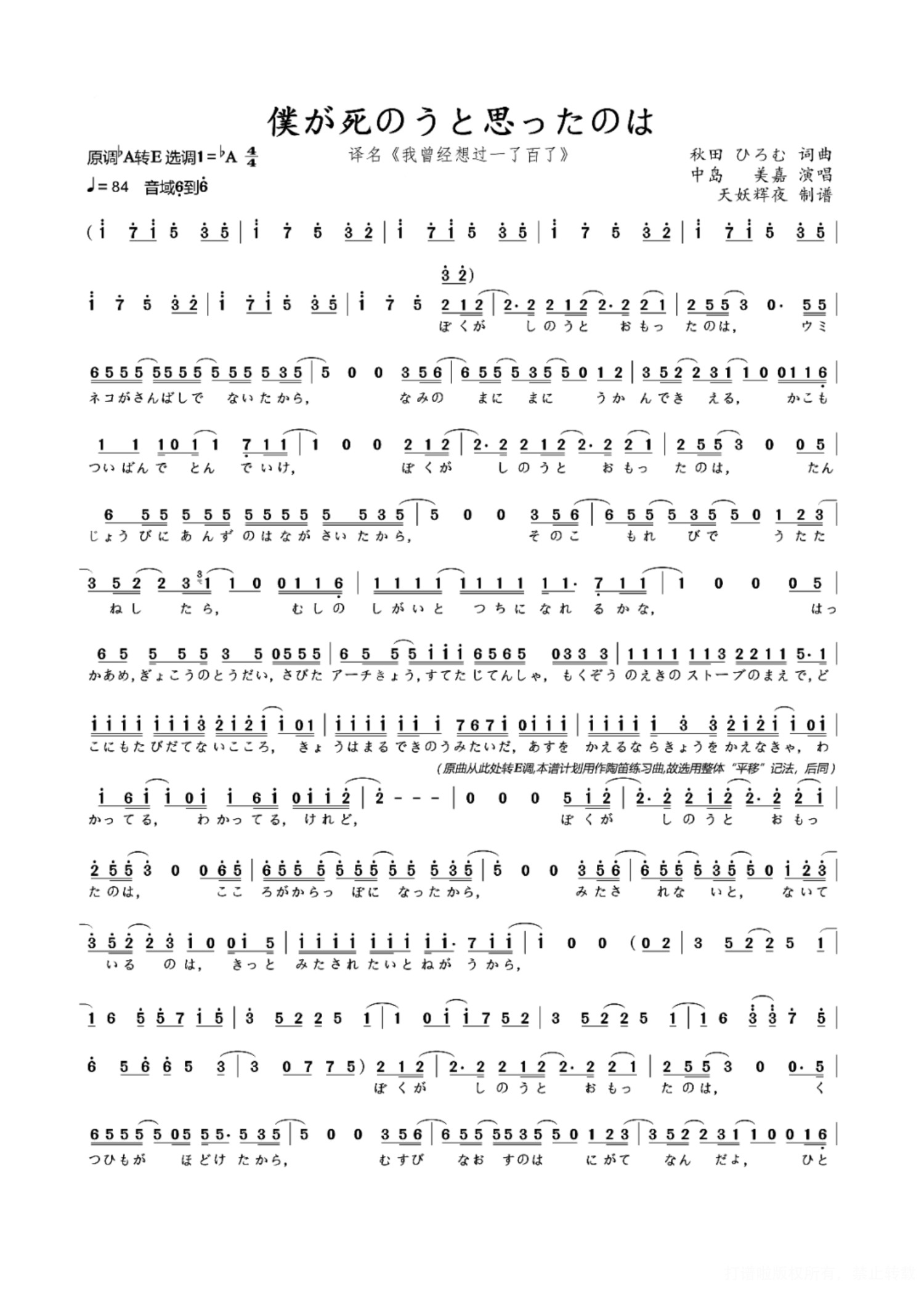 曲谱介绍: 中岛美嘉《曾经我也想过一了百了》简谱,共有2张高清图谱,免翻页排版设计。