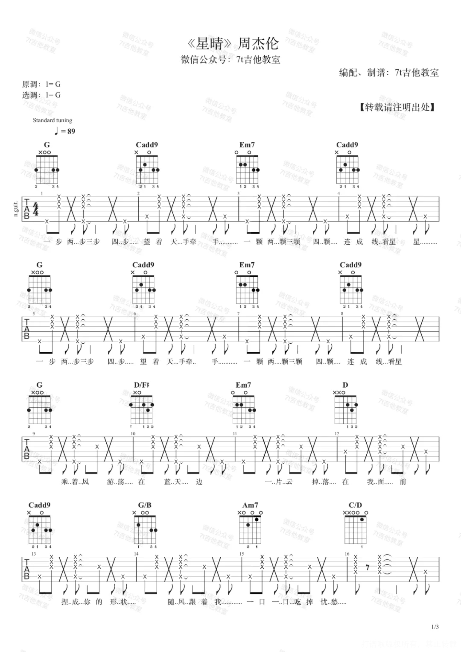 曲谱介绍: 周杰伦《星晴》吉他弹唱谱,7T吉他教室编配出品,共有3张高清图谱。