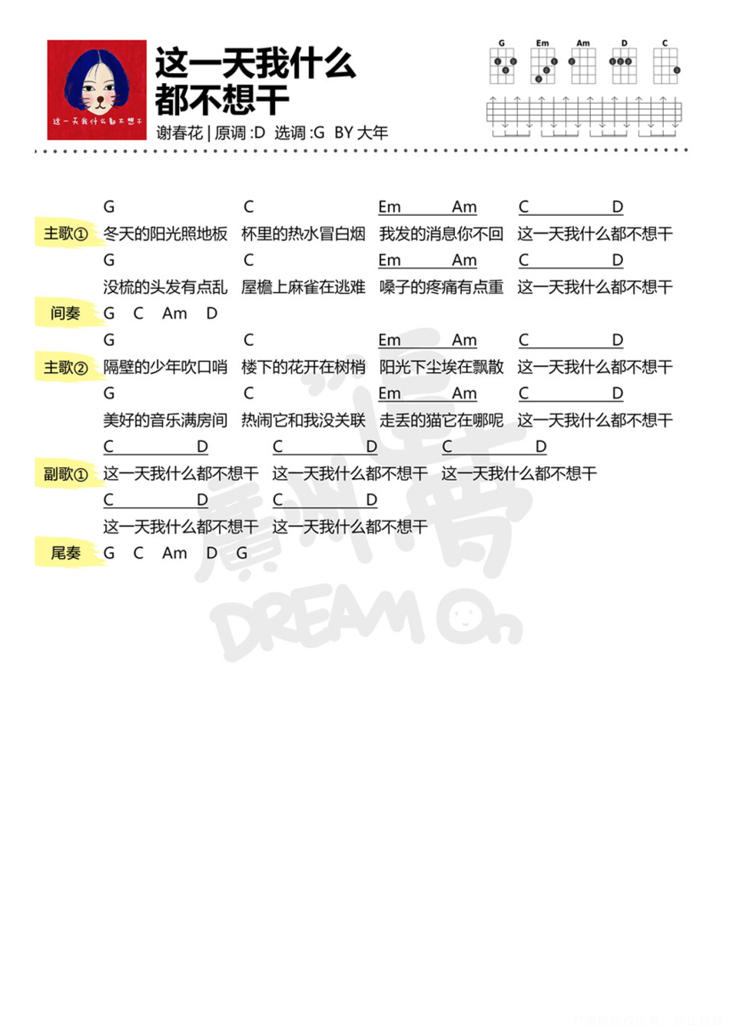 曲谱介绍: 谢春花《这一天我什么都不想干》尤克里里谱 G调尤克里里弹唱谱