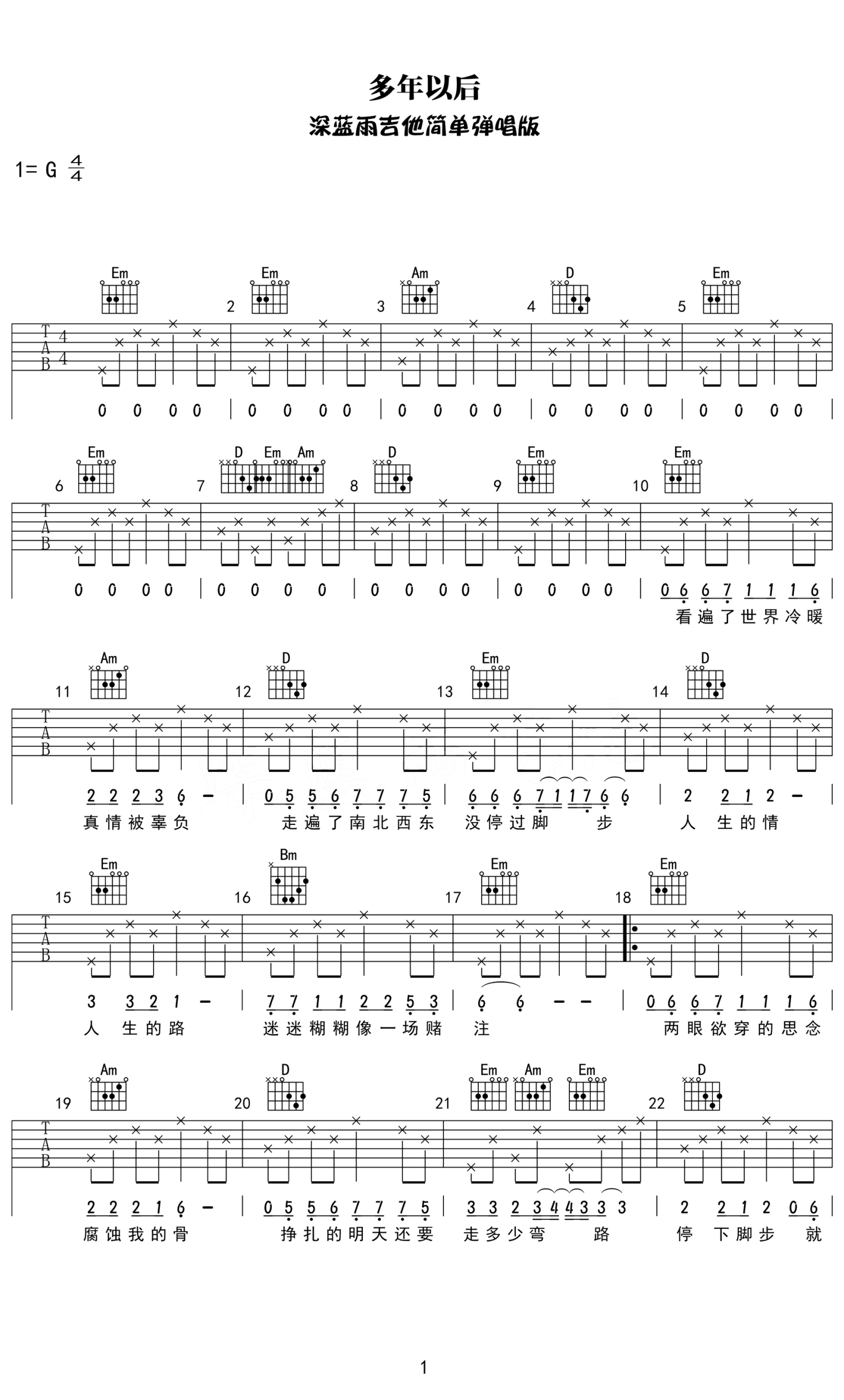 多年以后吉他谱 - 大欢 - G调吉他弹唱谱 - 简单版