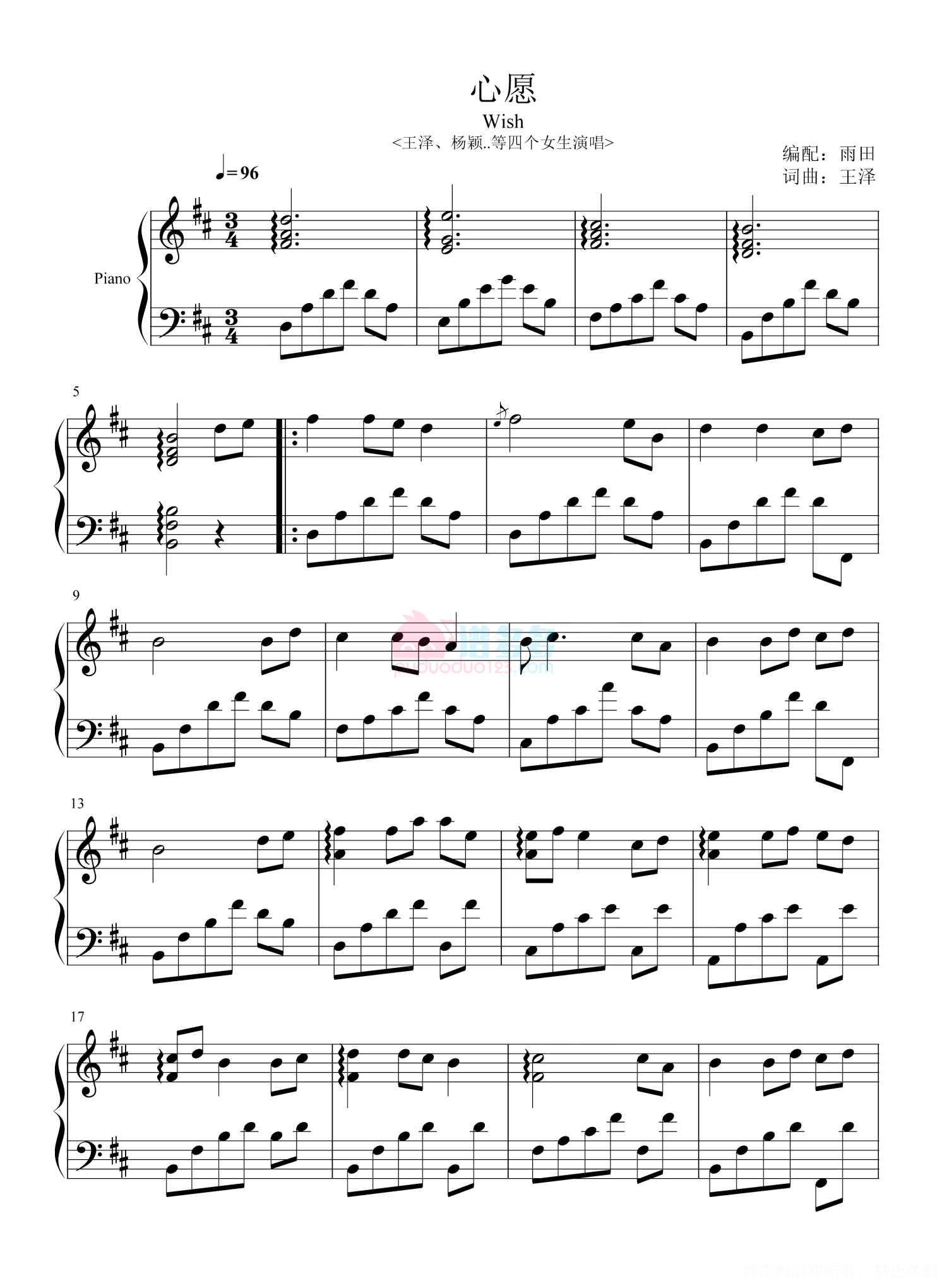曲谱介绍: 《心愿》(又名《曾经的那些》)是1994年秋由王泽作词曲,1996年夏由王泽、杨颖、乔媛、唐景莲演唱的校园风歌曲,因曲风轻盈而含有一丝淡淡的忧伤而得以广为传唱。 这首歌是王泽94年写的,当时她才16岁,其他三人也不过18。这张照片是王泽曾经贴在校园民谣网上的,为了介绍和她一起唱歌的几个女孩,因为很多地方网站转载没有写全她们的名字。98年底中央电视台12演播室给王泽拍摄一个短采访时候,她又约了她们来拍摄,在中央民族大学的一间教室里拍了这个照片。 如今四个女生早已各奔东西,但是这首歌留给我们的感动,永远不会离去,因为,《心愿》是我们的青春。
