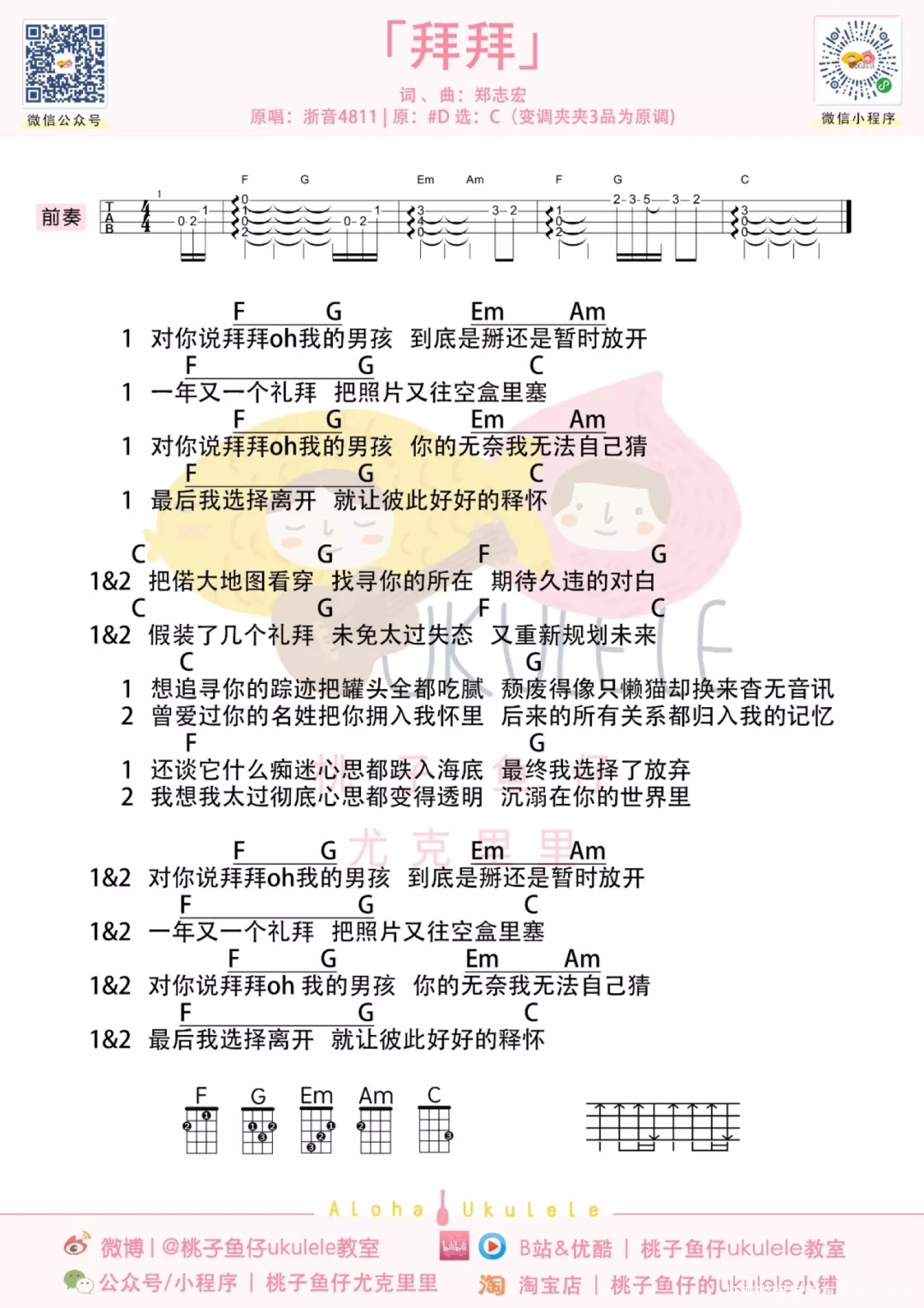 曲谱介绍: 《拜拜》ukulele弹唱谱-浙音4811