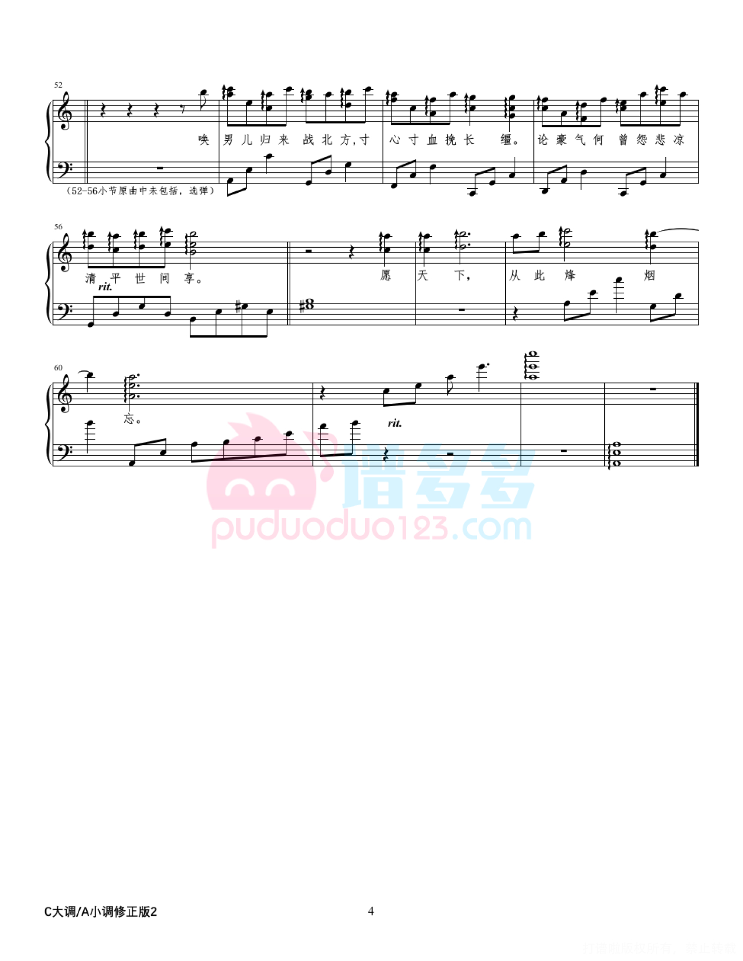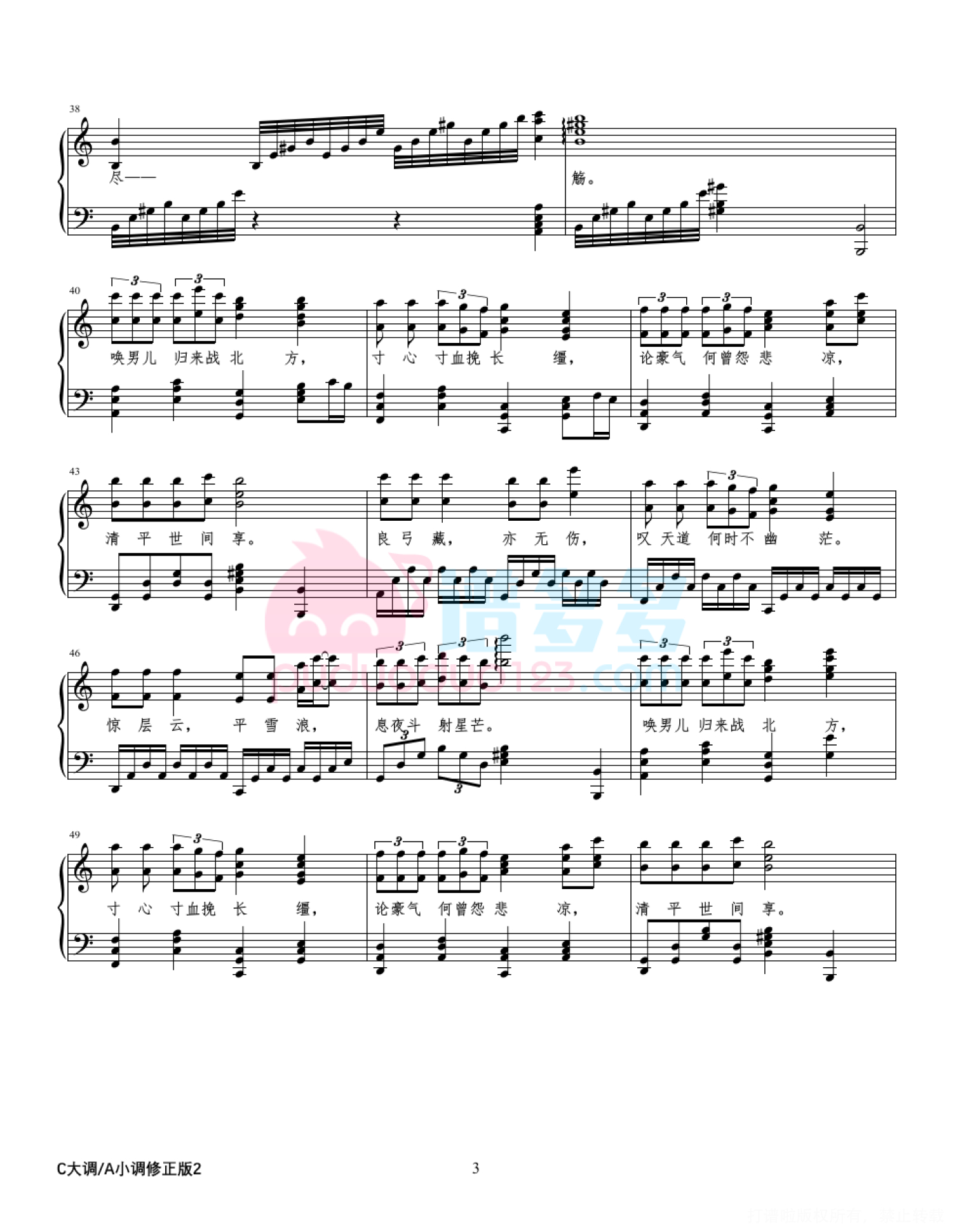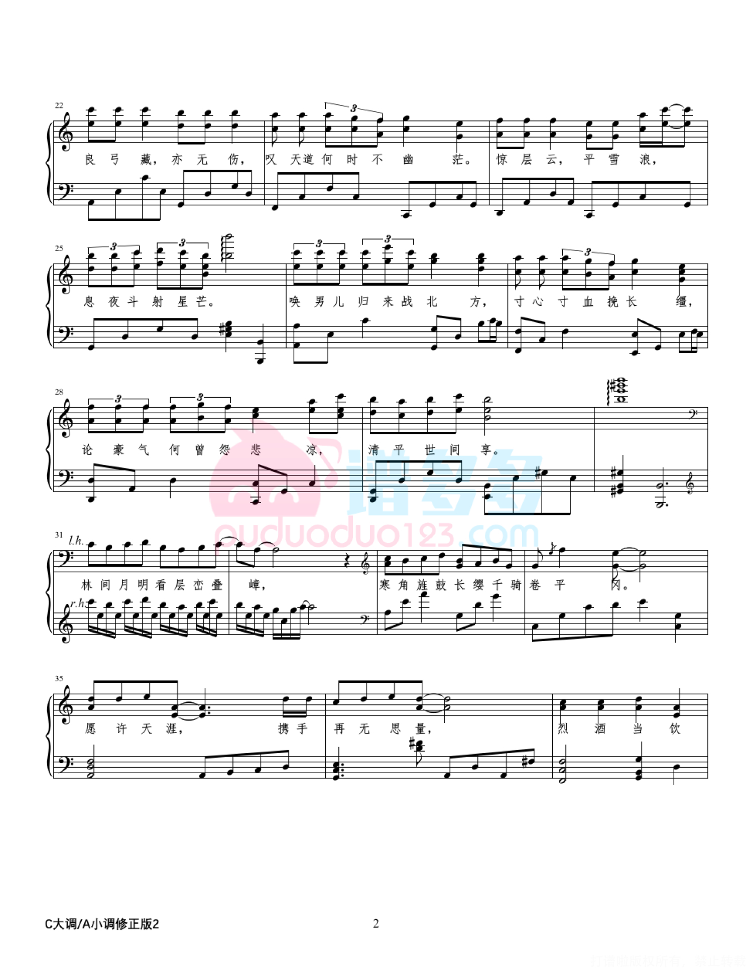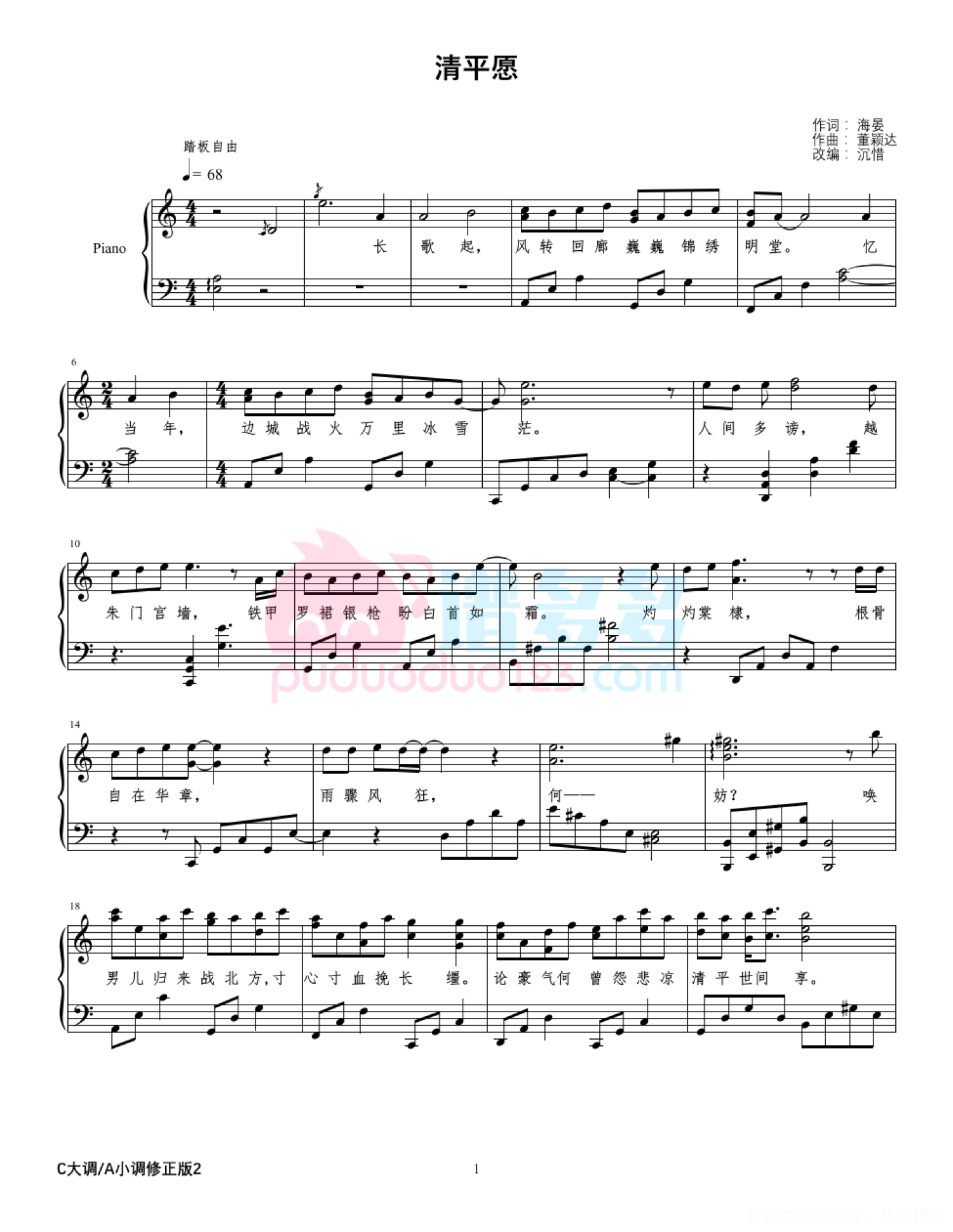 曲谱介绍: 本曲谱是《琅琊榜2之风起长林》主题曲《清平愿》钢琴谱的C大调/A小调修正版。《清平愿》作词:海晏,作曲:董颖达,演唱(奏):黄绮珊、多亮,曲谱改编:沉惜。 弹奏提示:高潮右手部分可根据喜好选择八度或者六度和弦,希望大家喜欢。