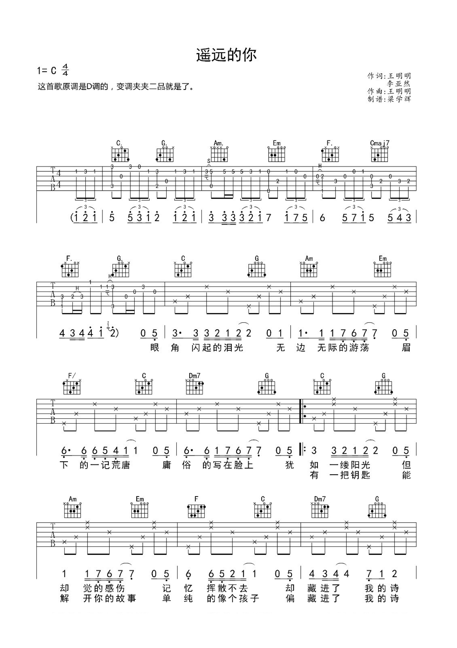 曲谱介绍: 这首陈曦《遥远的你》吉他弹唱谱,谱子是 C 调图片吉他谱,原调为 D 调,吉他谱调为 C 调指法,节拍为 4/4 拍,弹唱的时候可以使用变调夹夹二品。