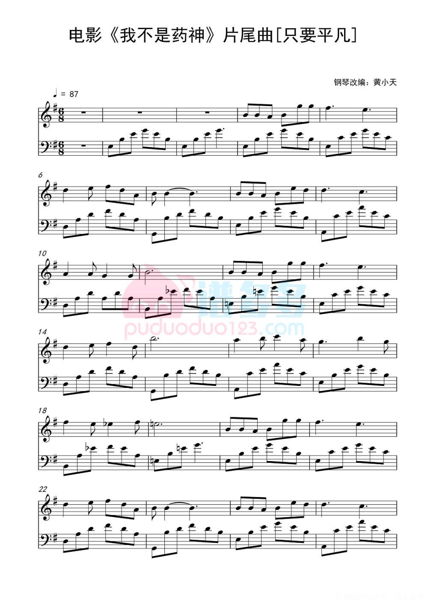 曲谱介绍: 由文牧野导演,宁浩监制,徐峥监制并领衔主演的电影《我不是药神》发布了电影主题曲《只要平凡》。歌曲由实力唱将张杰、张碧晨倾情献唱,作词人格格,作曲则来自影片OST创作者黄超。 《只要平凡》剥下了嬉笑怒骂的诙谐外壳,直指柔软而慈悲的内心世界。